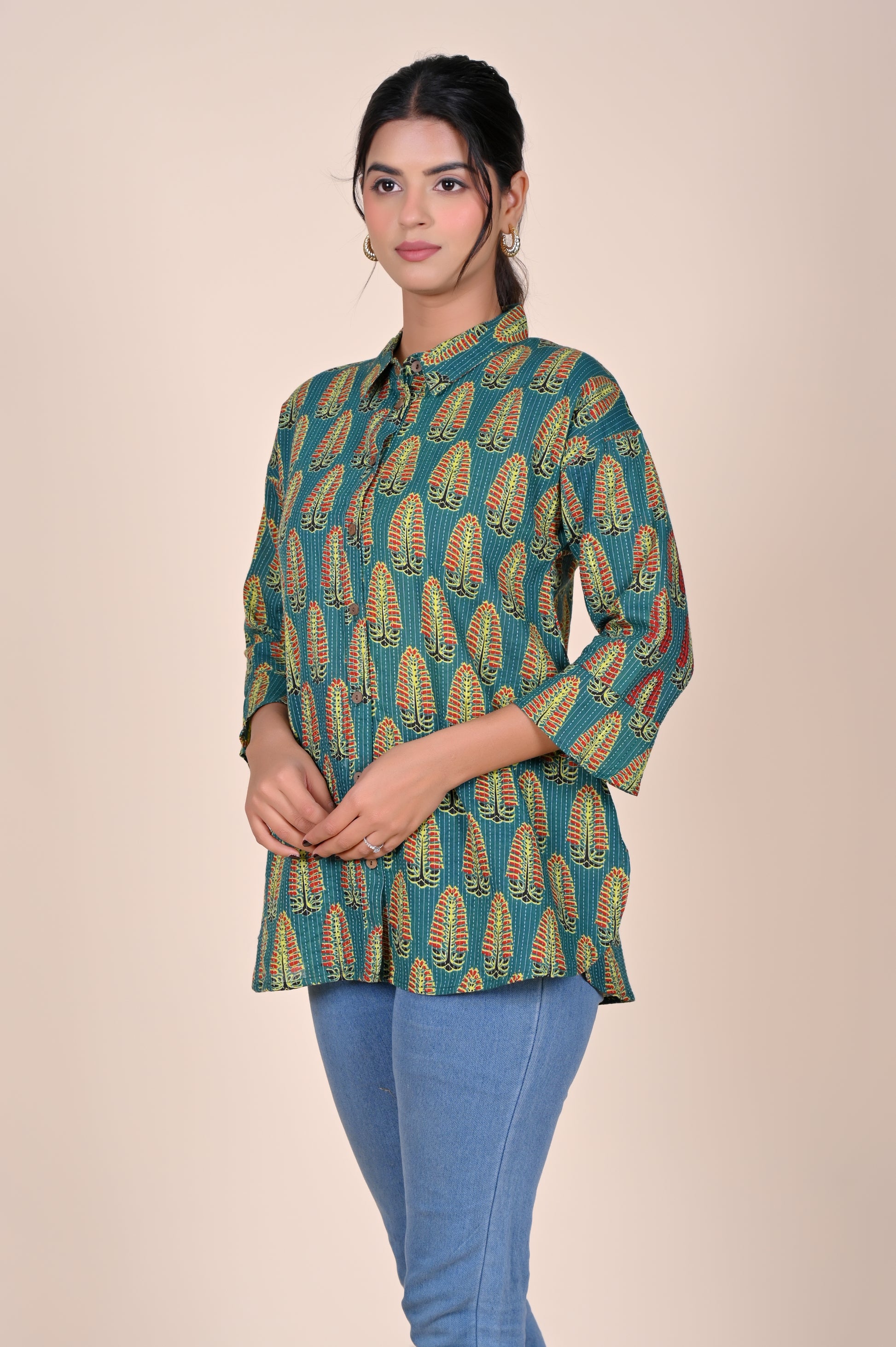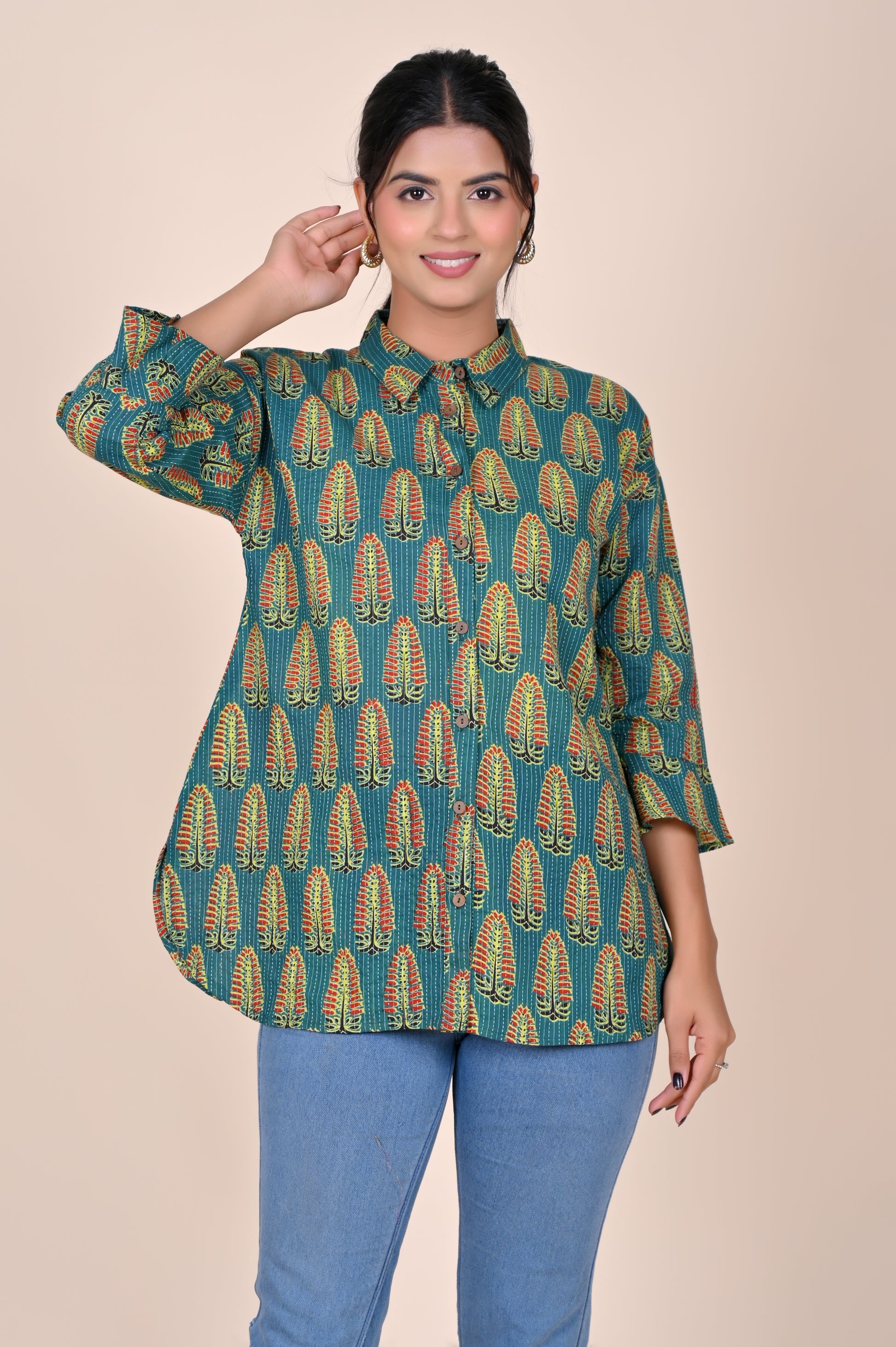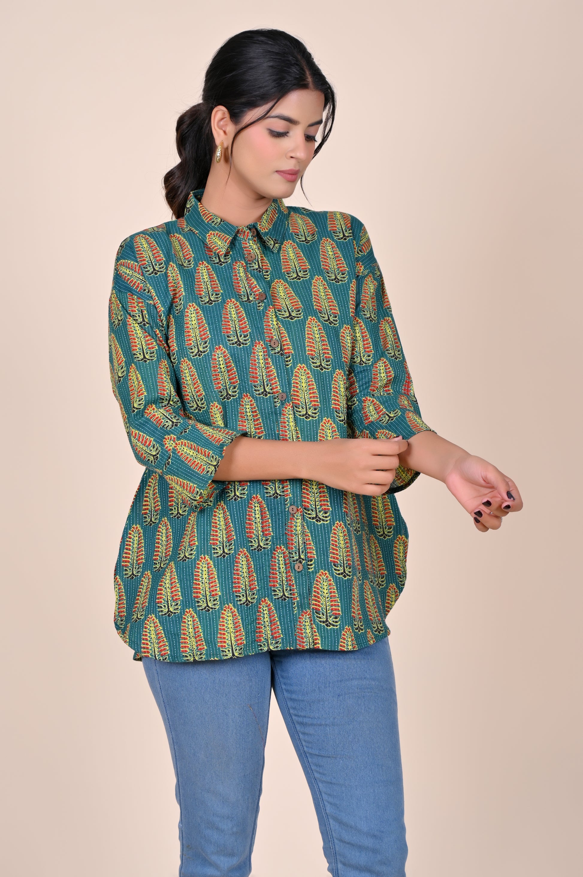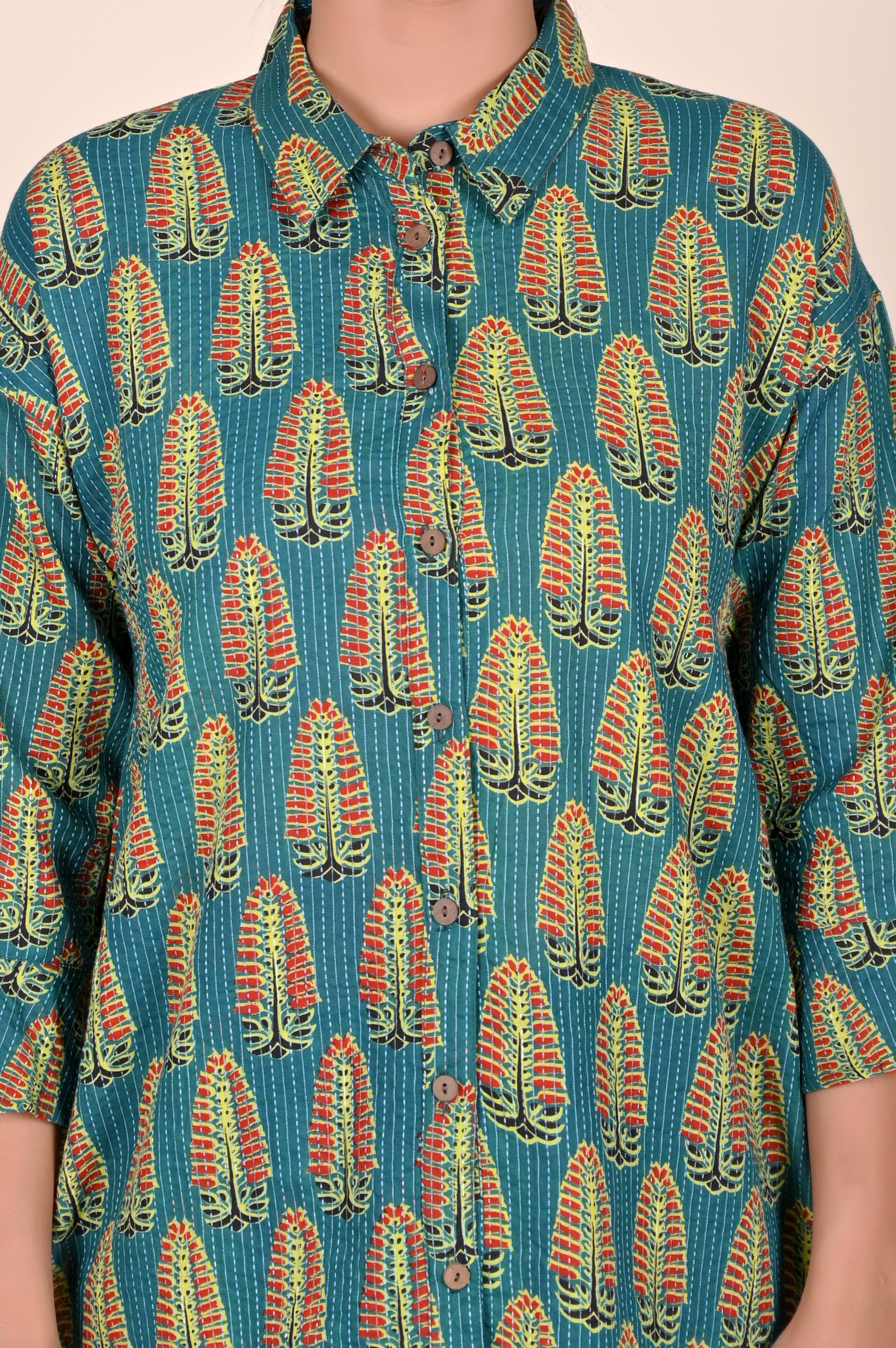 Women's Katha Work Pure Cotton Shirt – Teal Leaf Buti Design