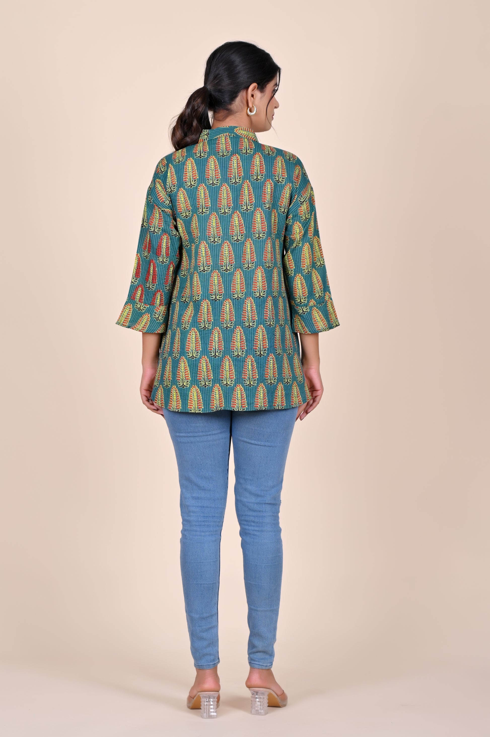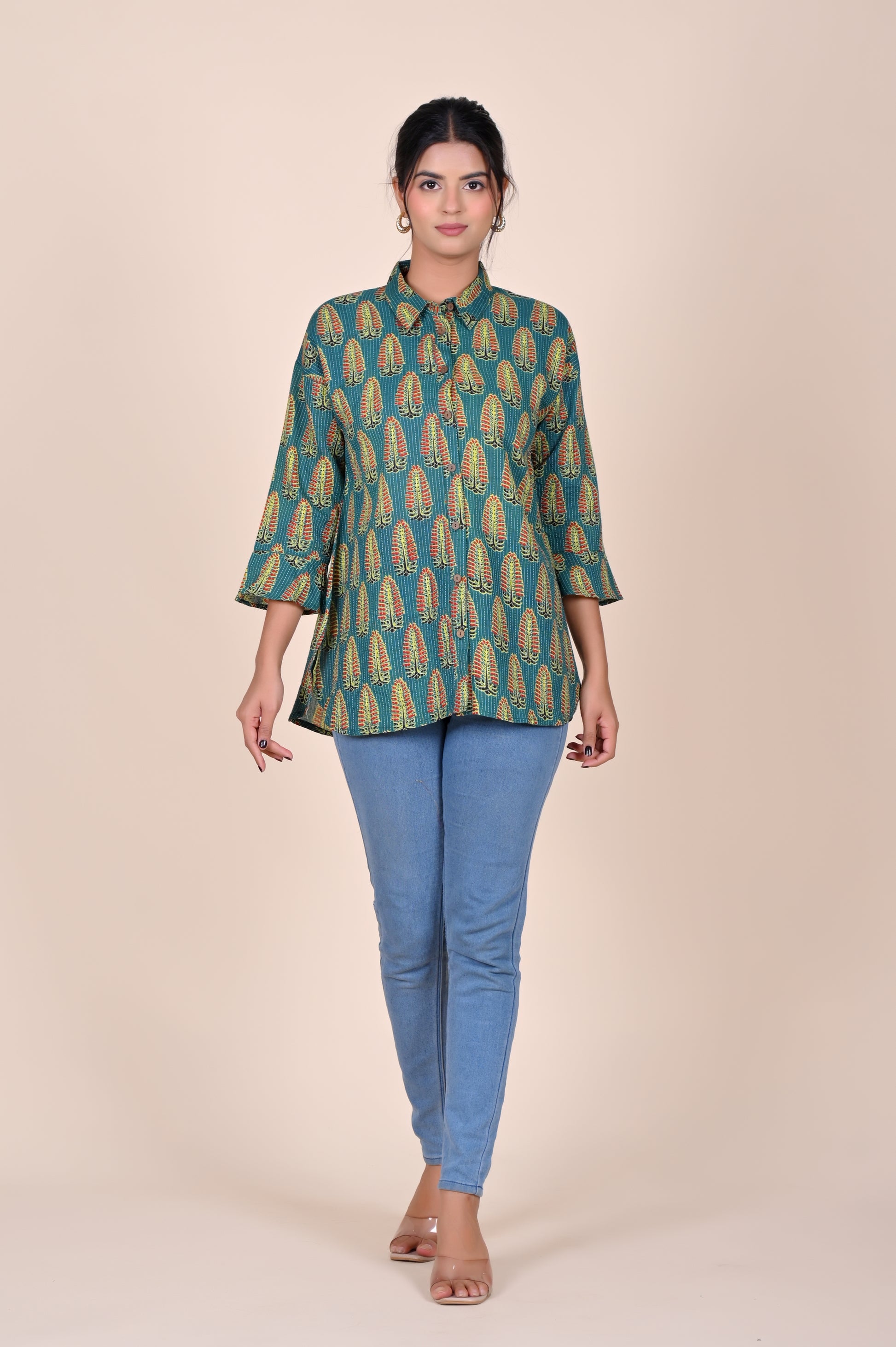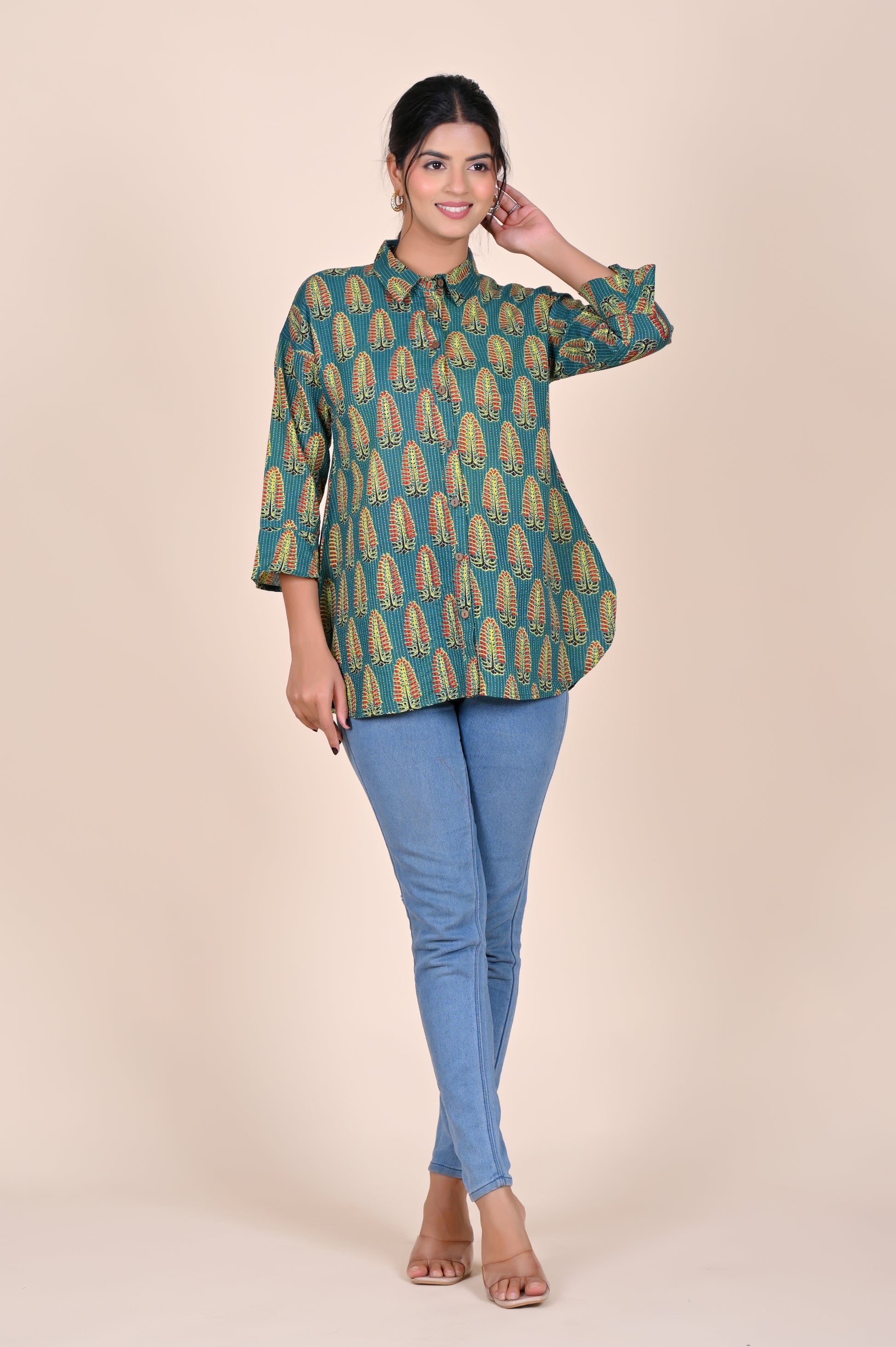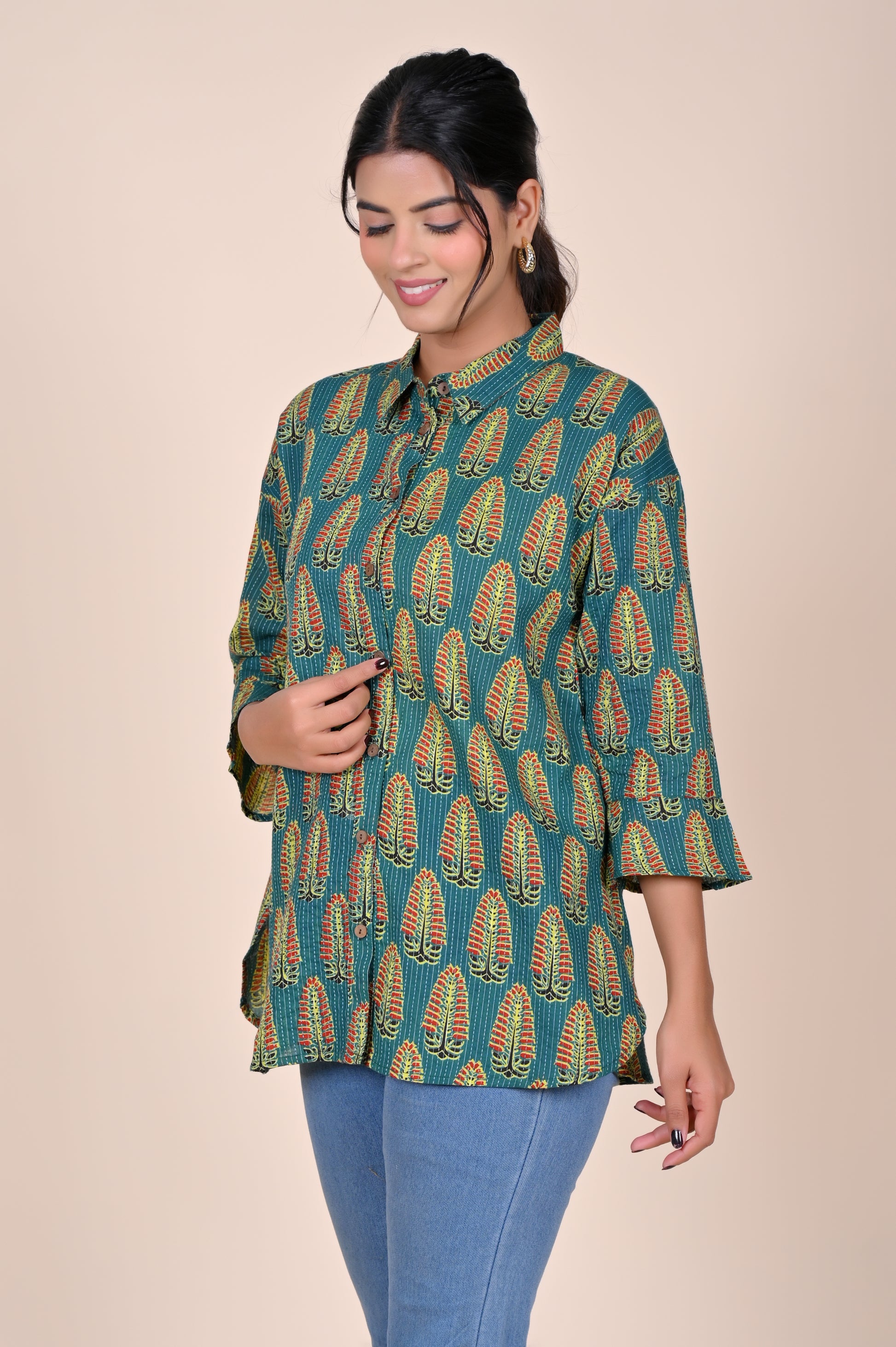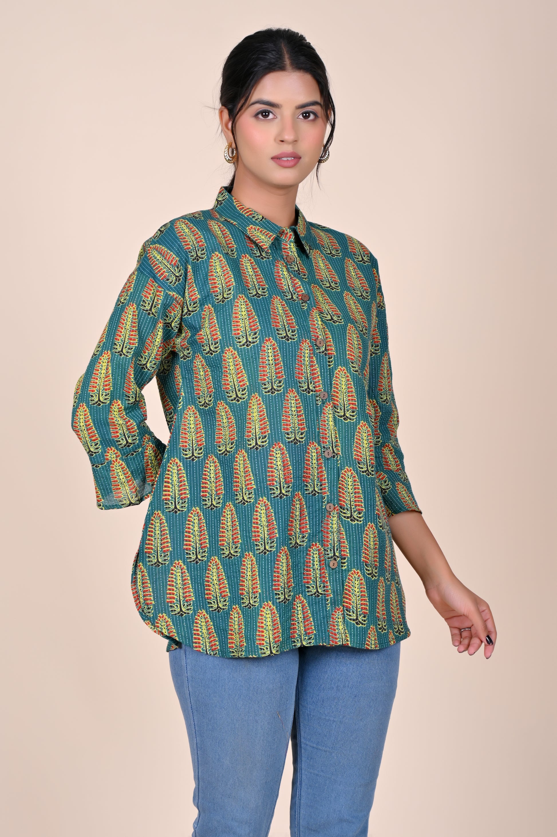 Women's Katha Work Pure Cotton Shirt – Teal Leaf Buti Design