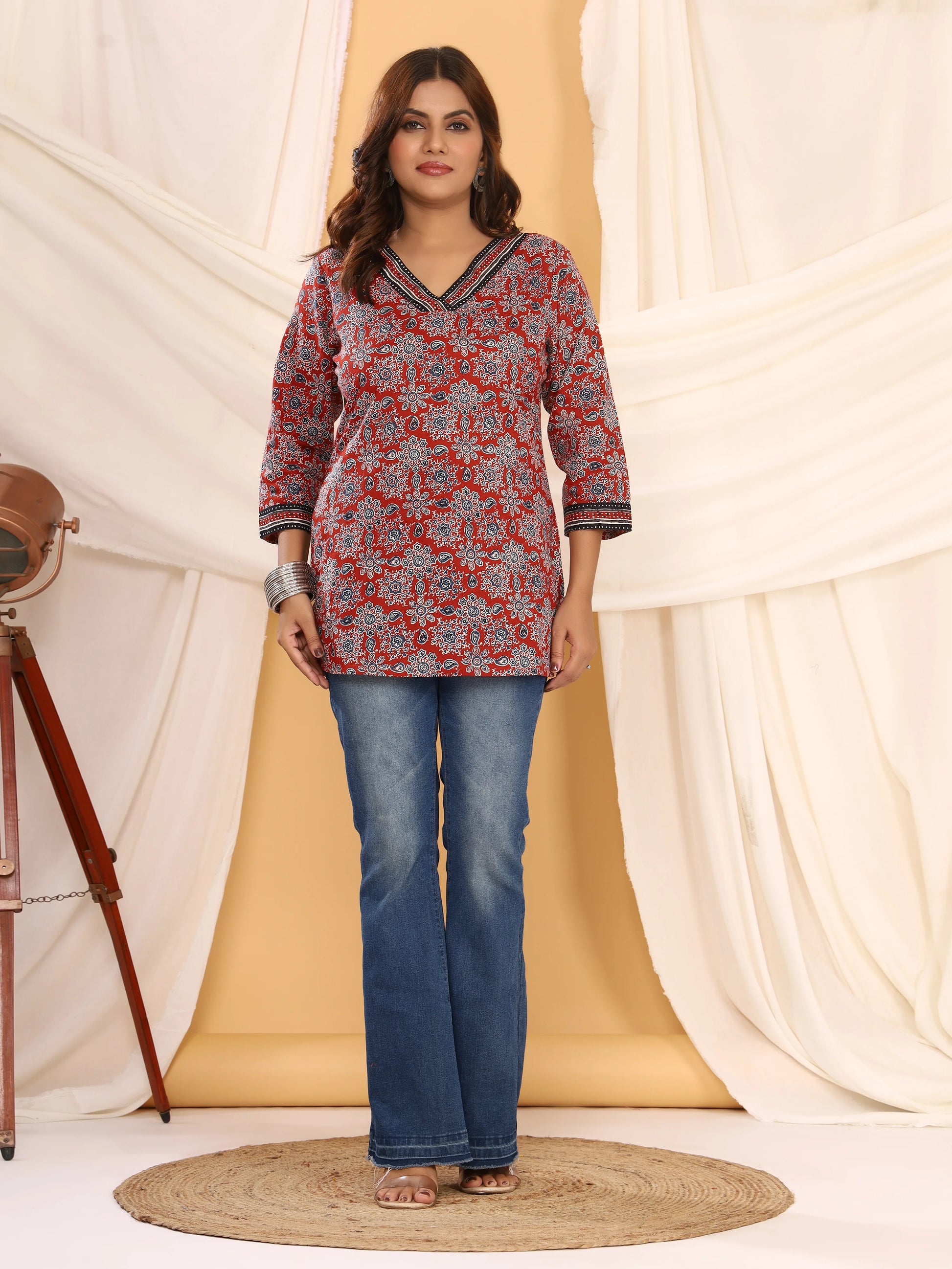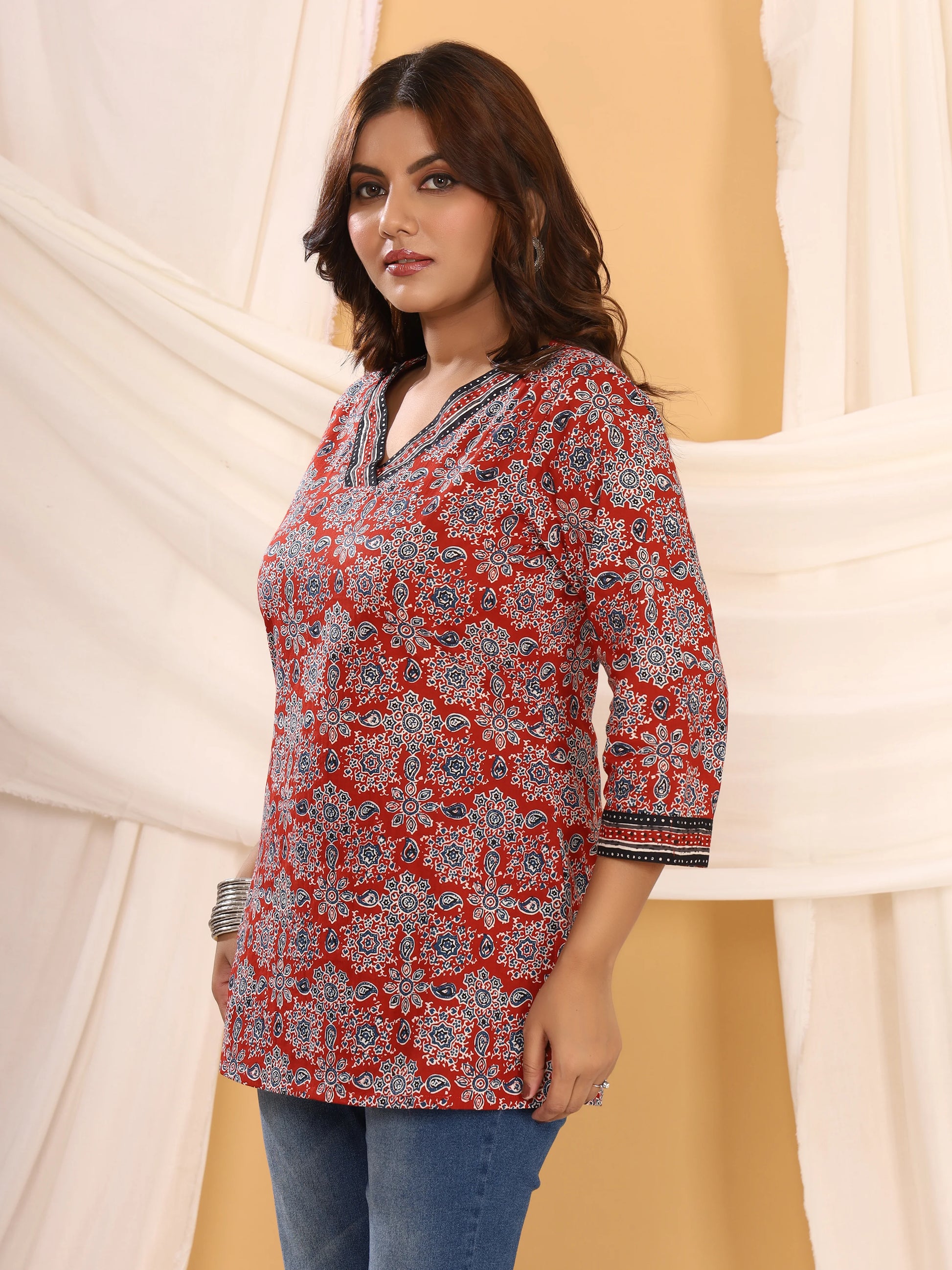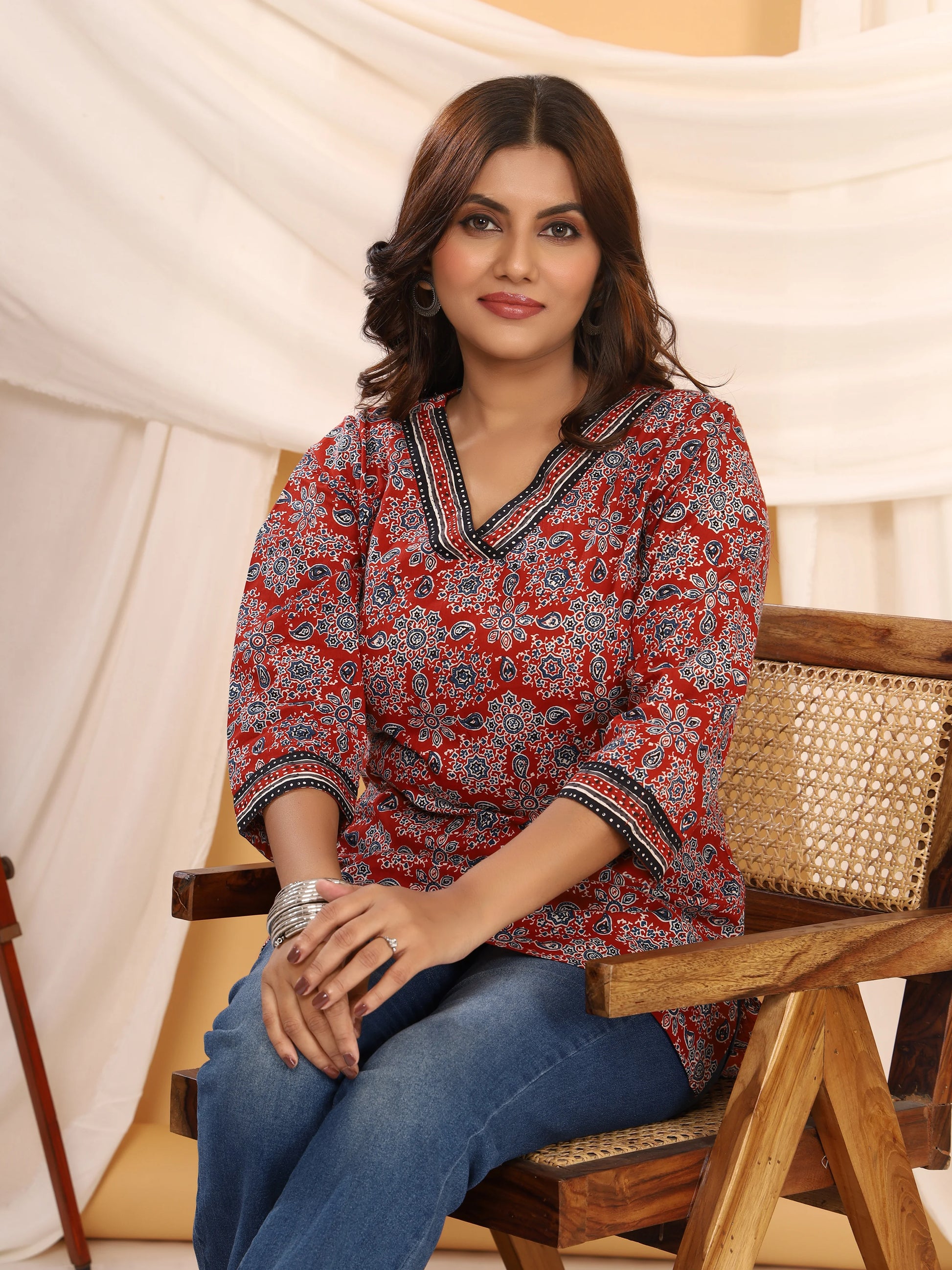 Ajrakh Red & Navy Geometric Print Pure Cotton Top