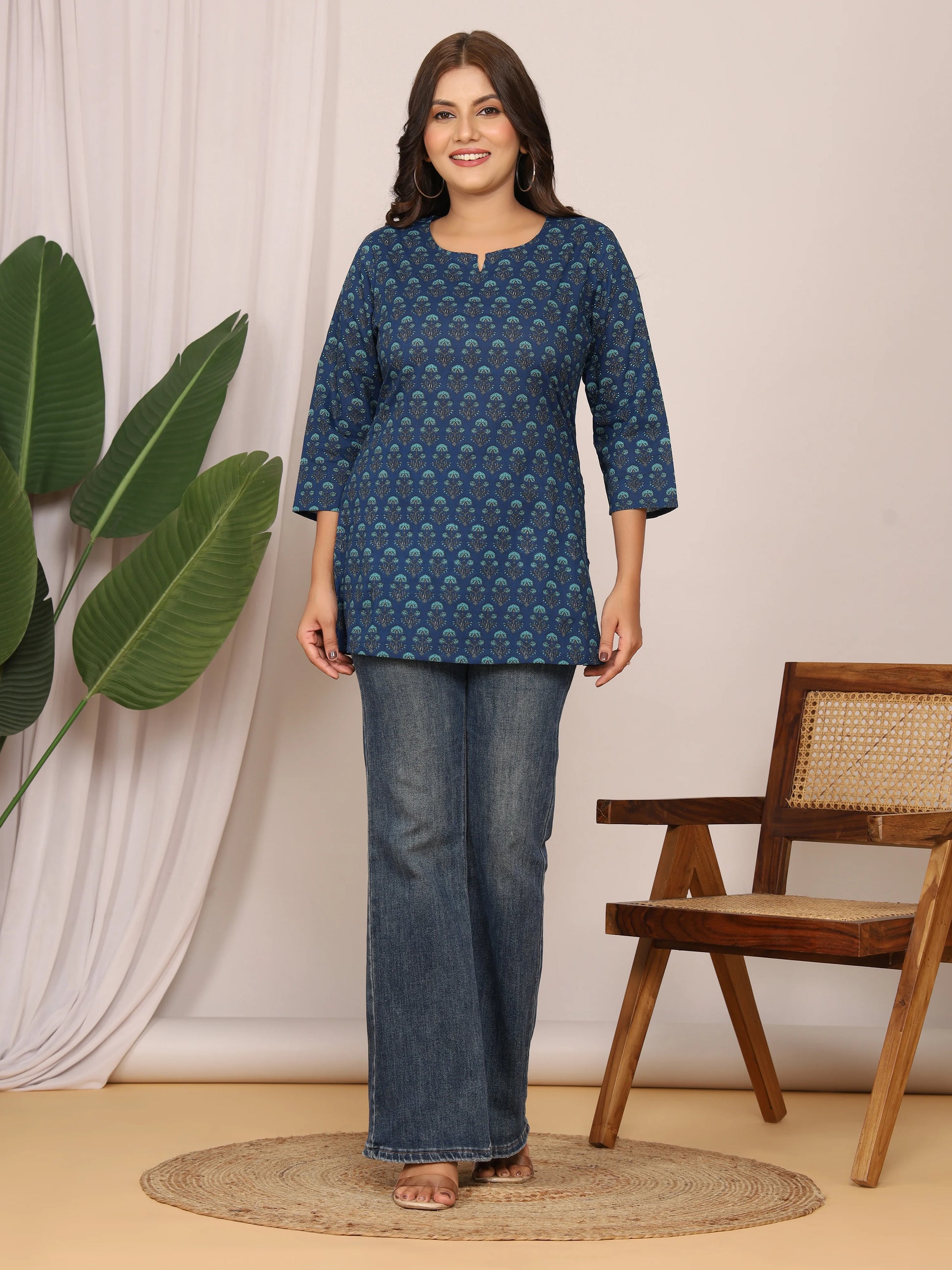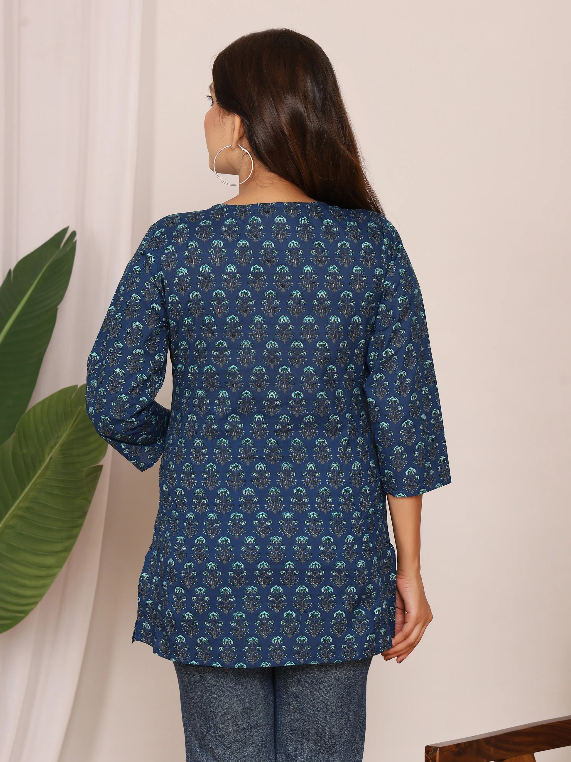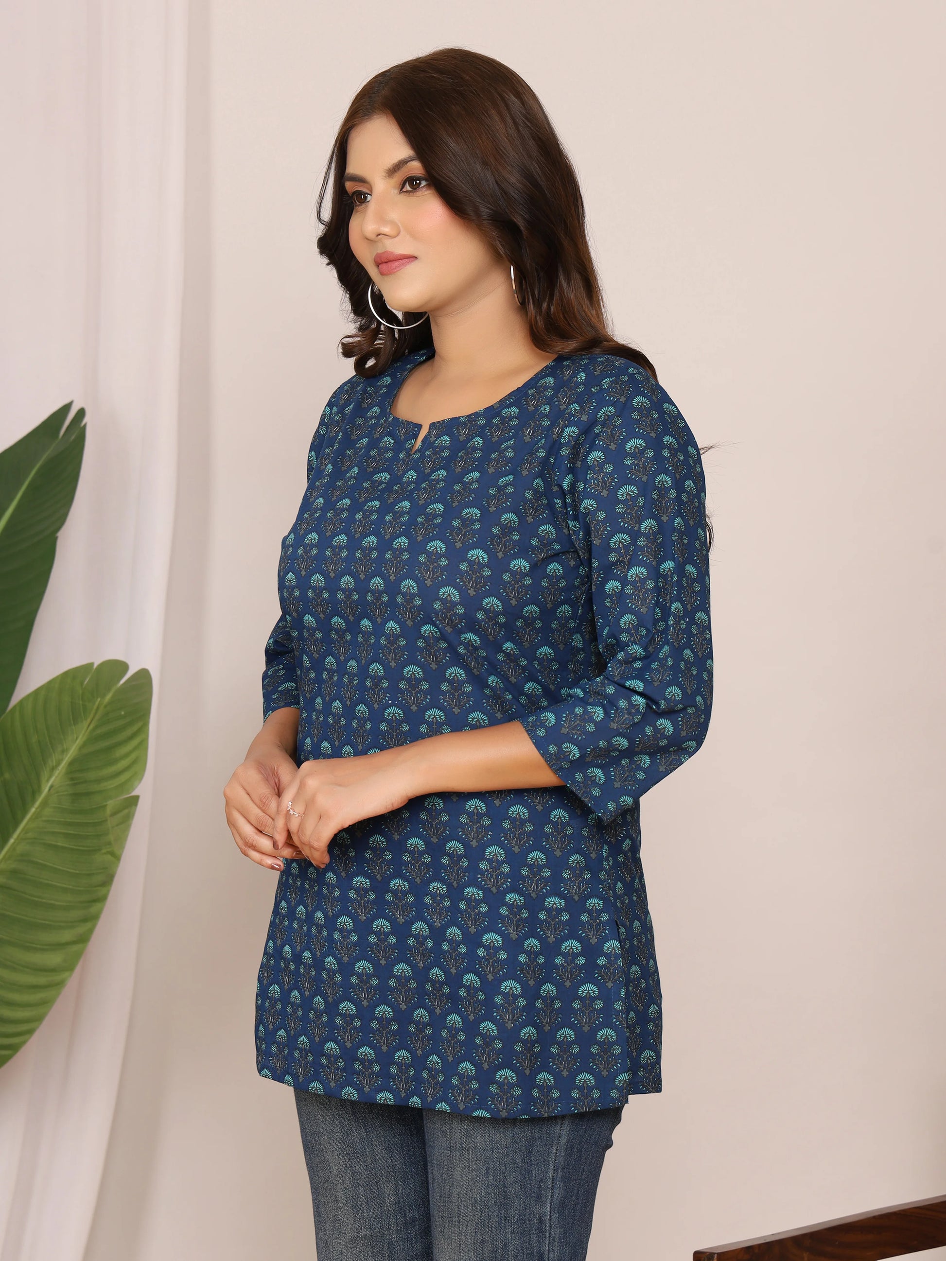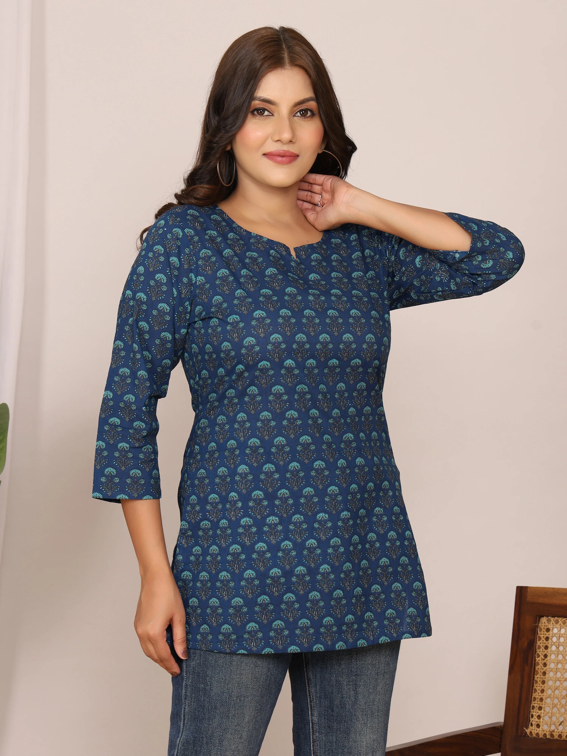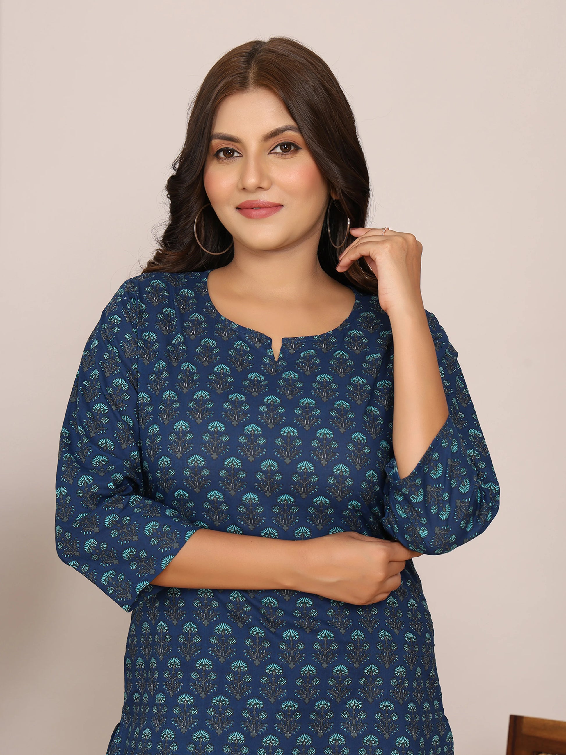 A timeless beauty in navy, this cotton top features an elegant all-over Sanganeri buti print in shades of teal and light blue, blending tradition with minimal sophistication. The classic round neckline with a subtle notch adds finesse to the silhouette, making it ideal for both work and weekend wear.