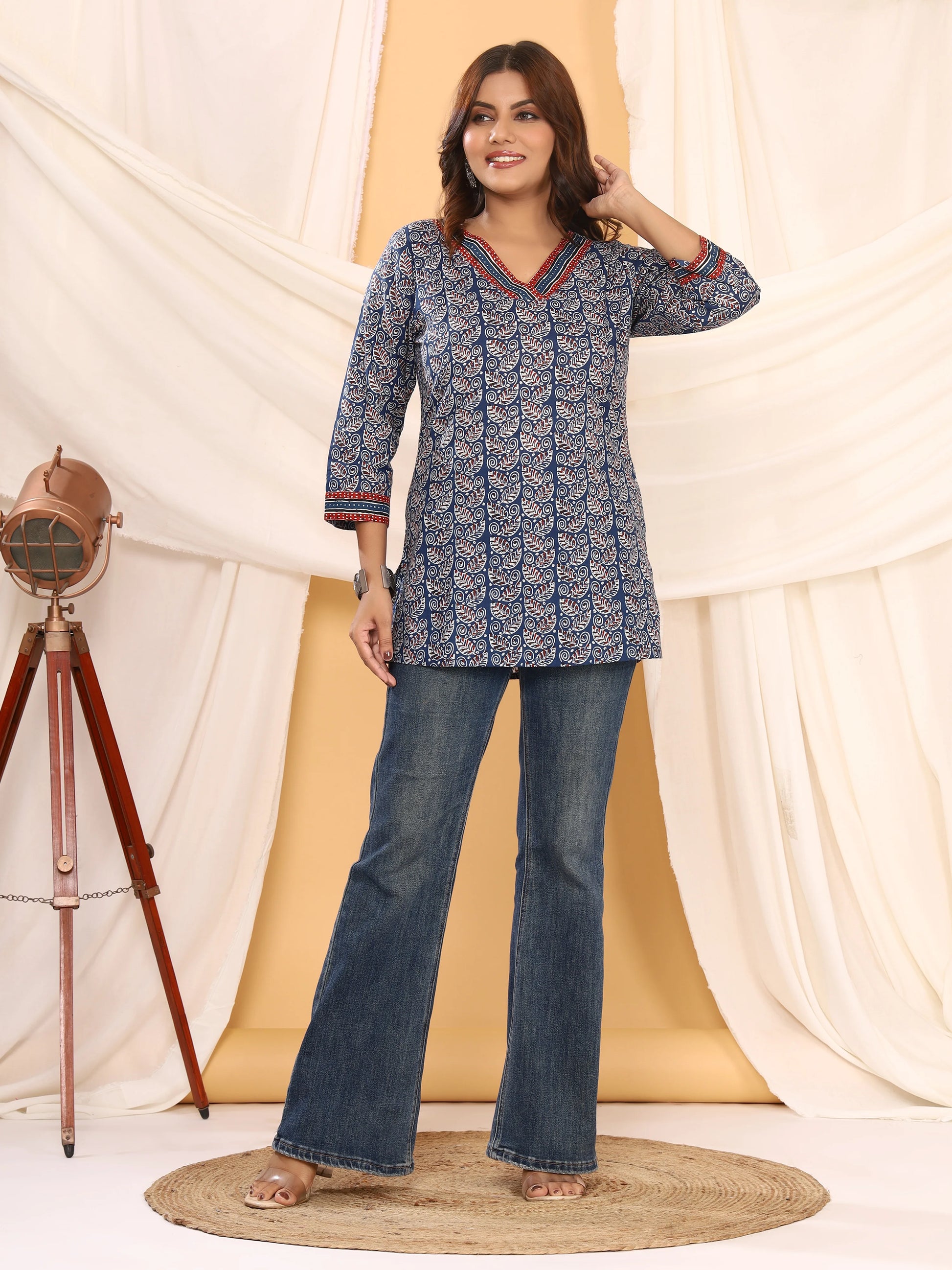 Celebrate timeless craftsmanship with this Ajrakh Navy Print Pure Cotton Top, inspired by the ancient Ajrakh printing tradition. The deep navy base is adorned with intricate geometric and floral motifs in earthy shades of red and white, reflecting the heritage of handblock artistry. The V-neckline is accentuated with embroidered detailing in red and white, while the 3/4th sleeves feature matching embroidered borders, adding sophistication to this everyday essential.