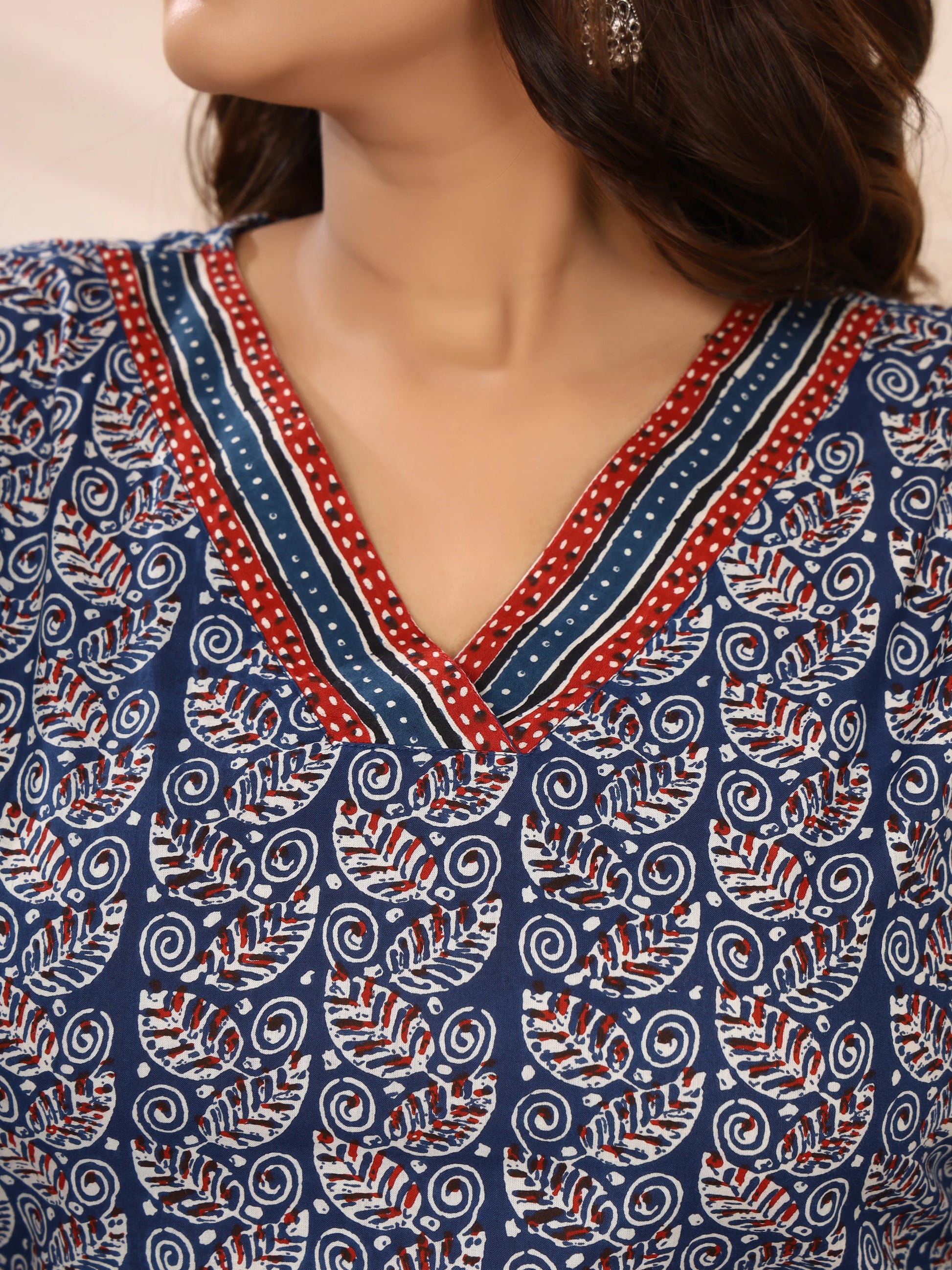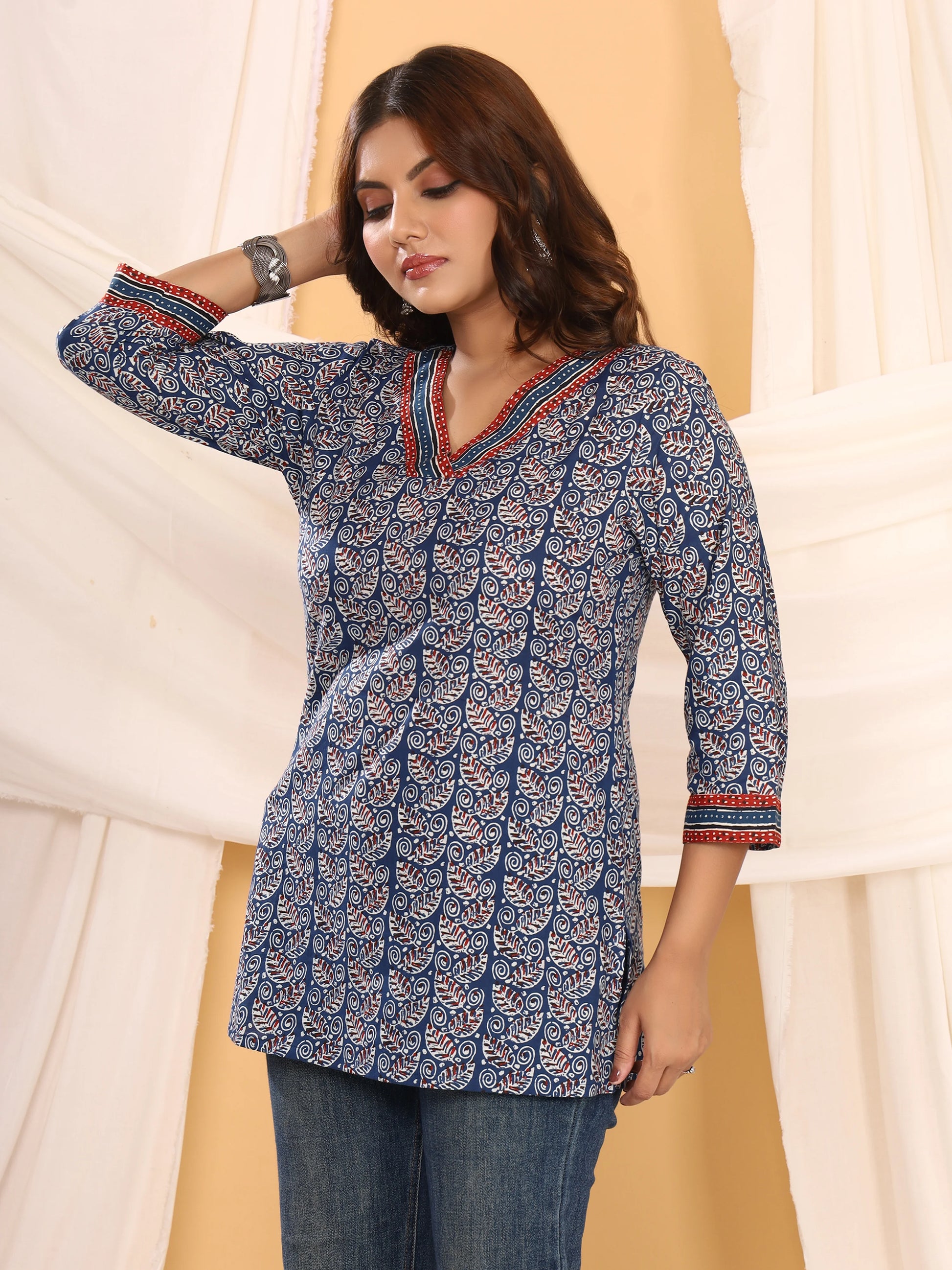 Ajrakh Navy Blue Leaft Print Pure Cotton Top