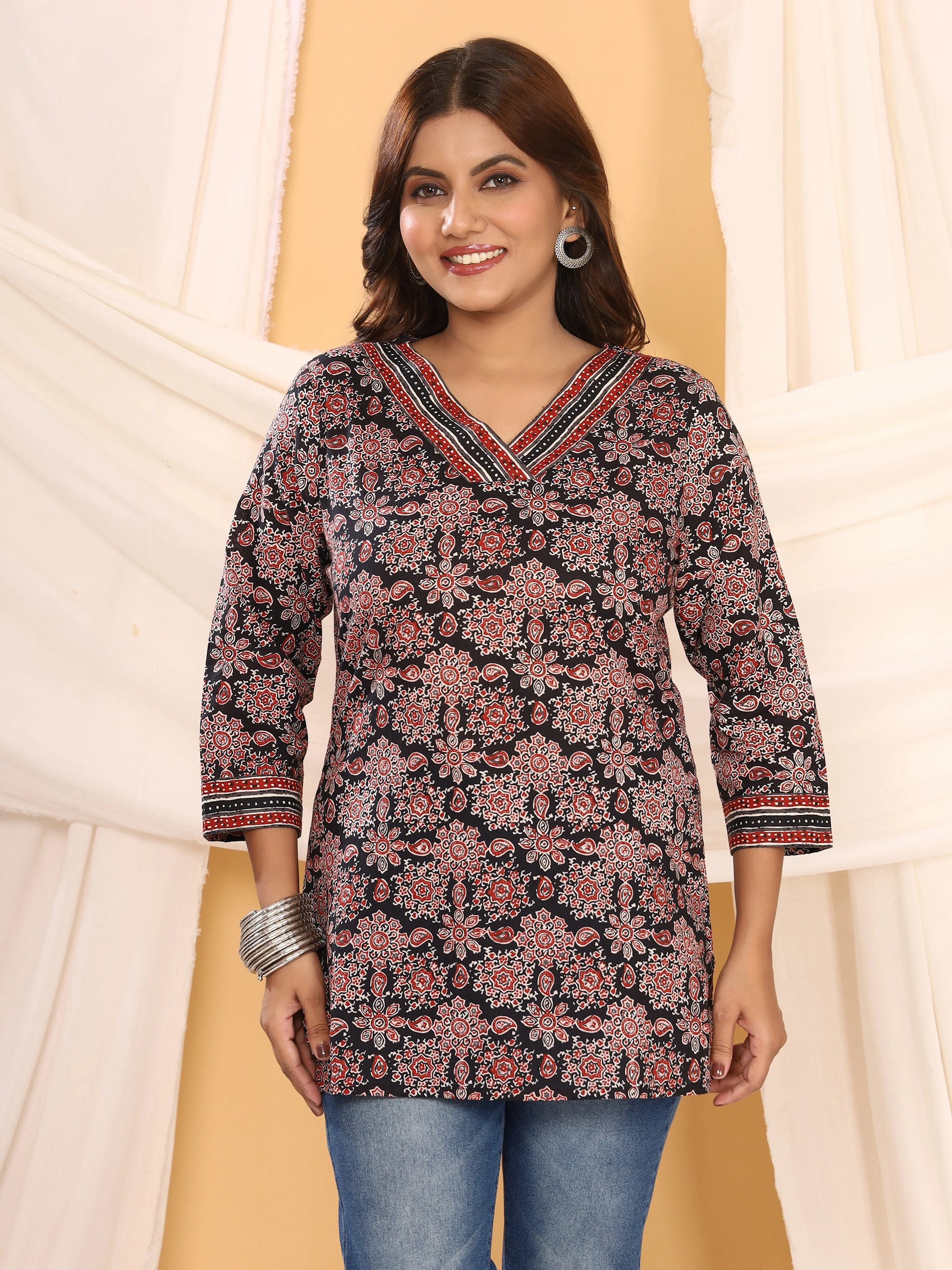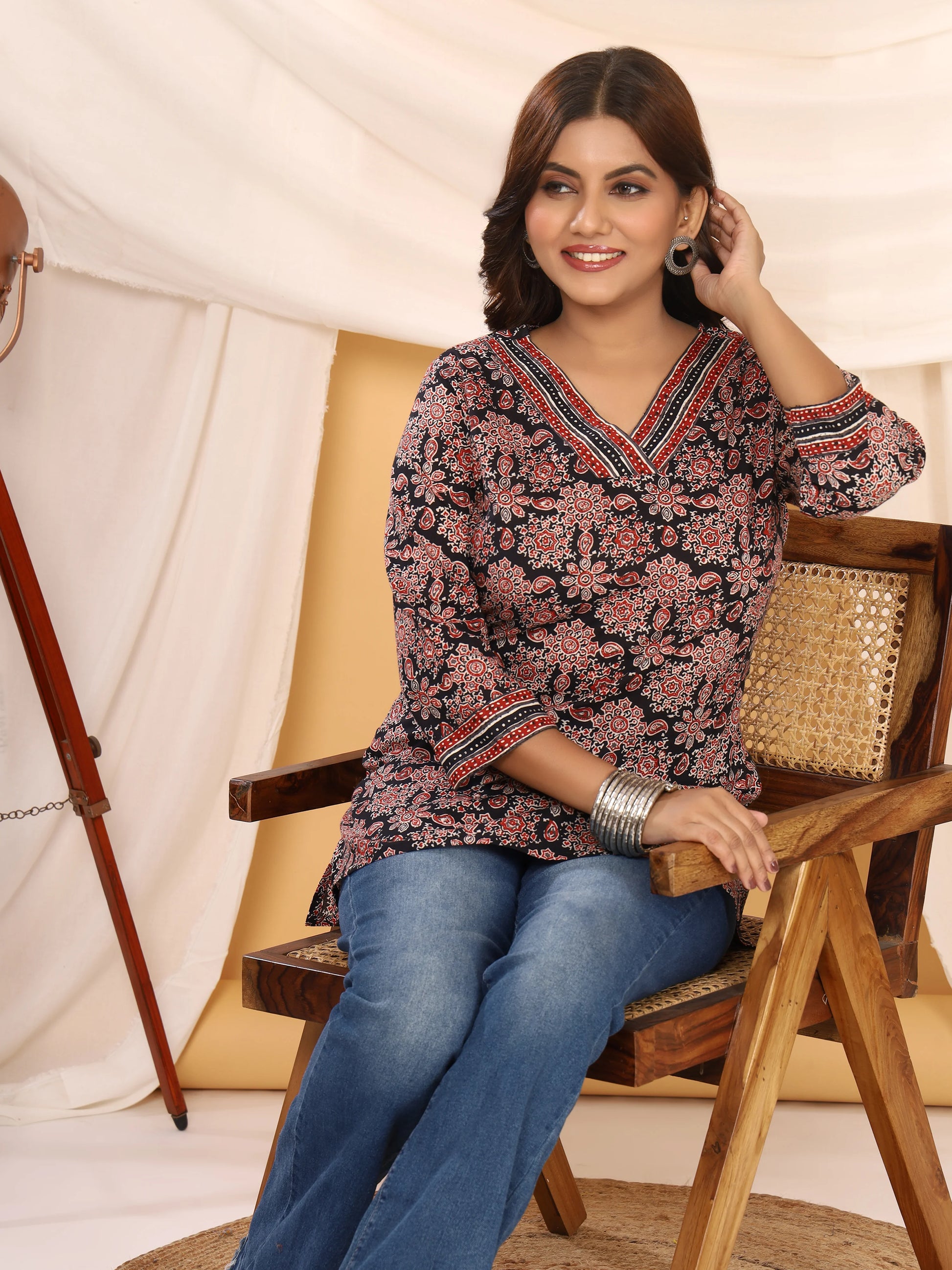 Make a statement with this Ajrakh Black Geometric Print Pure Cotton Top, crafted to blend traditional artistry with modern style. The rich black base is adorned with intricate Ajrakh-inspired motifs in red and white, featuring paisleys, floral stars, and geometric designs that embody the elegance of heritage block printing. The V-neckline is framed with embroidered detailing in red, white, and black, while the 3/4th sleeves ensure a balanced mix of style and comfort.