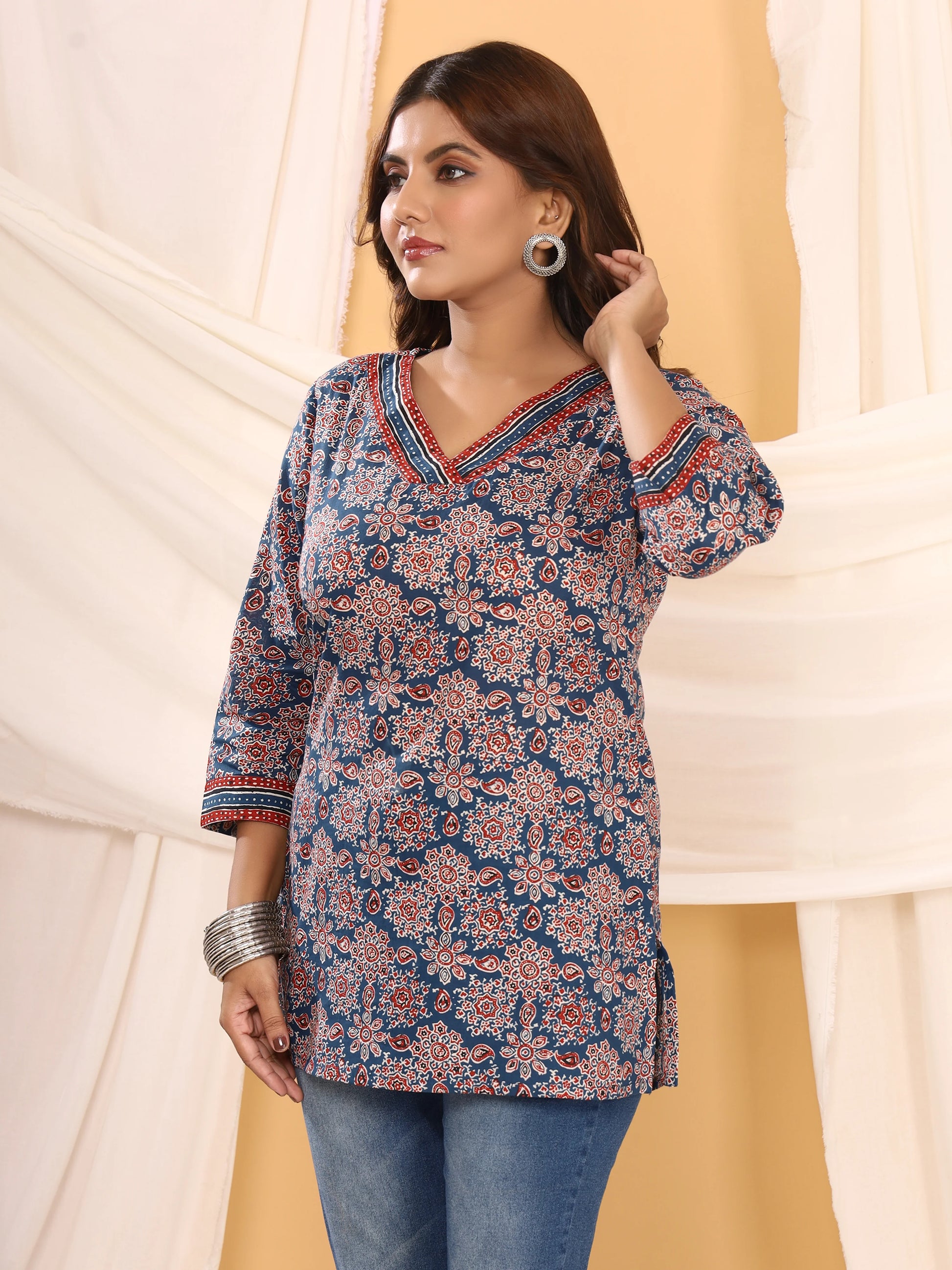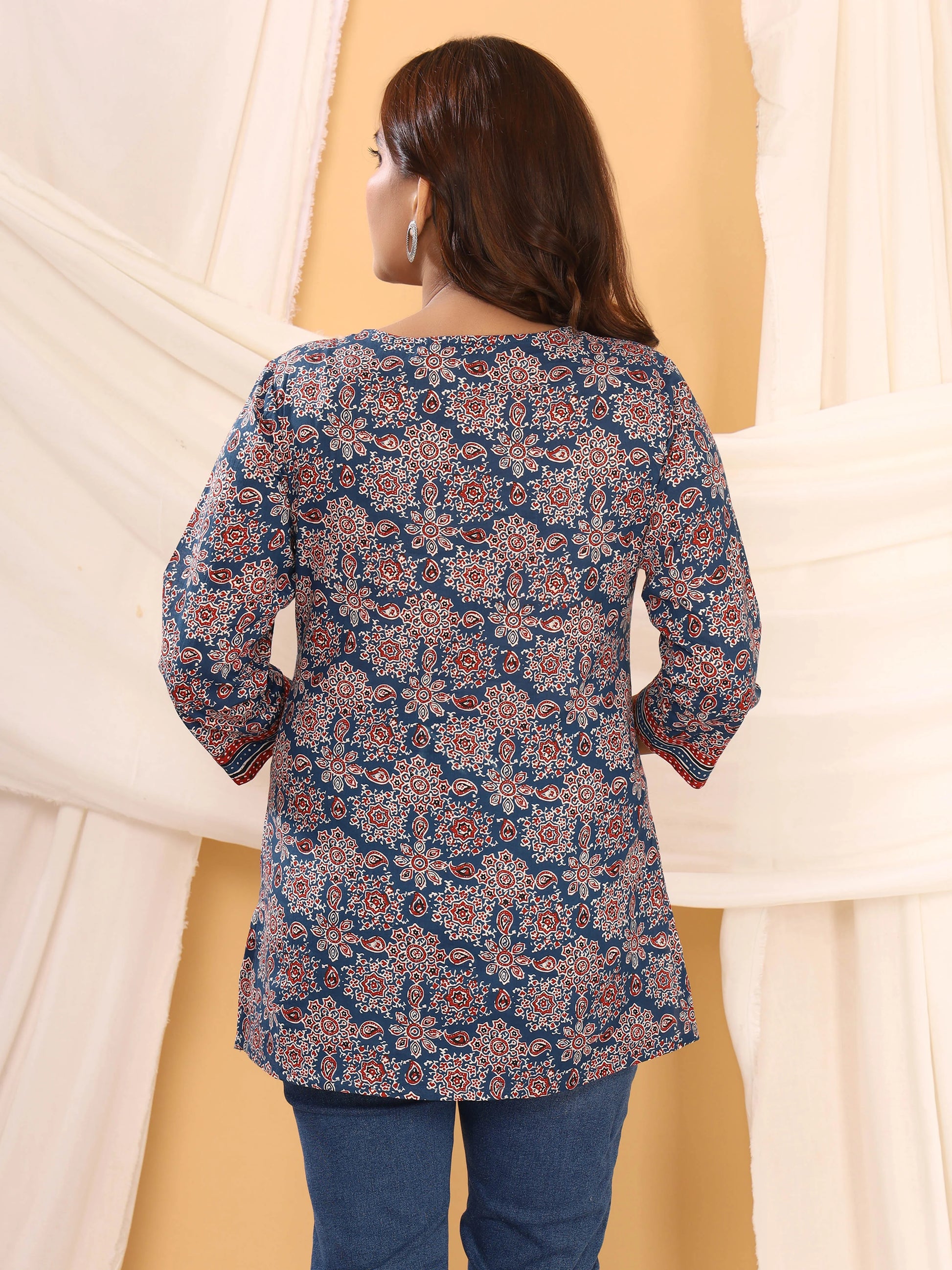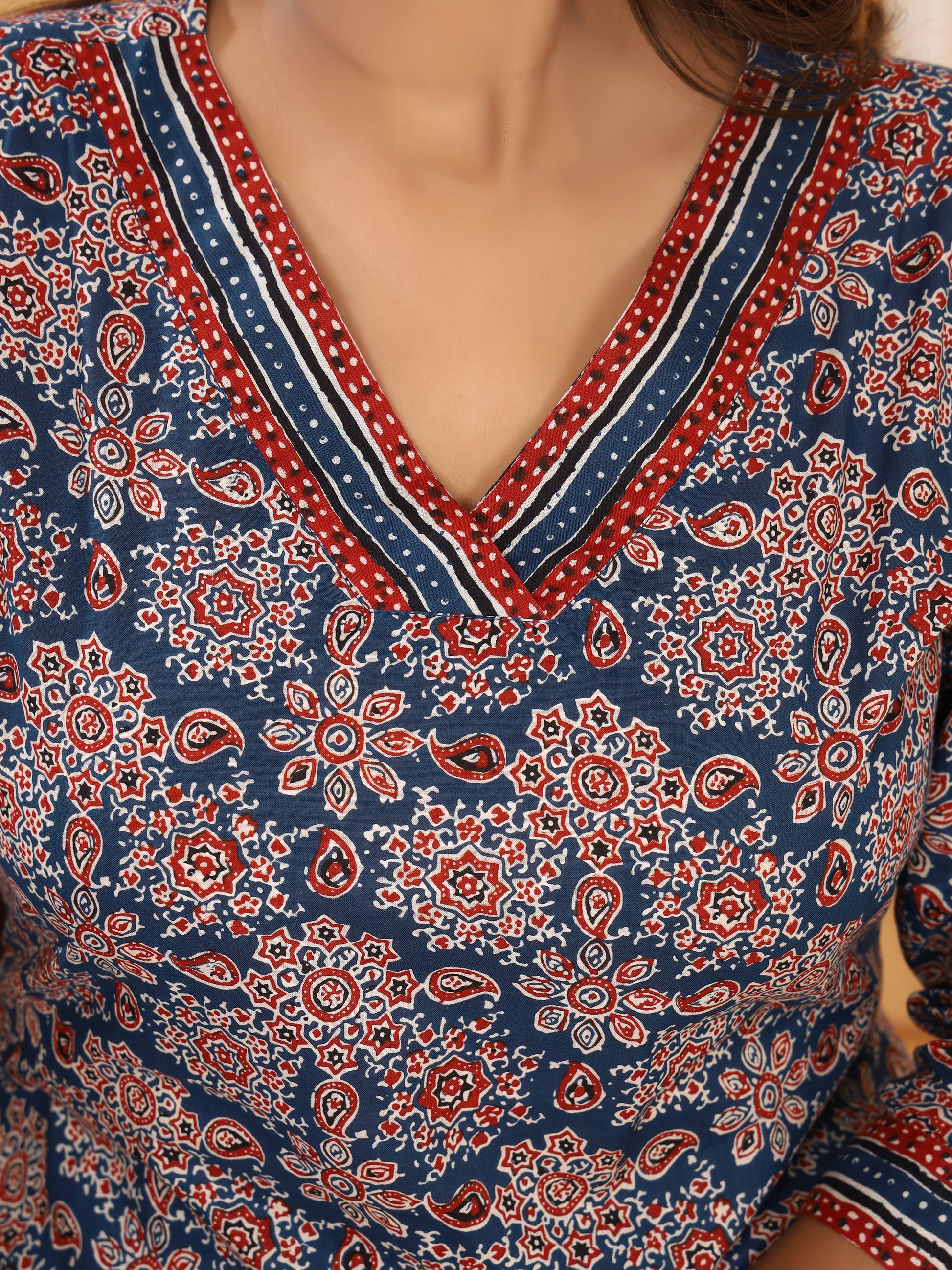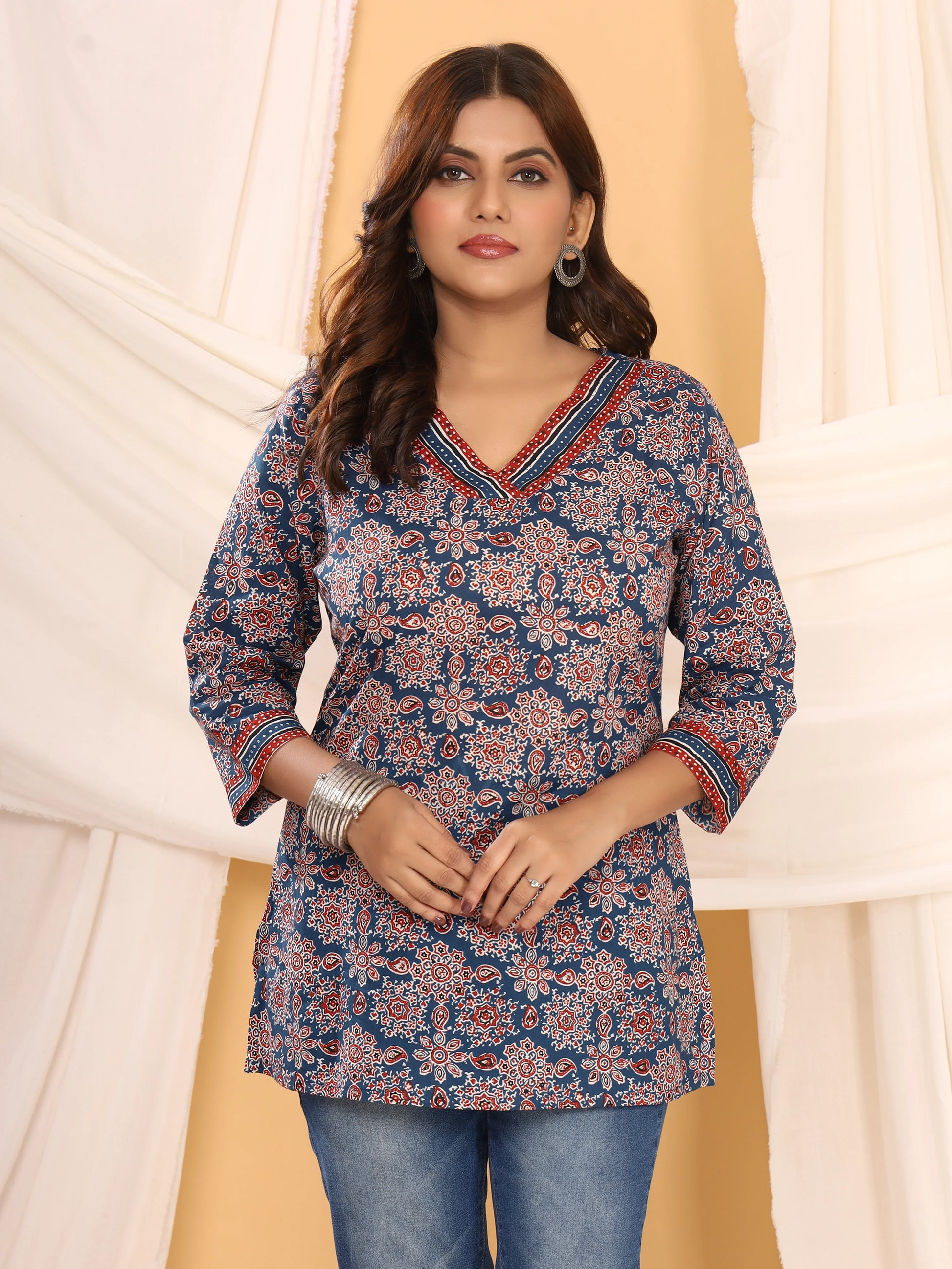 Infuse heritage charm into your wardrobe with this Ajrakh Navy Geometric Print Pure Cotton Top. The deep navy base is beautifully decorated with intricate Ajrakh-inspired motifs in red and white, featuring paisleys, floral stars, and geometric patterns that highlight the richness of traditional block printing. The V-neckline is enhanced with embroidered detailing in red, white, and navy, while the 3/4th sleeves provide both comfort and elegance.