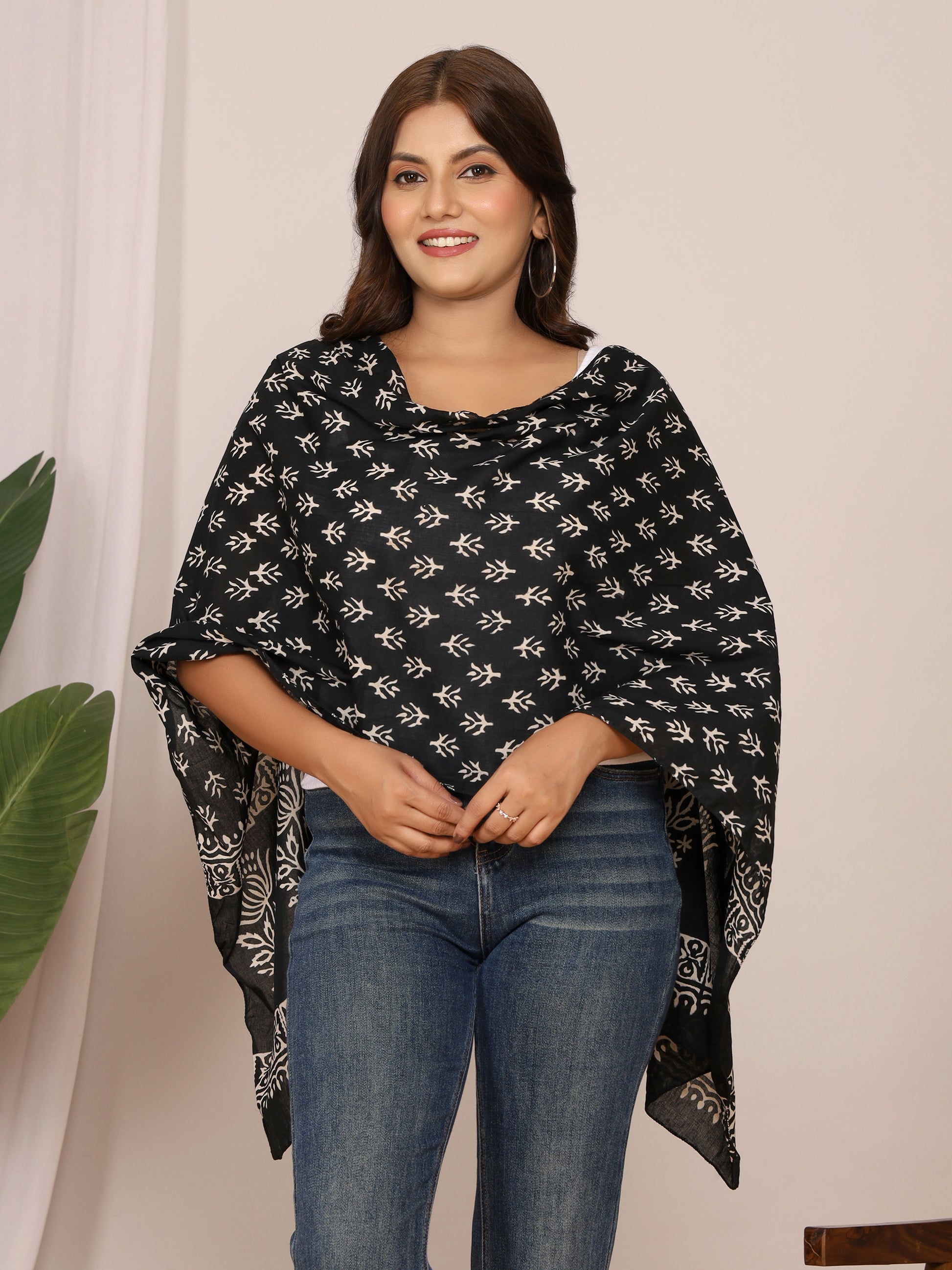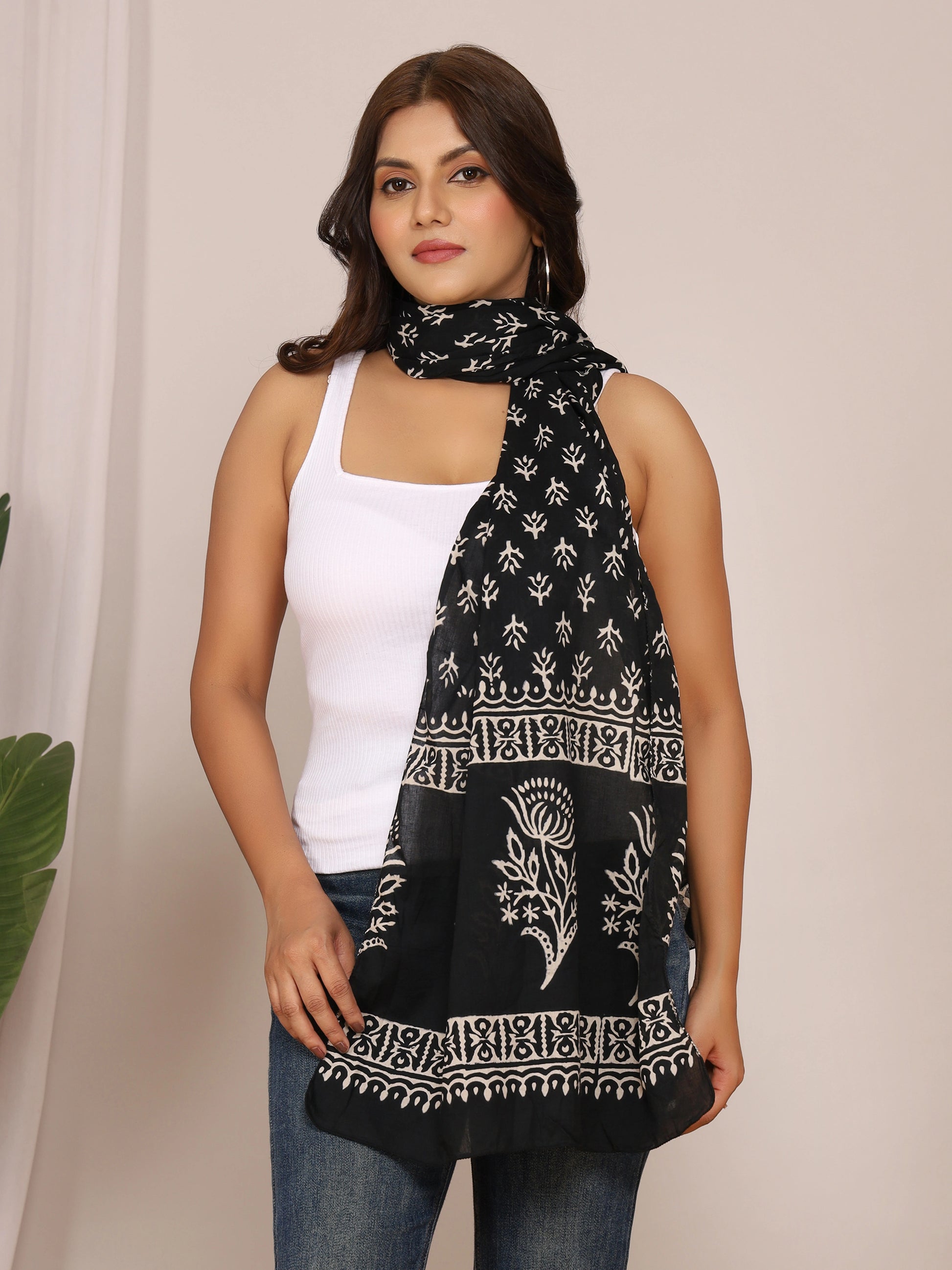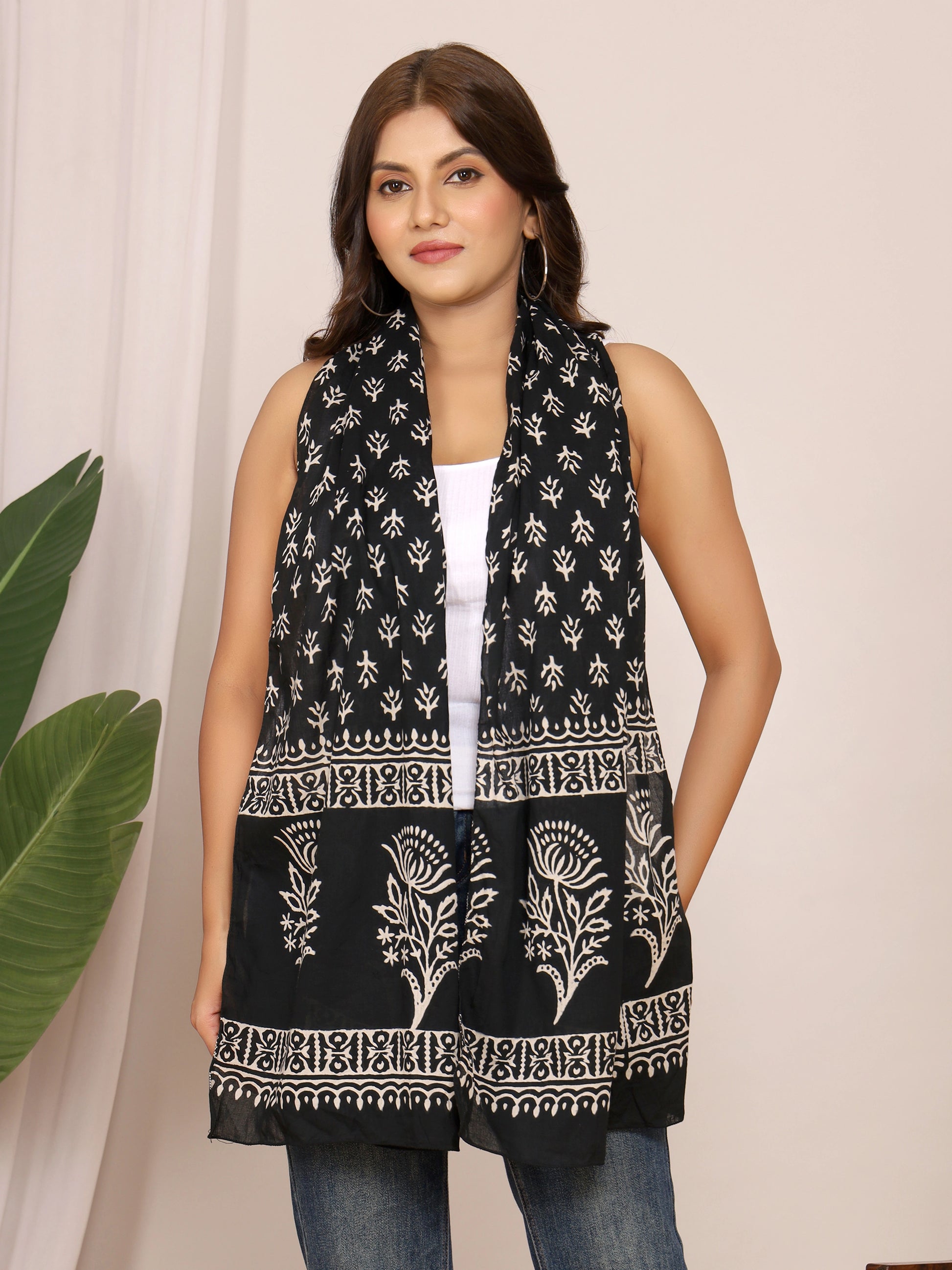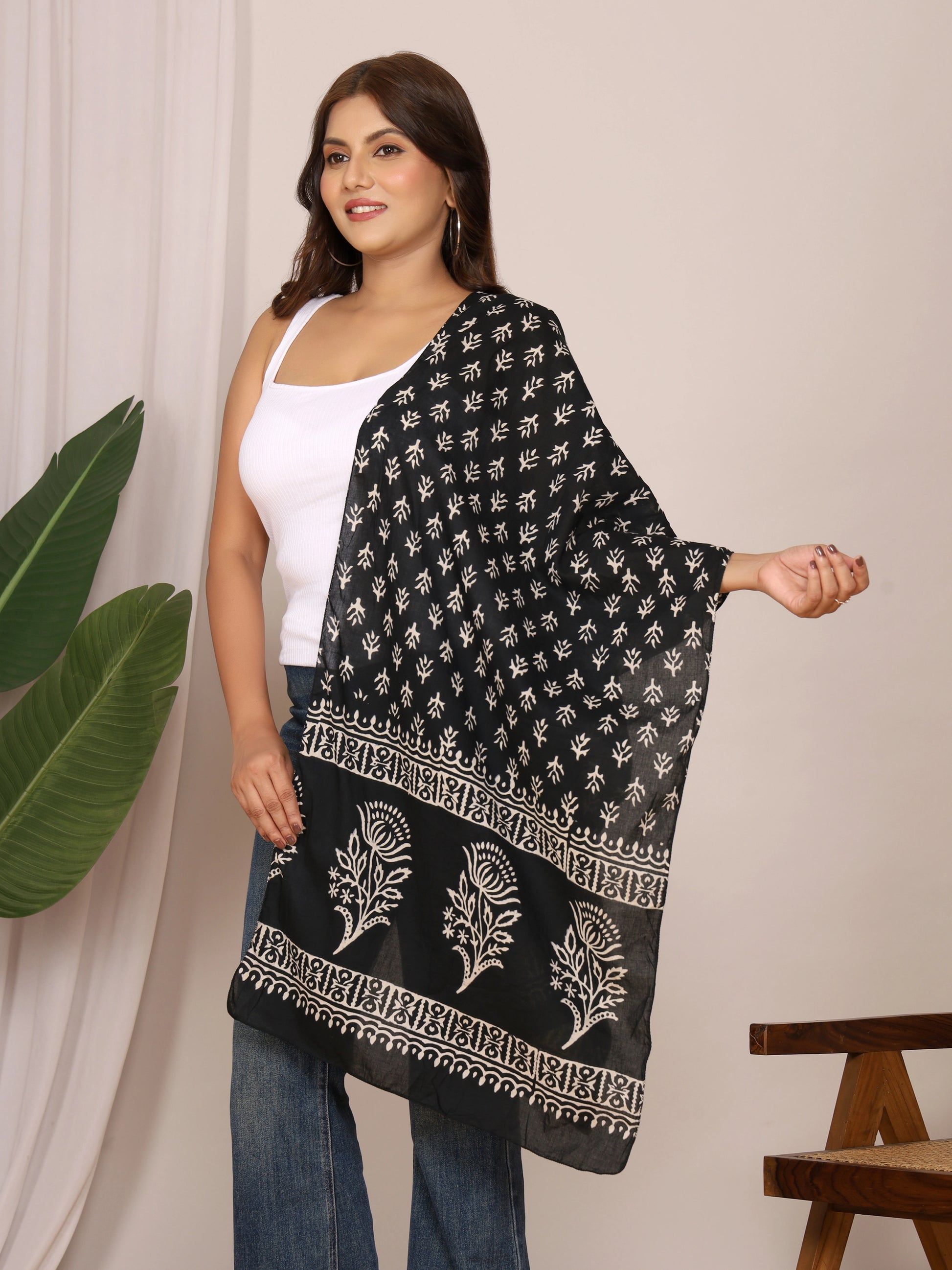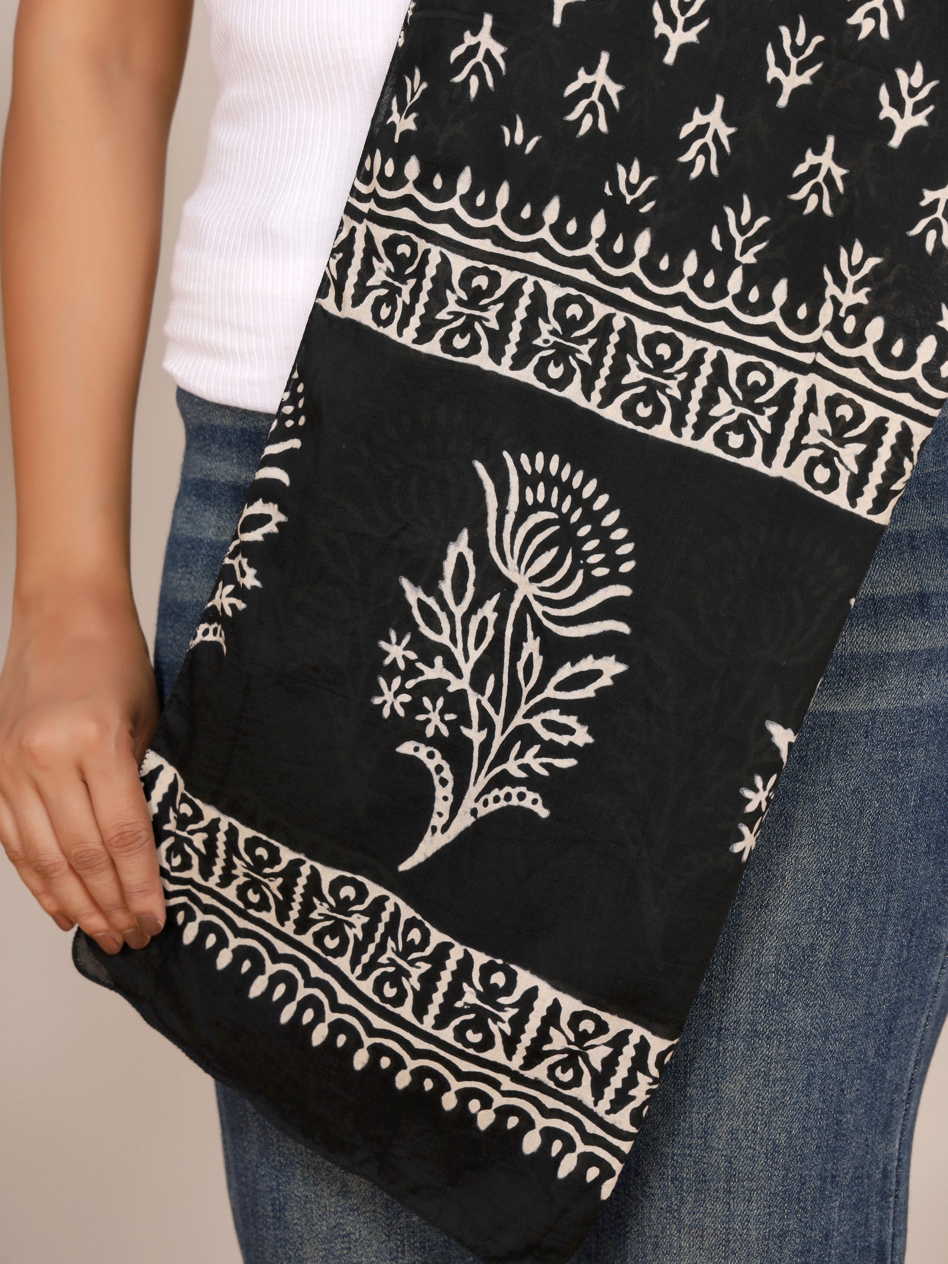 Add timeless elegance to your wardrobe with this black cotton stole featuring bold white handblock floral vine motifs in discharge print