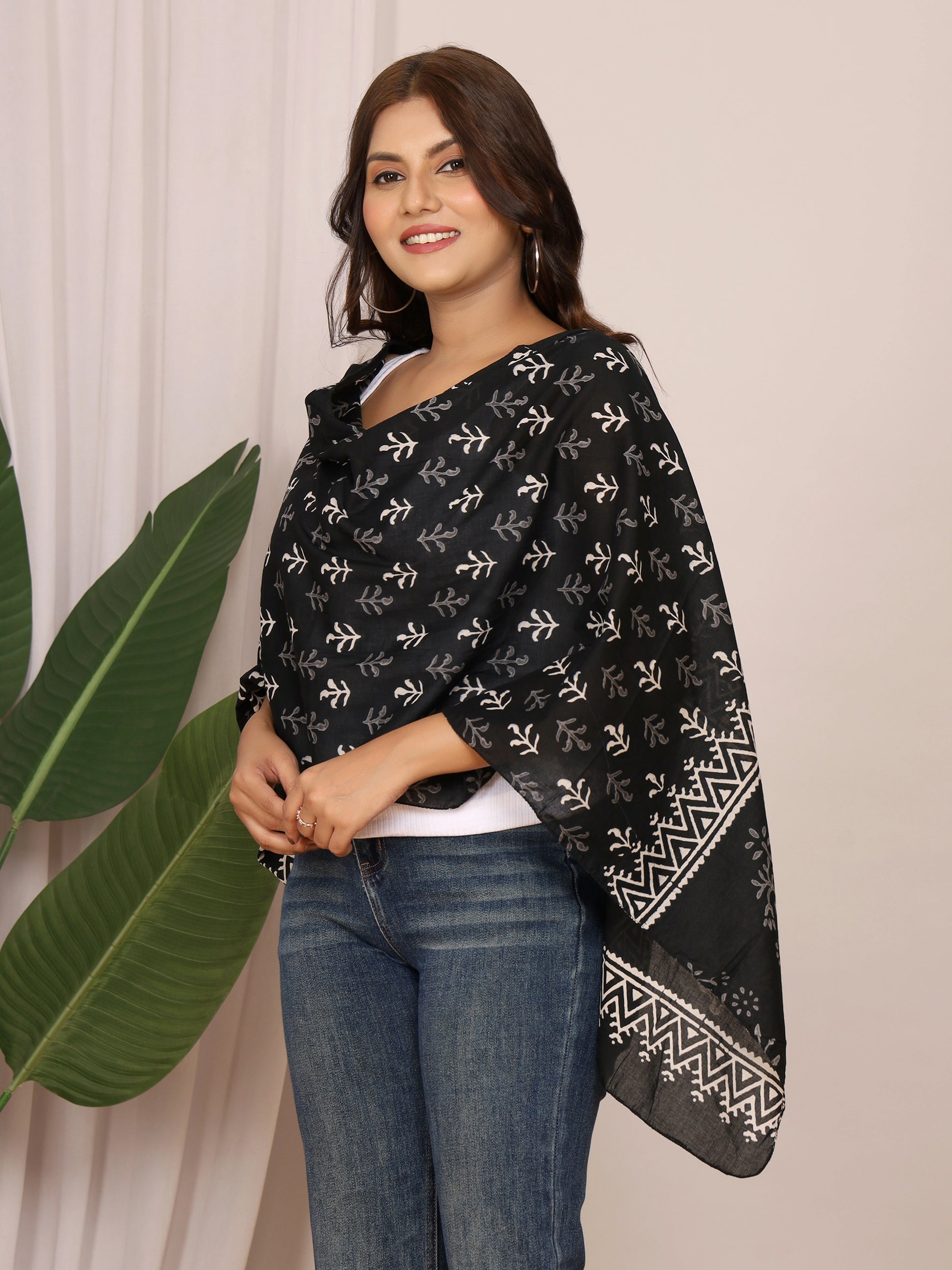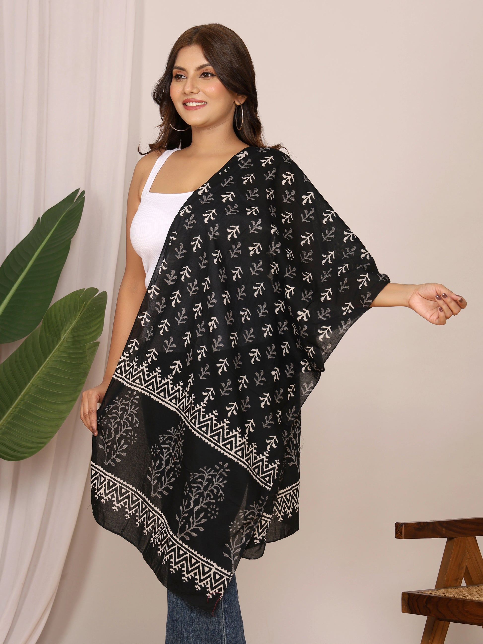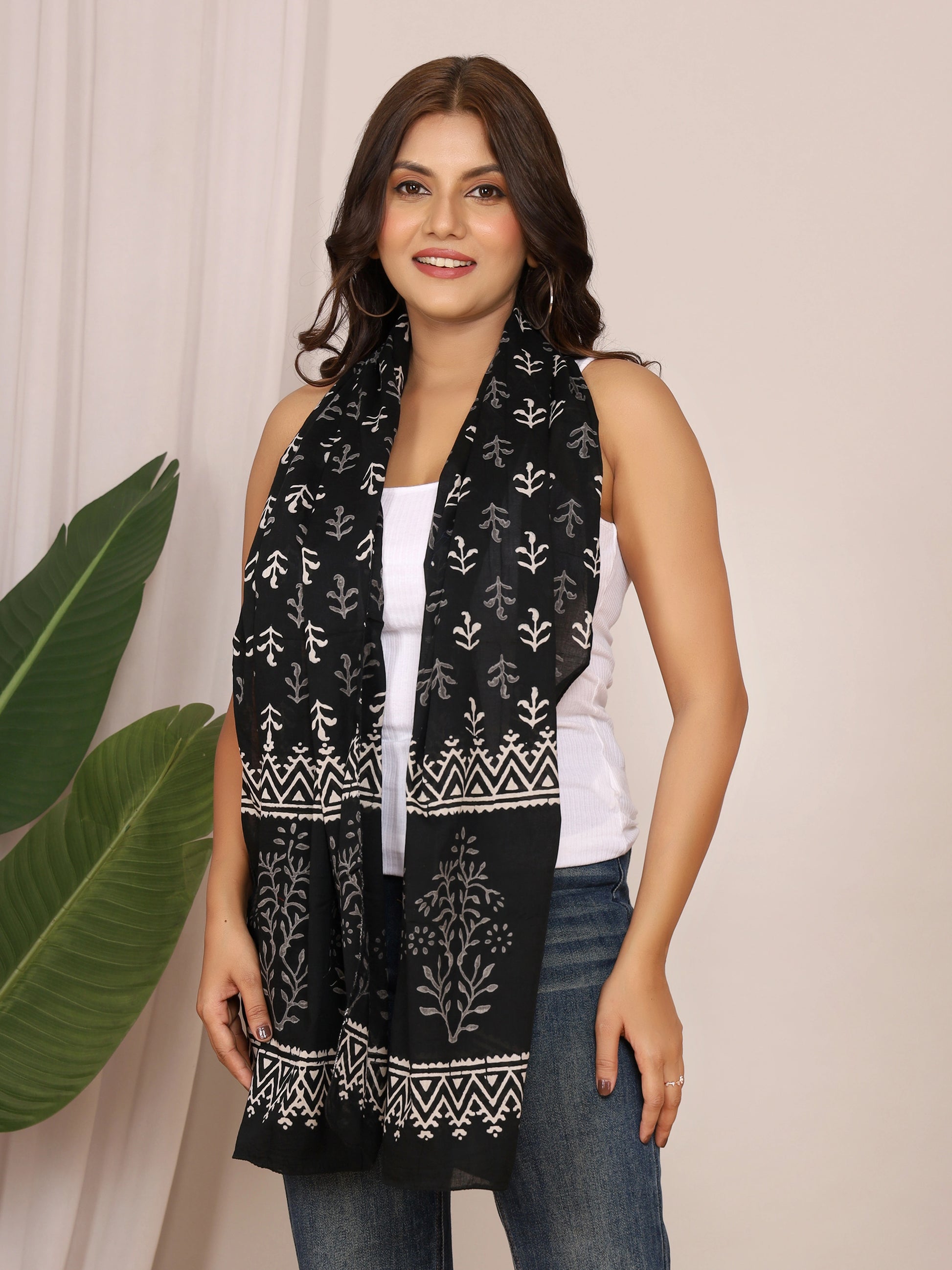 Bring a hint of handcrafted sophistication to your wardrobe with this black cotton stole adorned in elegant white floral boota handblock discharge prints