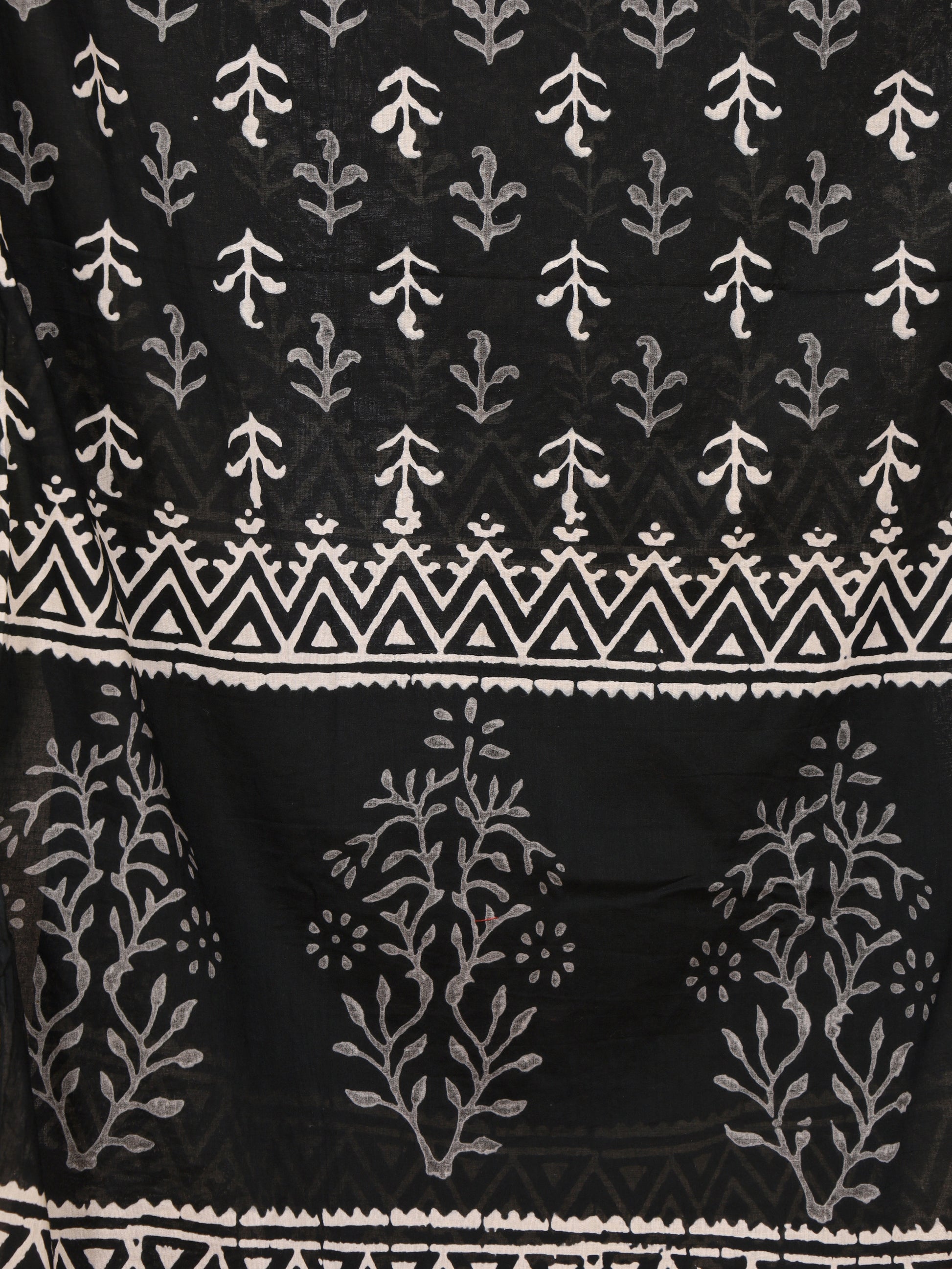 Print: Black base with white floral boota and tribal border handblock discharge print