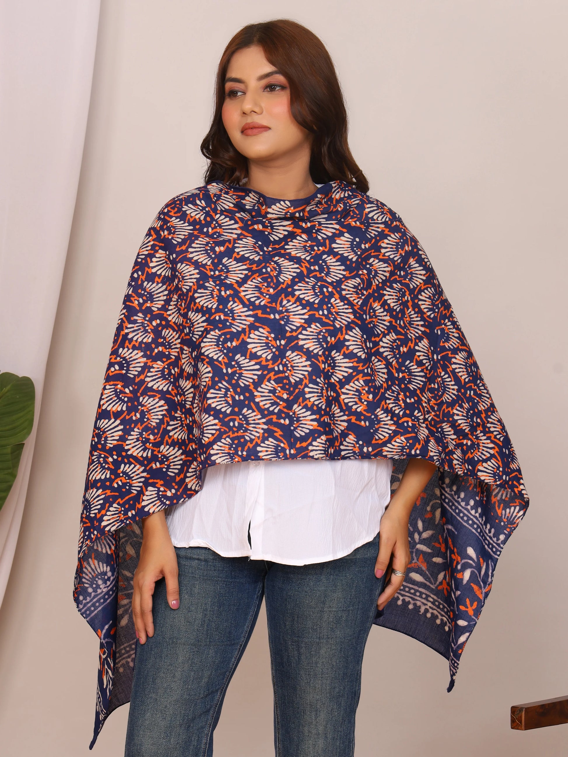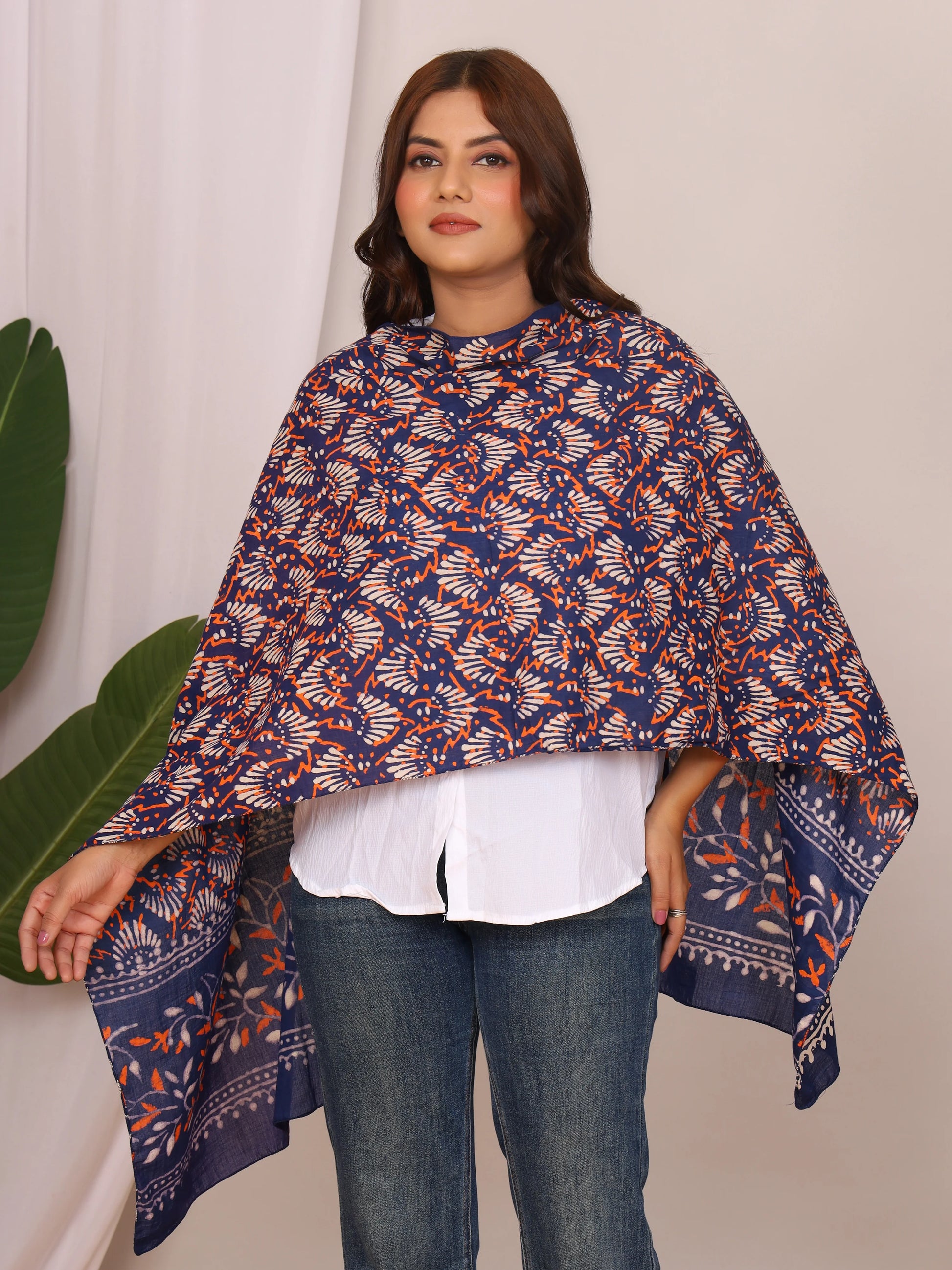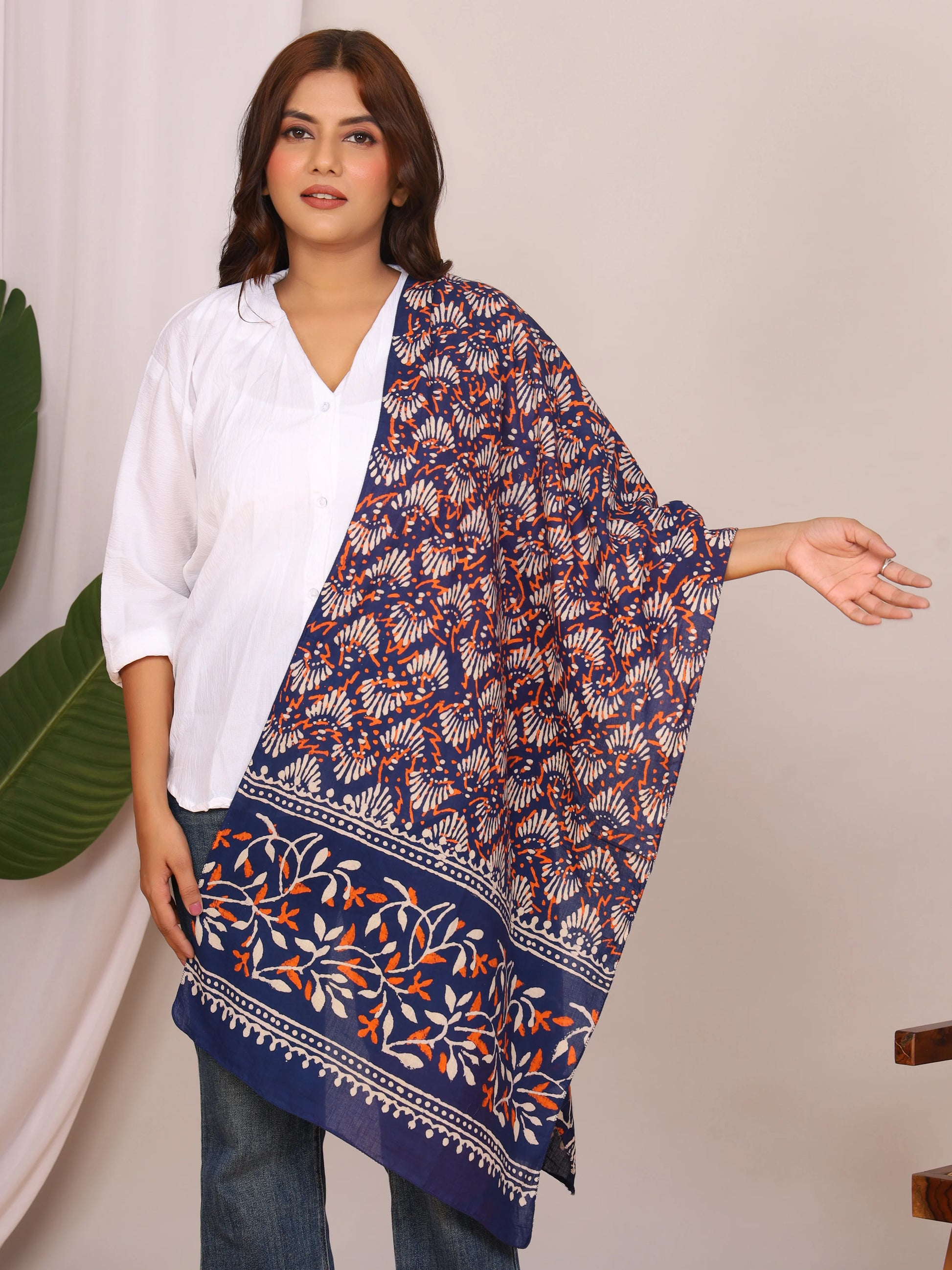 Brighten up your look with this vibrant indigo pure cotton stole featuring traditional handblock Dabu prints in striking white and rust-orange floral motifs