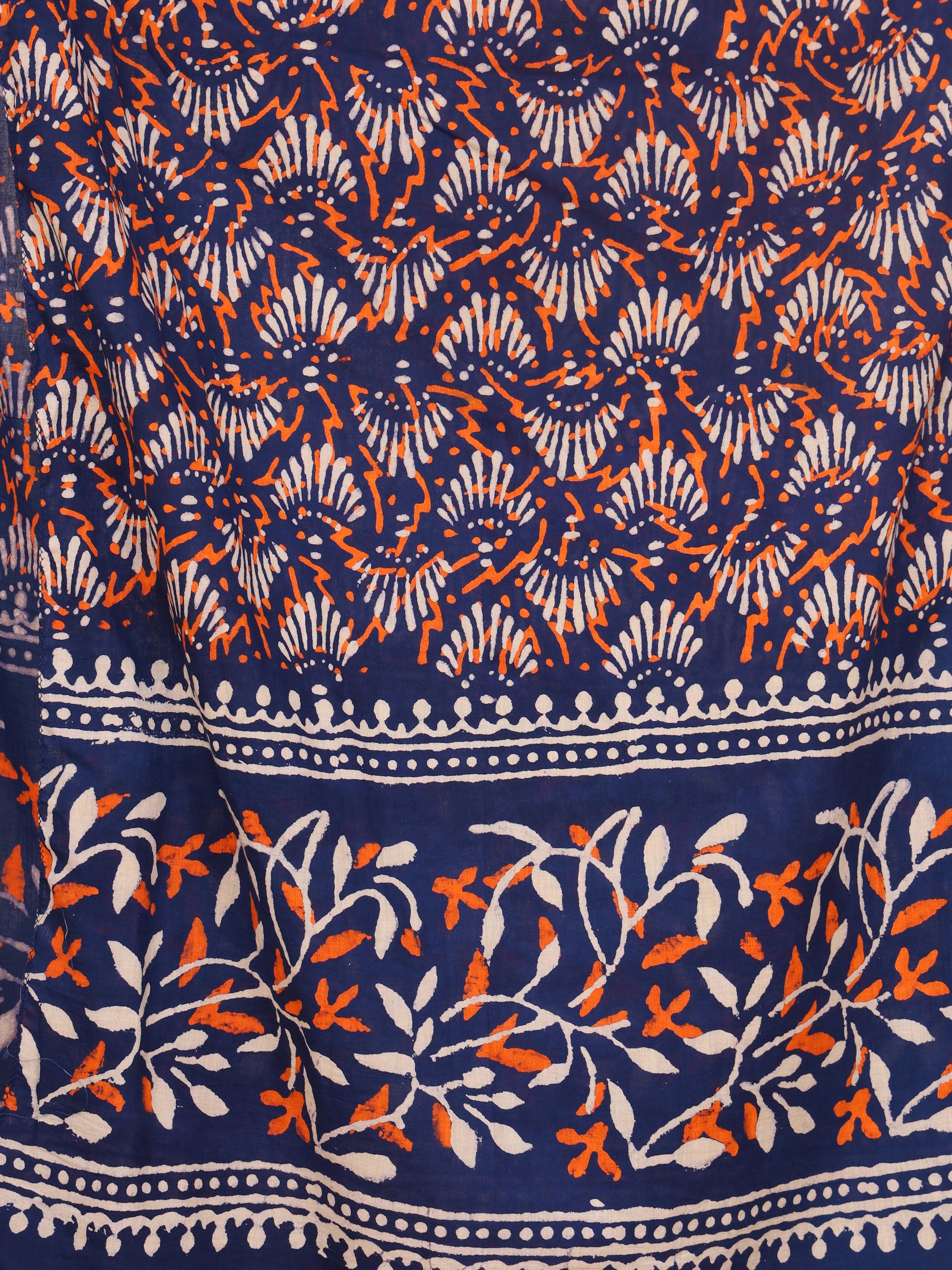 Print: Indigo base with white and rust-orange floral handblock Dabu print