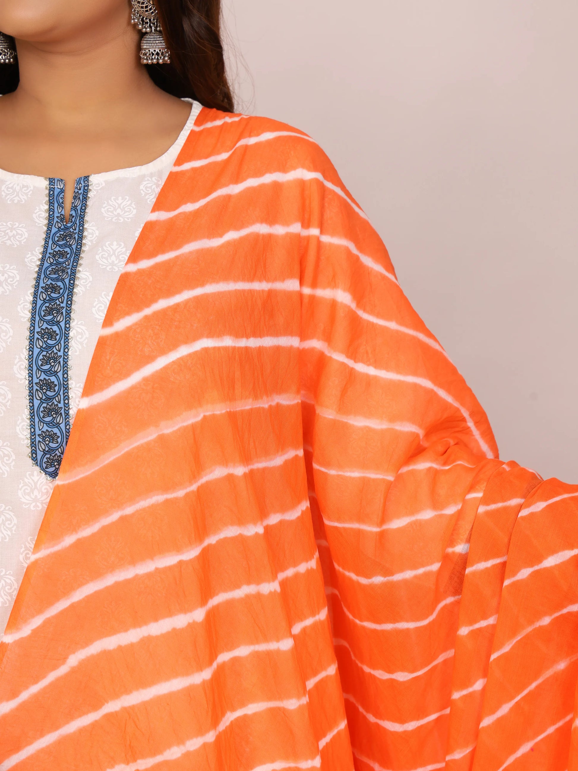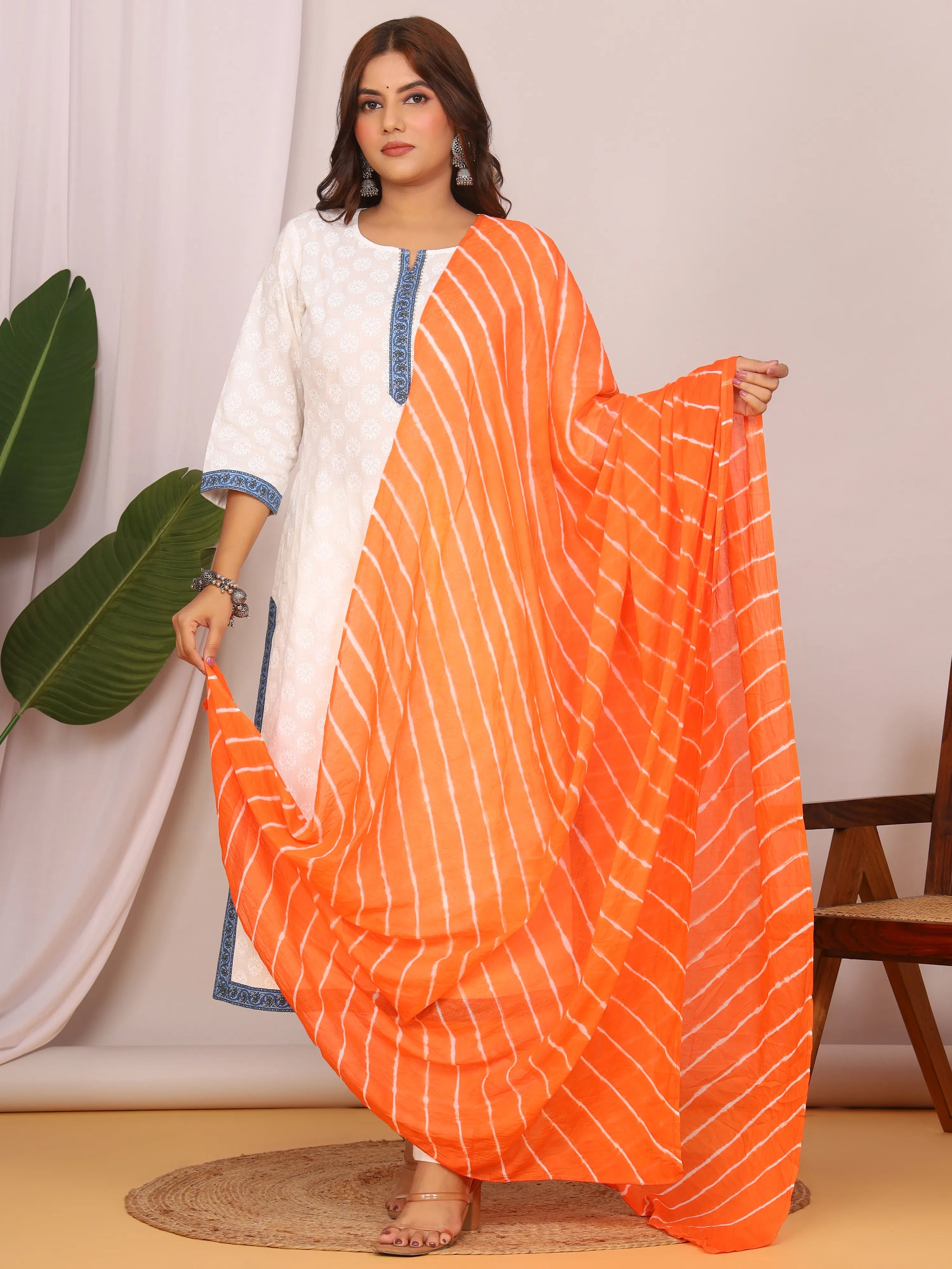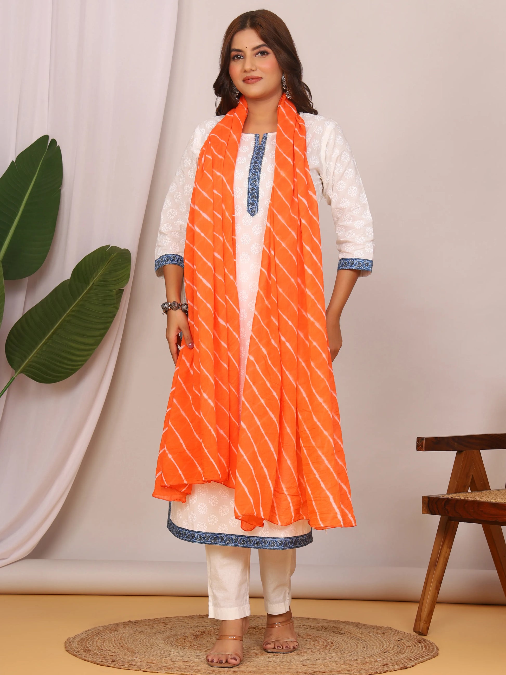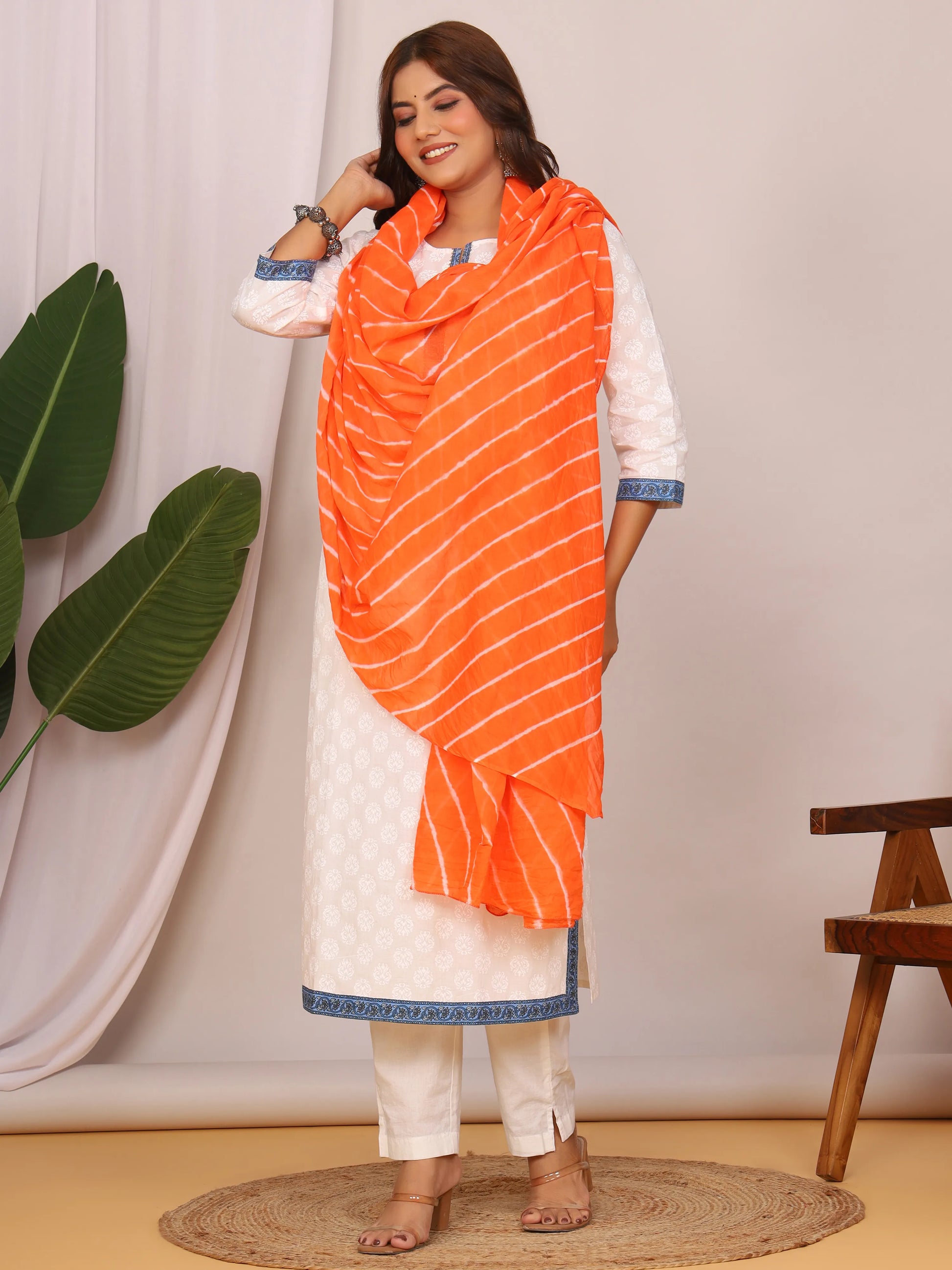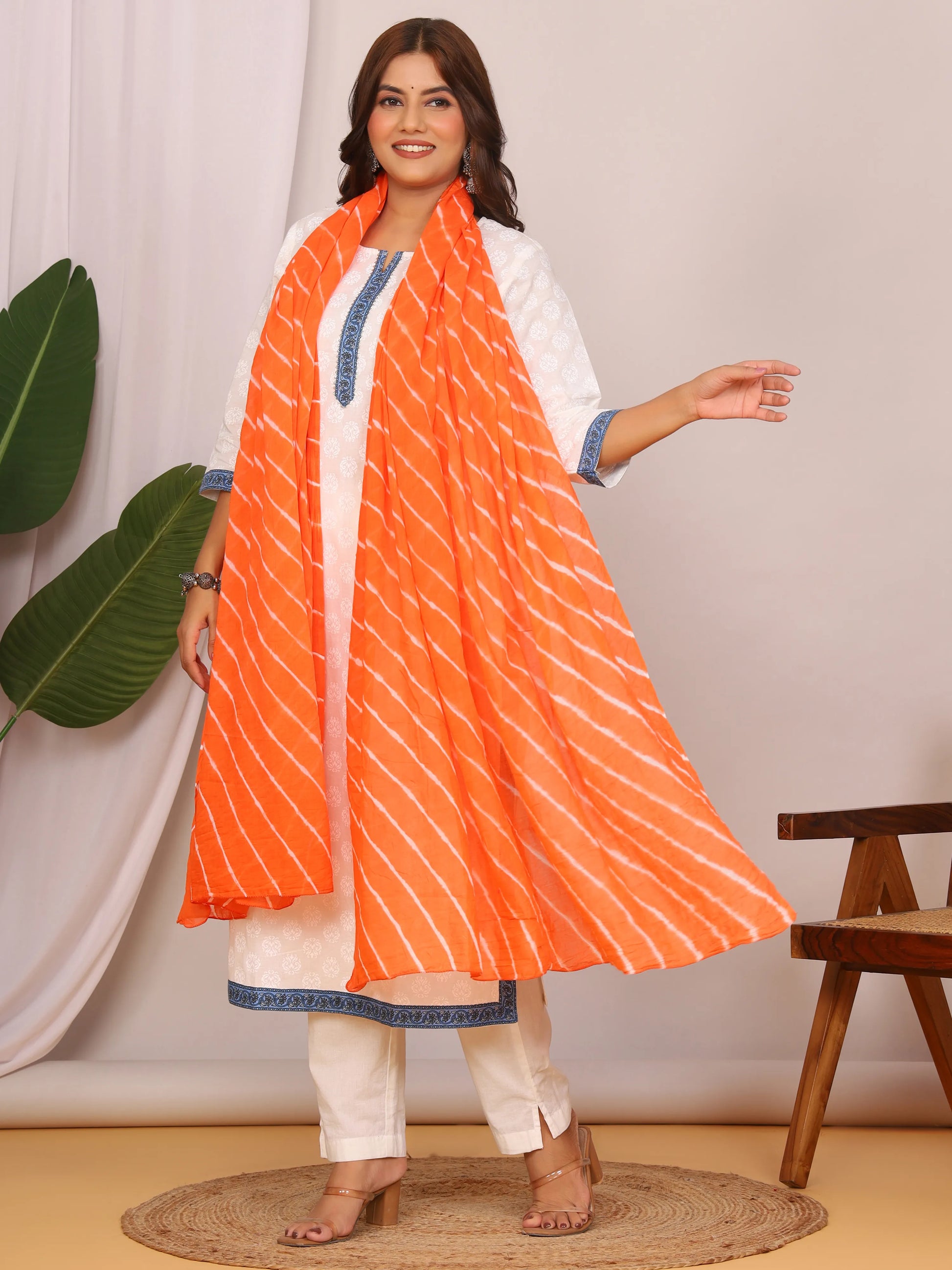 Brighten up your ethnic style with this Orange Pure Cotton Lehriya Dupatta, crafted to combine traditional charm with breathable comfort. The lively orange base is beautifully decorated with a white hand-tied Lehriya pattern, showcasing the authentic artistry of Rajasthan. Made from pure cotton, it offers a soft, airy texture that feels light on the skin and drapes gracefully, making it a wardrobe essential for every season.