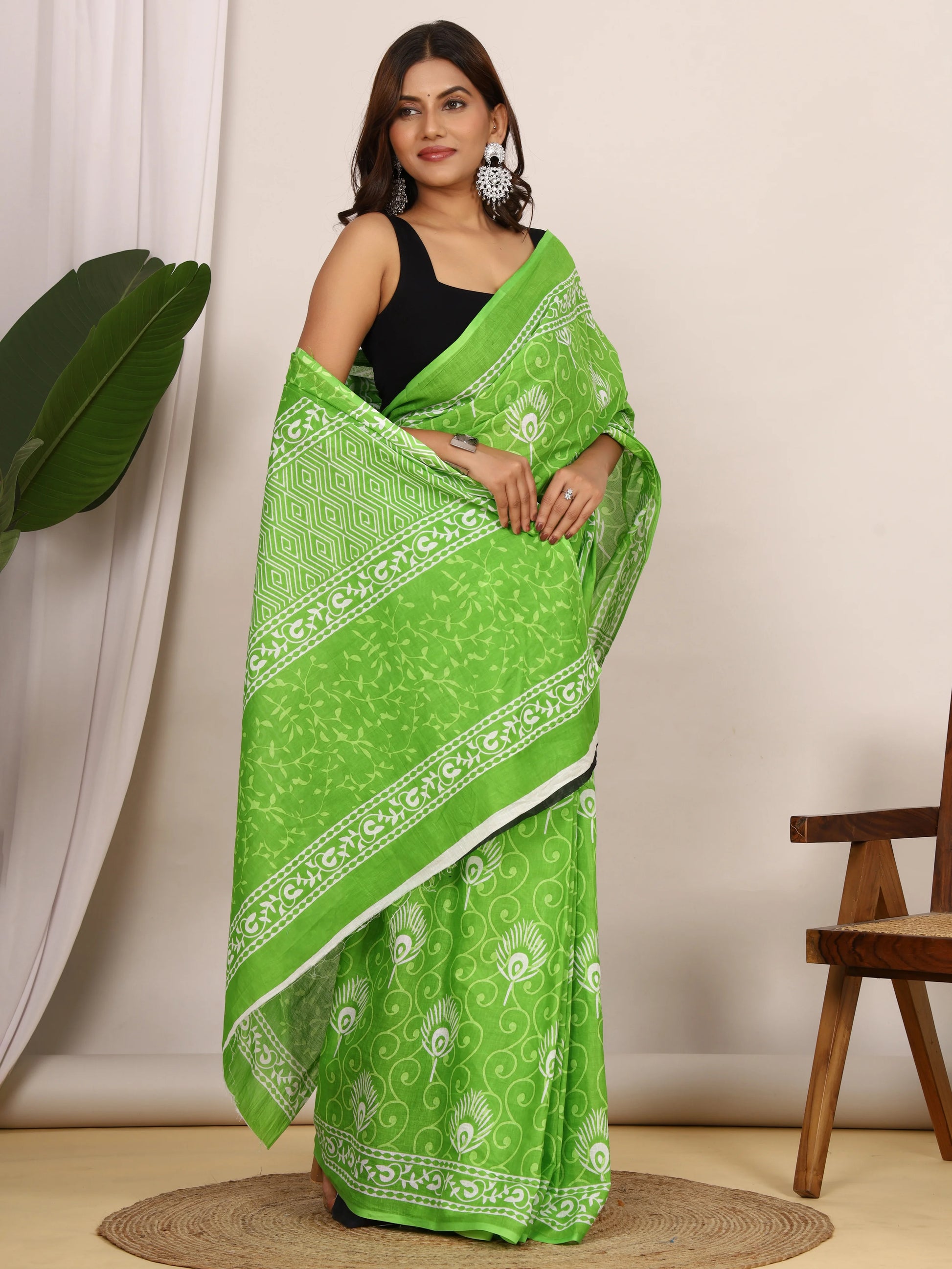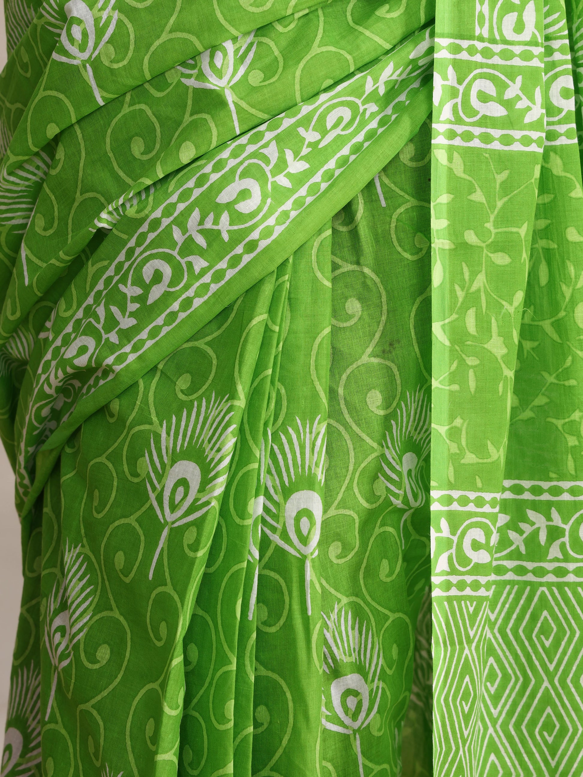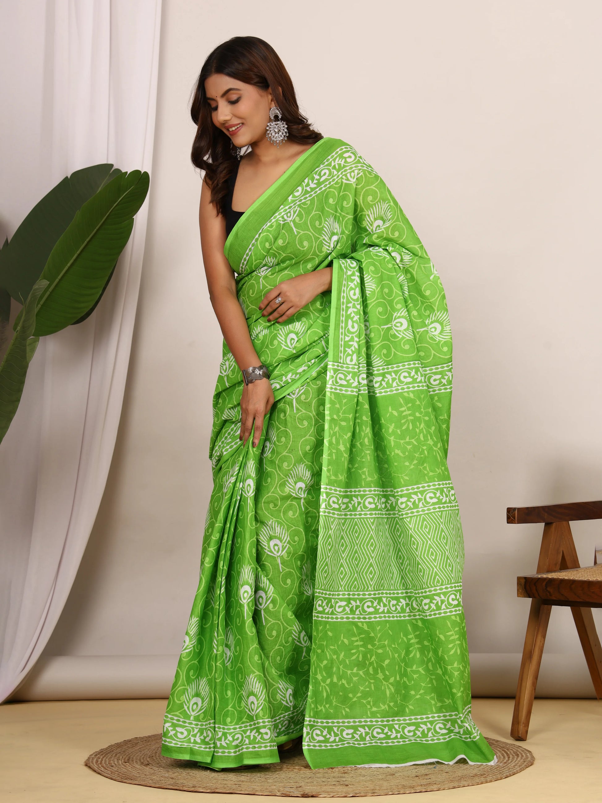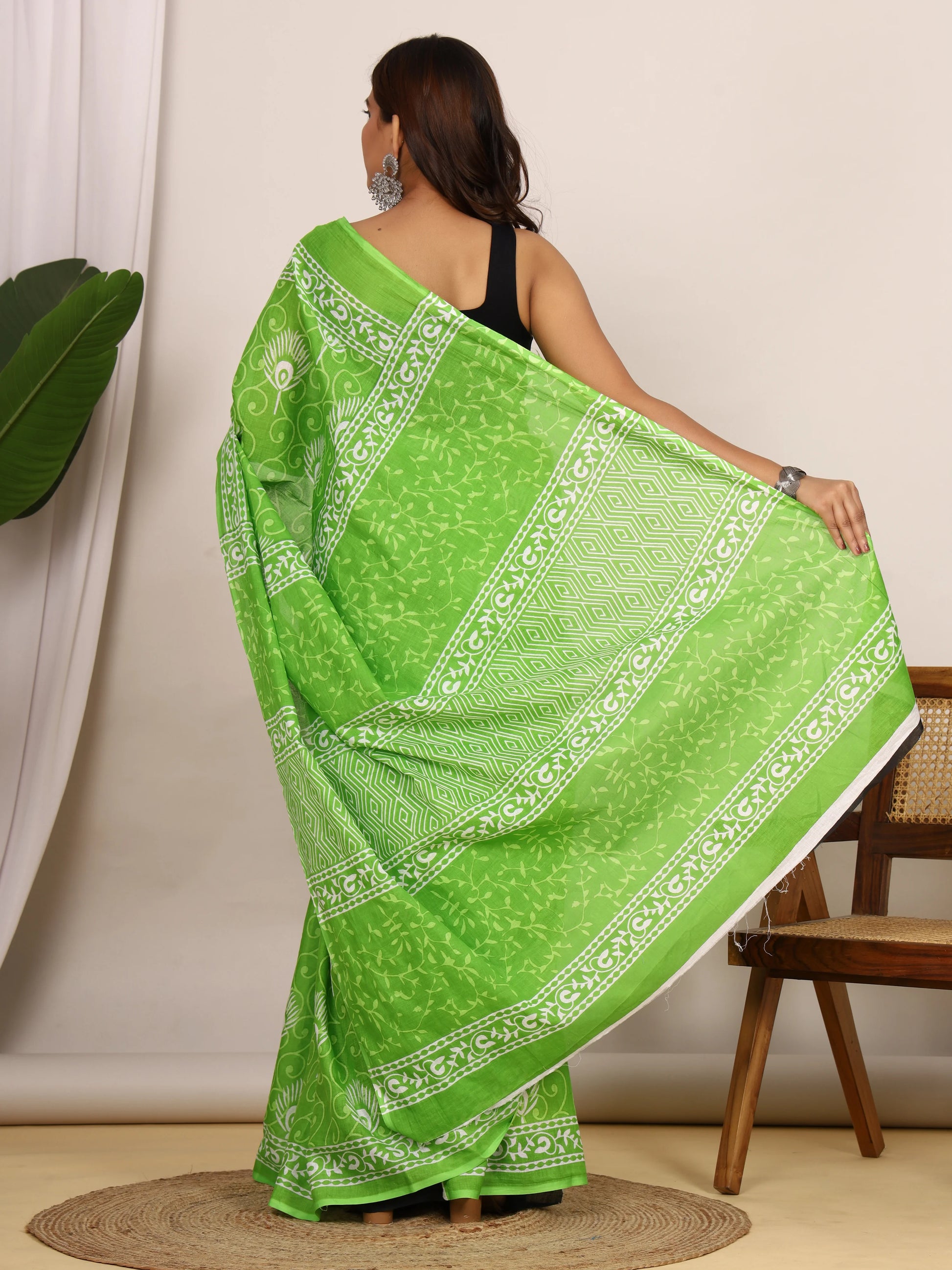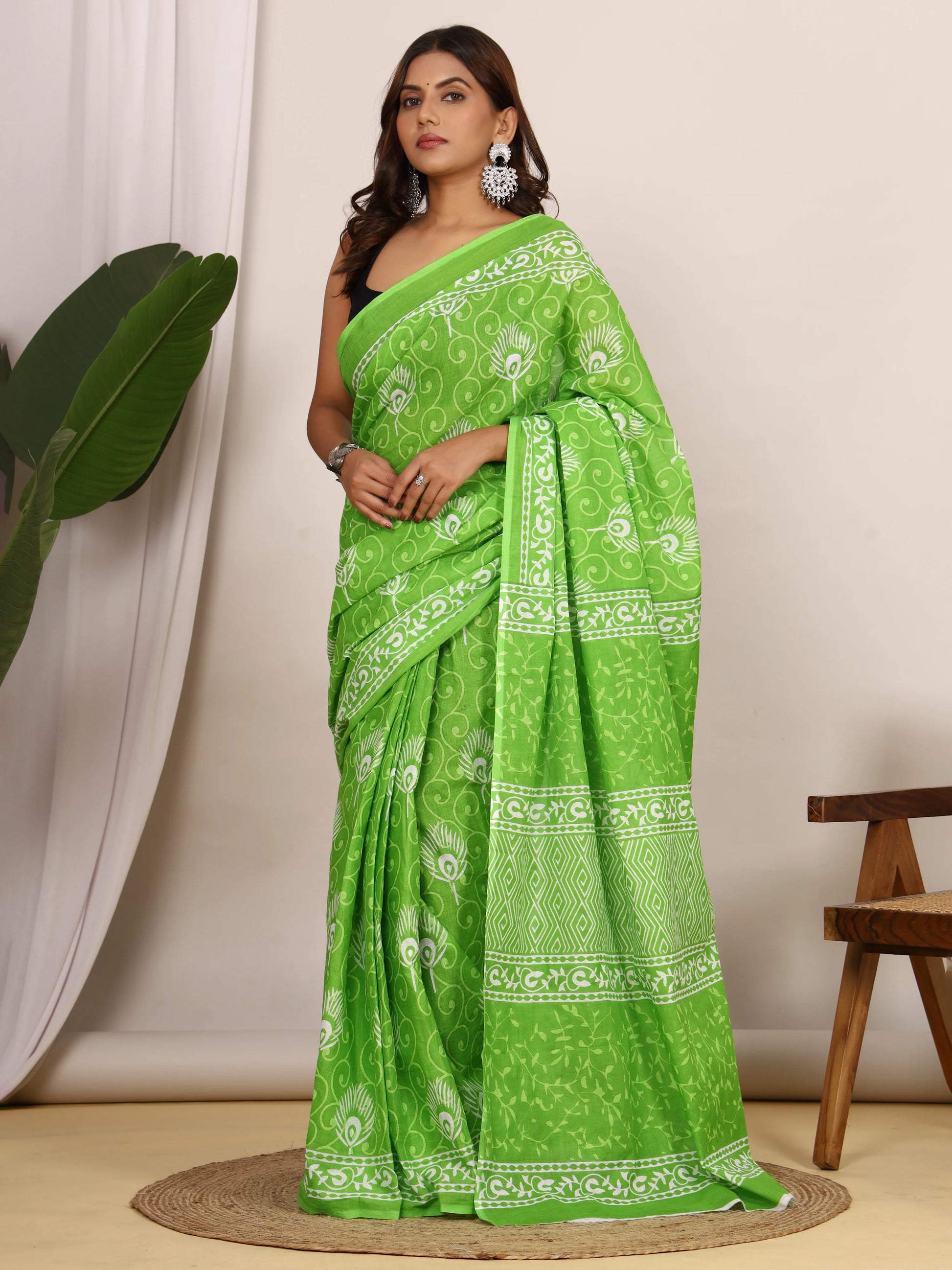 Pure Cotton Lime Green and White Saree with Traditional Peacock Block Print