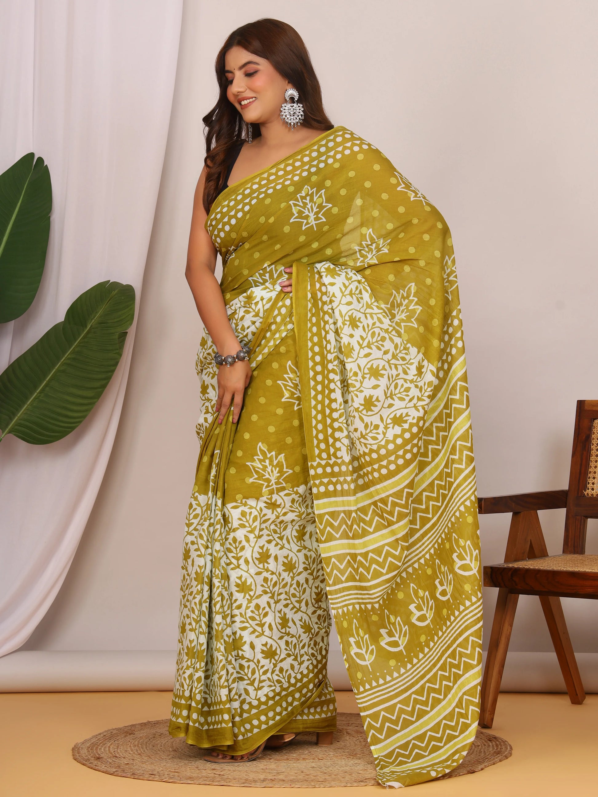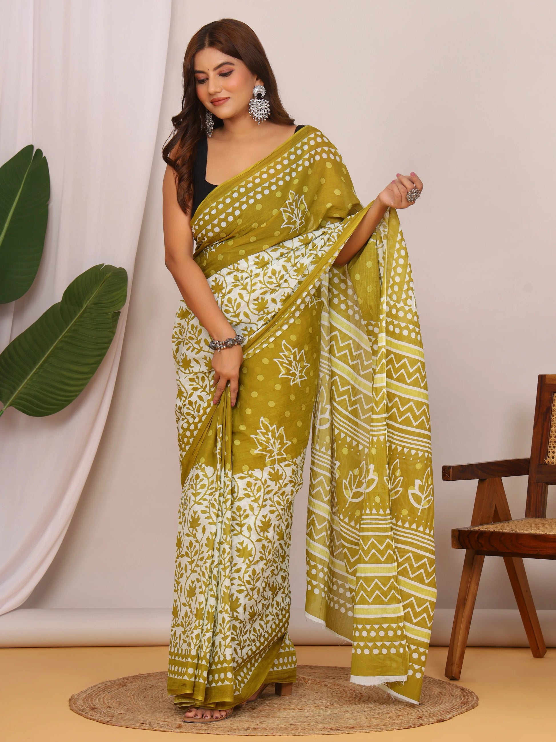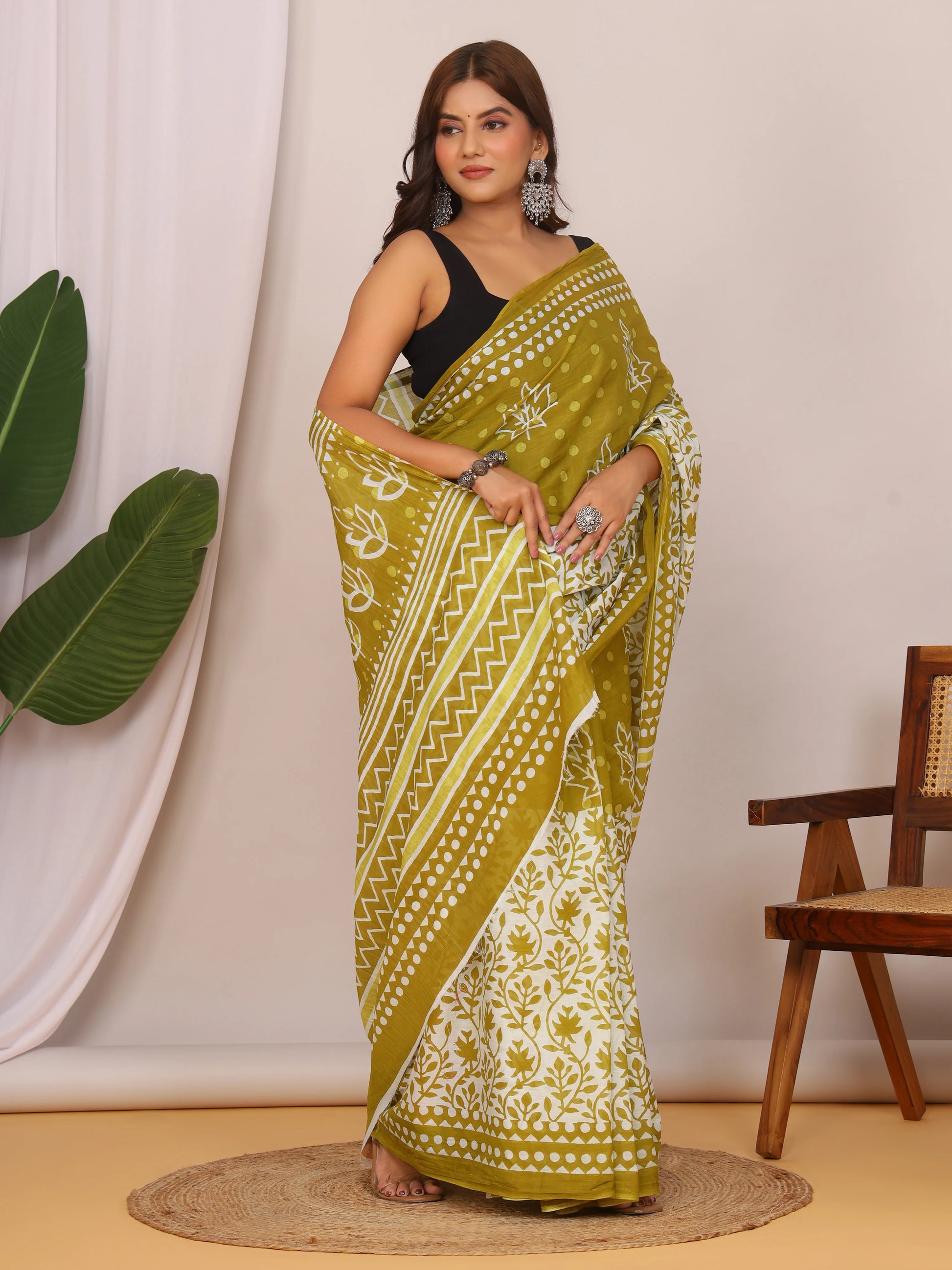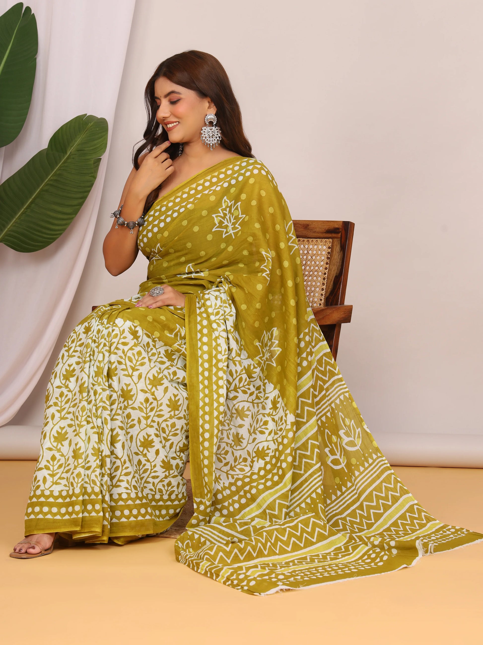 Pure Cotton Olive Green and White Saree with Traditional Floral Sanganeri Print