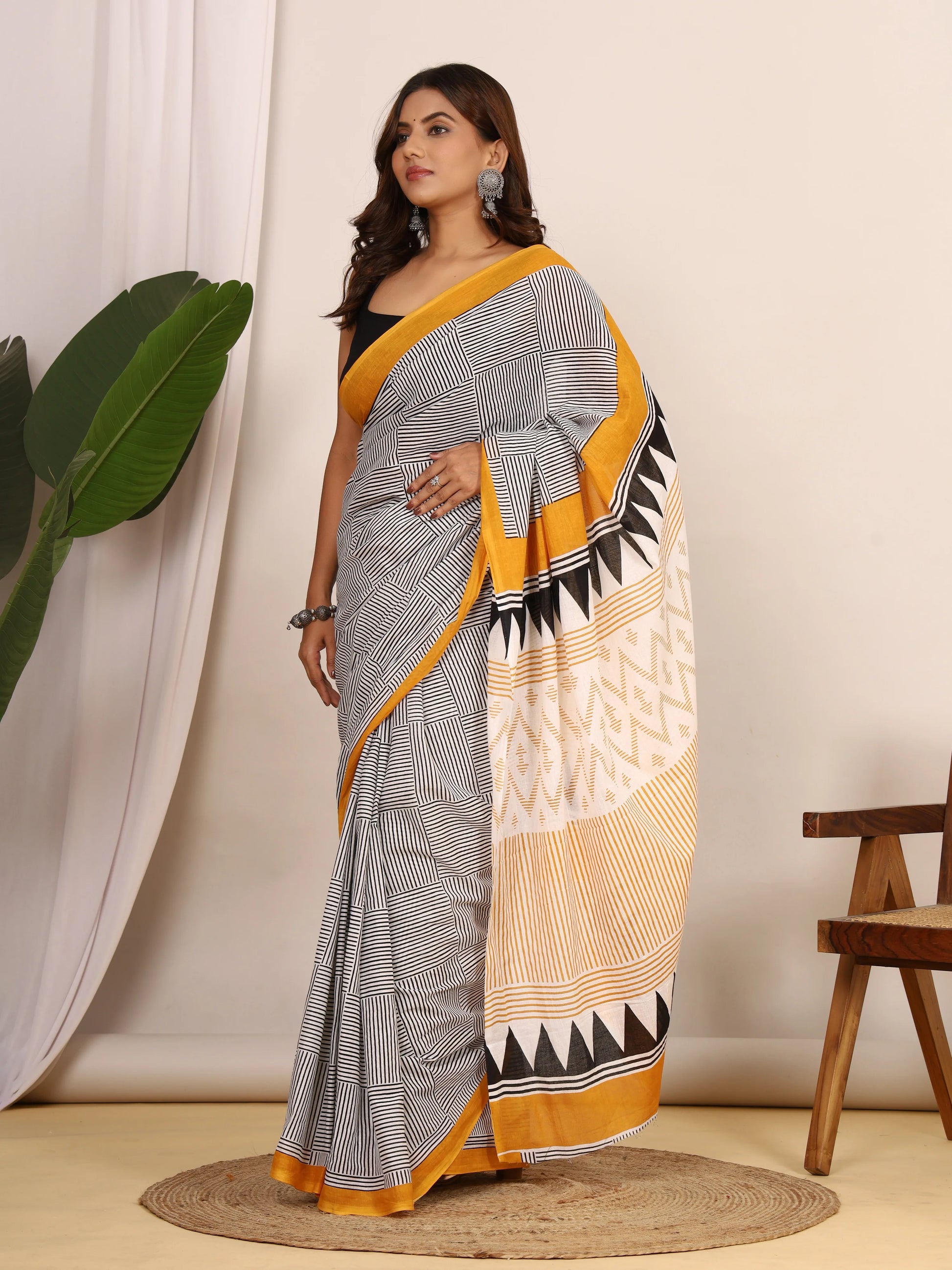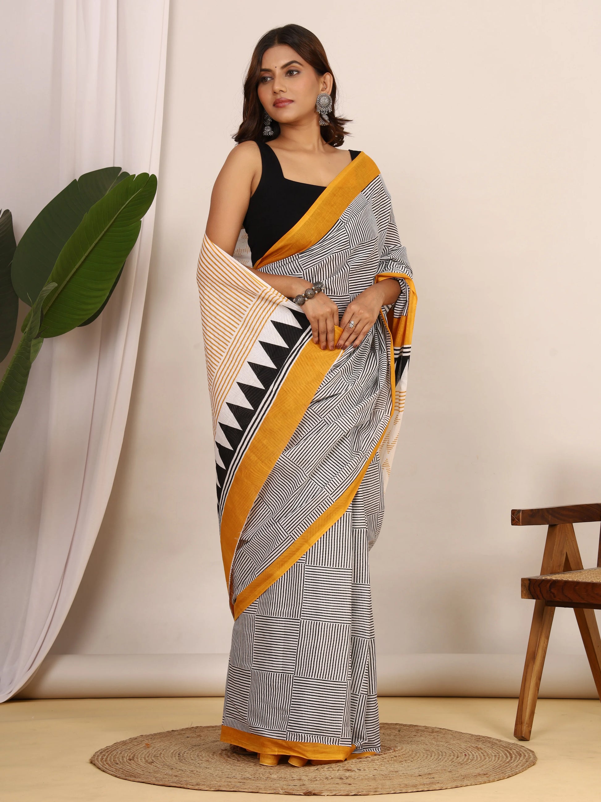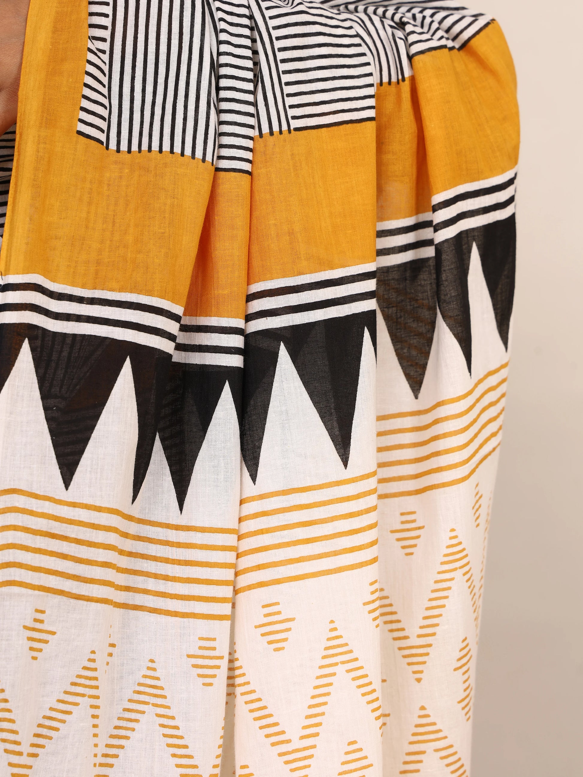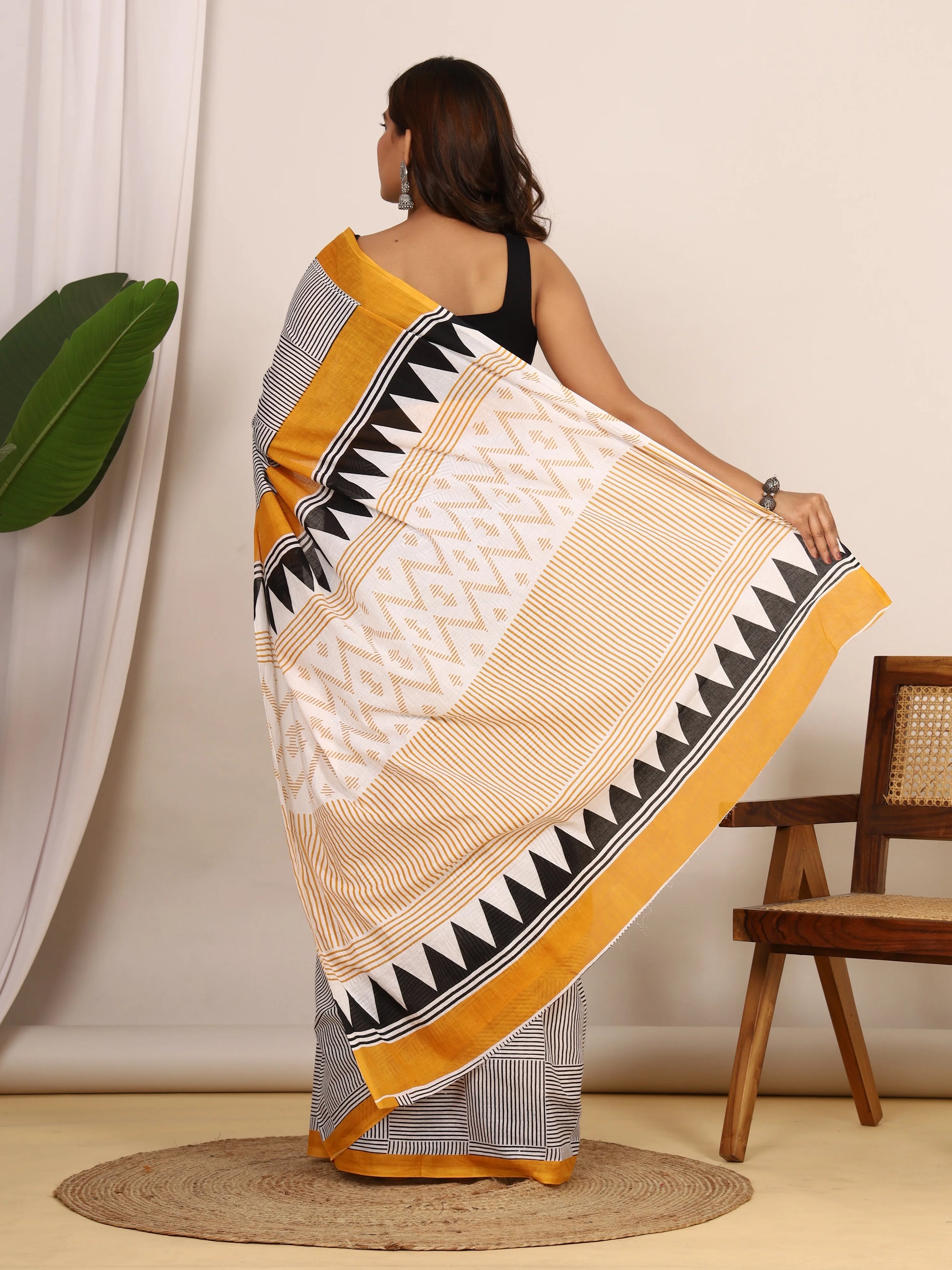 Pure Cotton White and Black Saree with Mustard Accents and Bold Geometric Print
