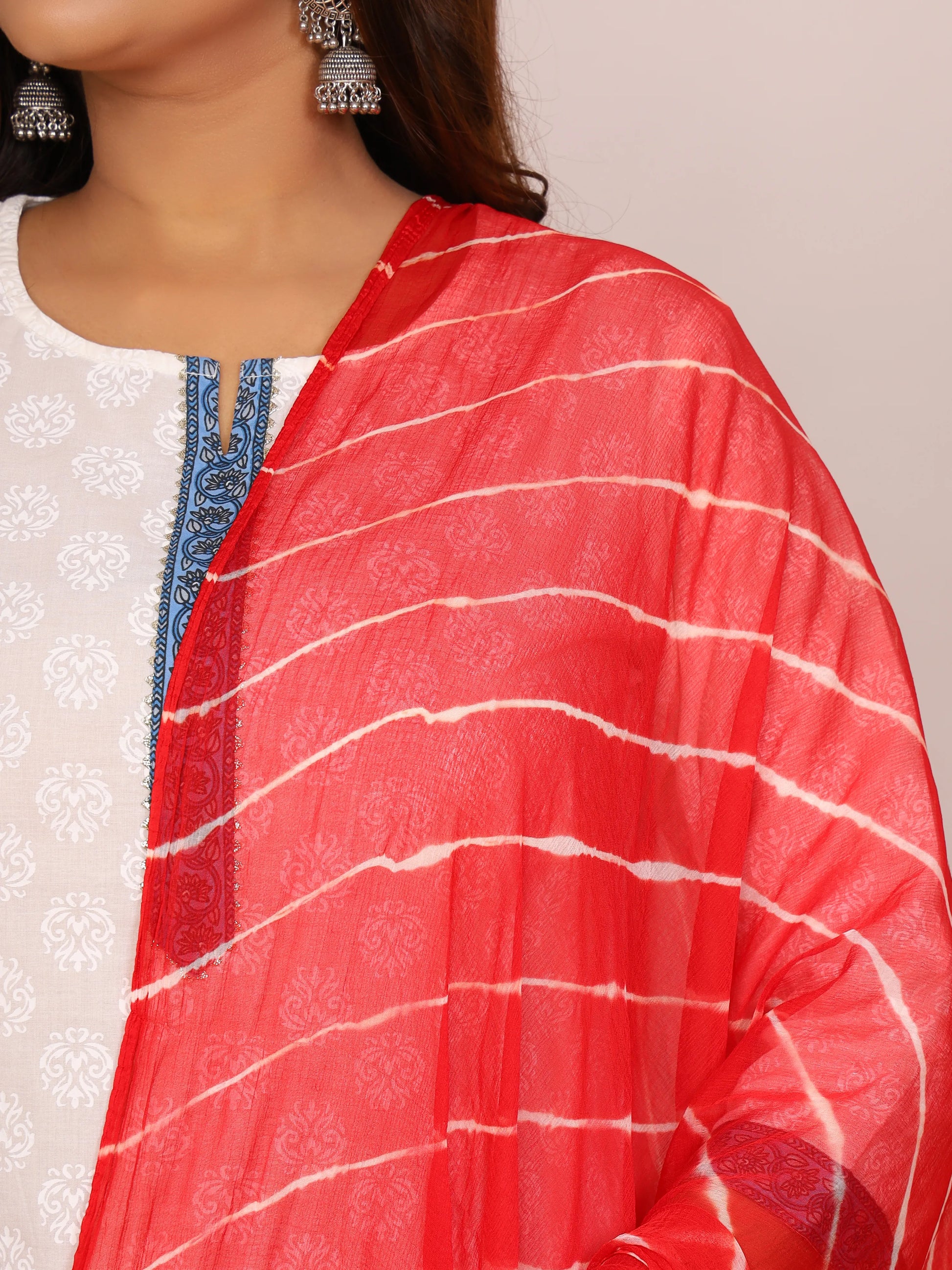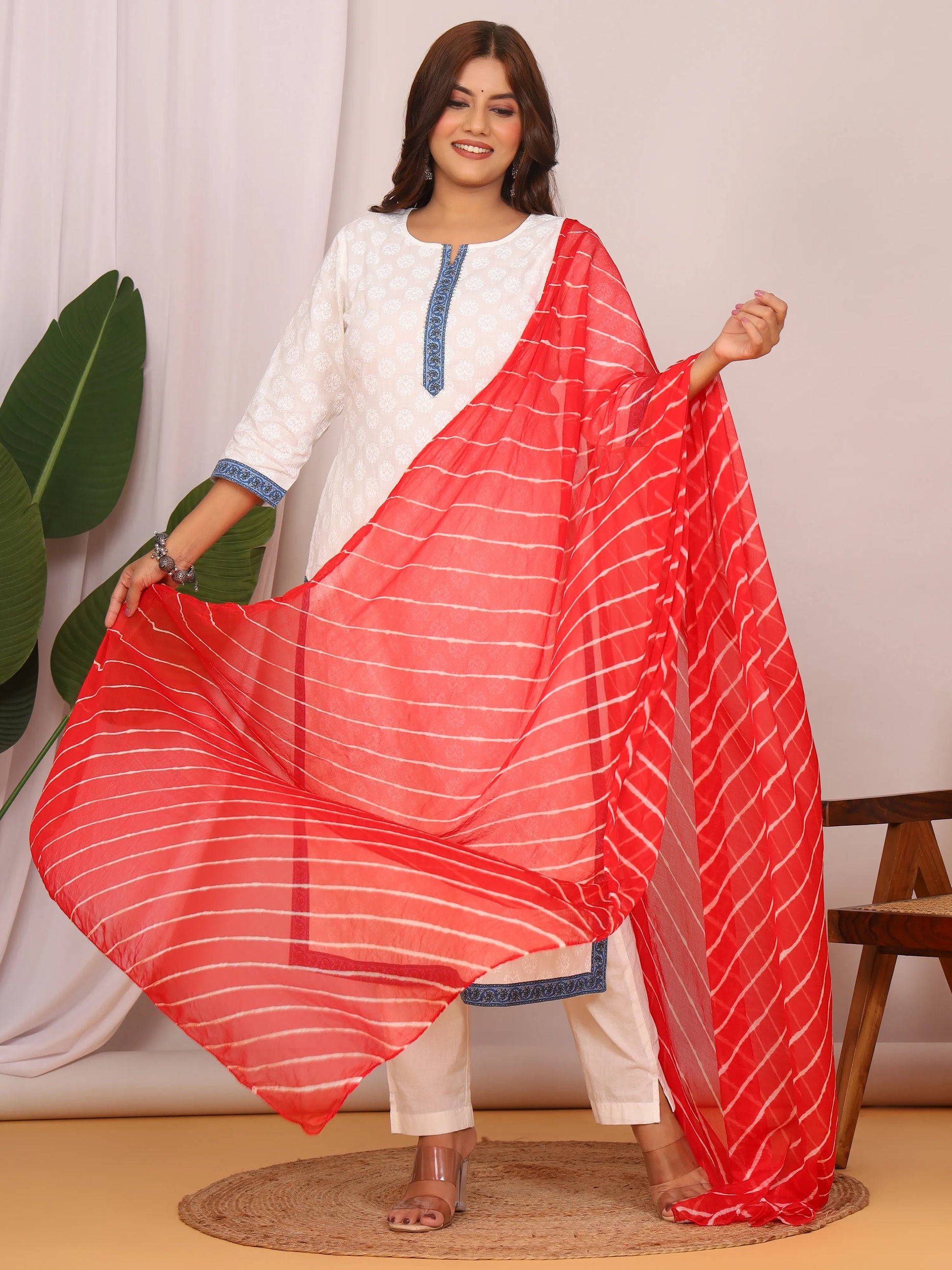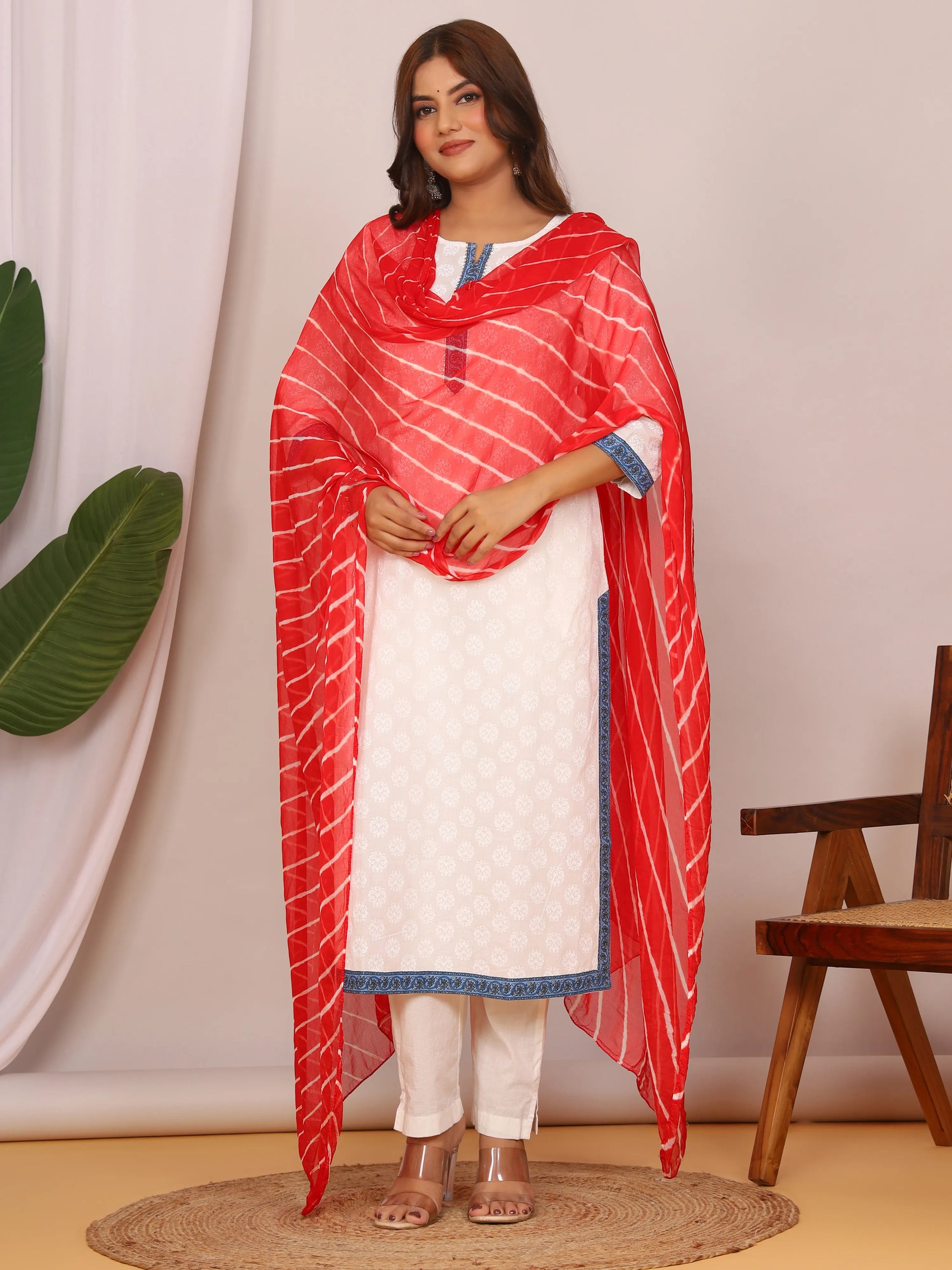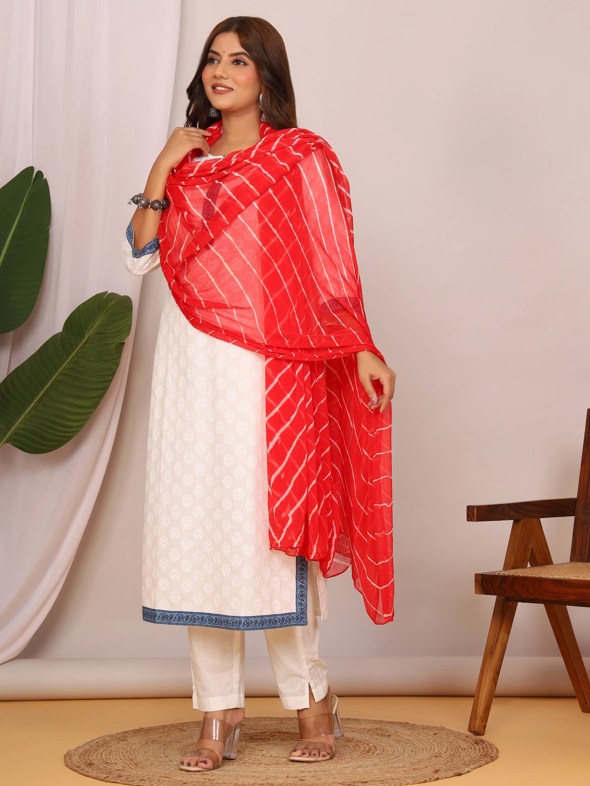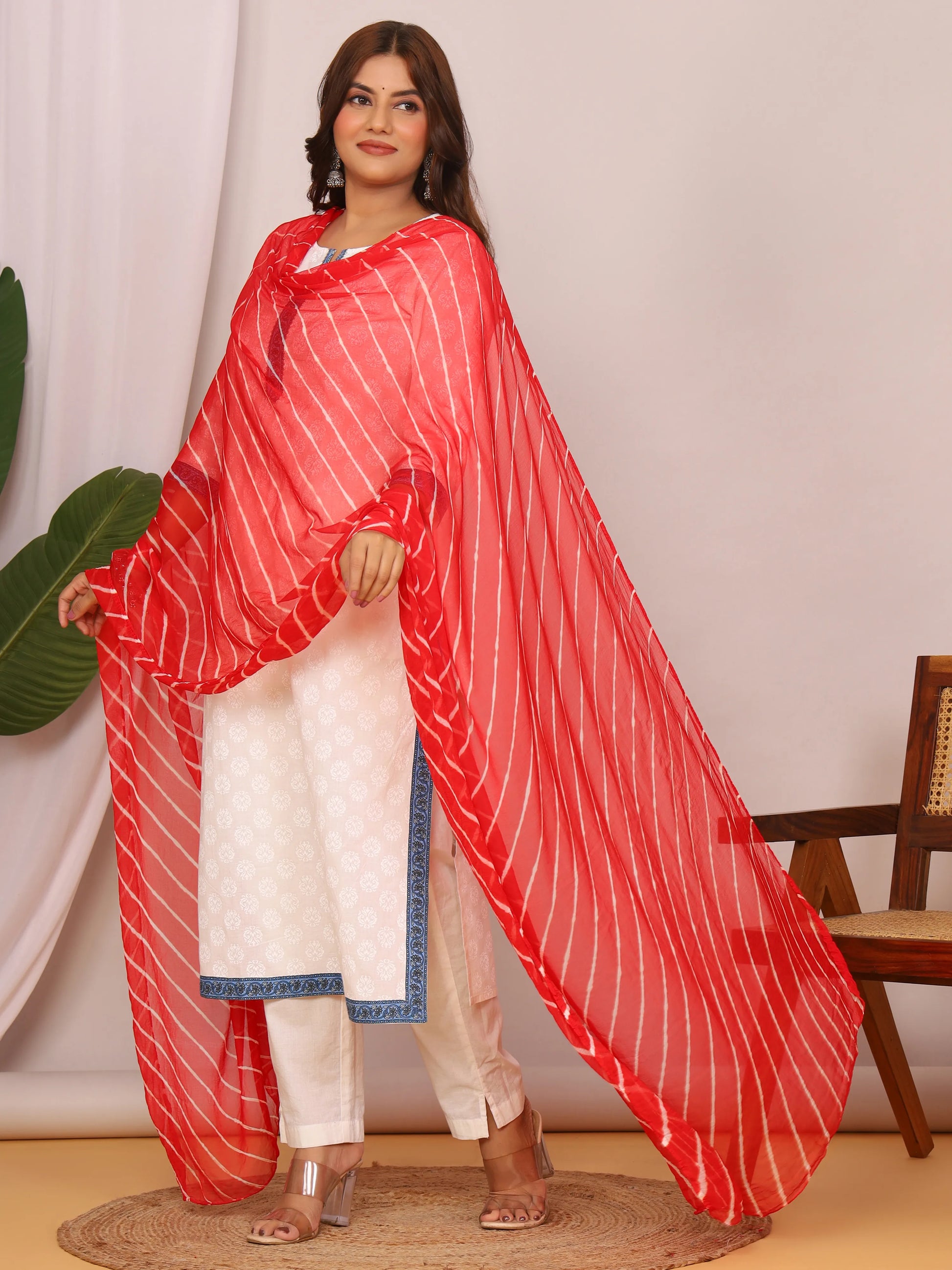 Add a timeless splash of Rajasthani elegance to your wardrobe with this Red Nazmin Chiffon Leheriya Dupatta, crafted for effortless grace and everyday comfort. The rich red base is beautifully patterned with traditional white hand-tied Leheriya stripes, a design that symbolizes heritage and festive charm. Made from lightweight Nazmin chiffon, it drapes smoothly with a breezy, flowy texture that feels soft against the skin, making it perfect for all-day wear.