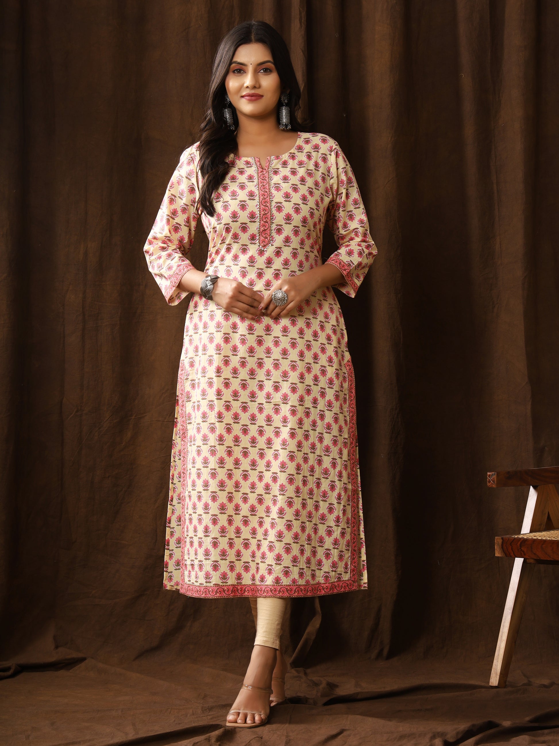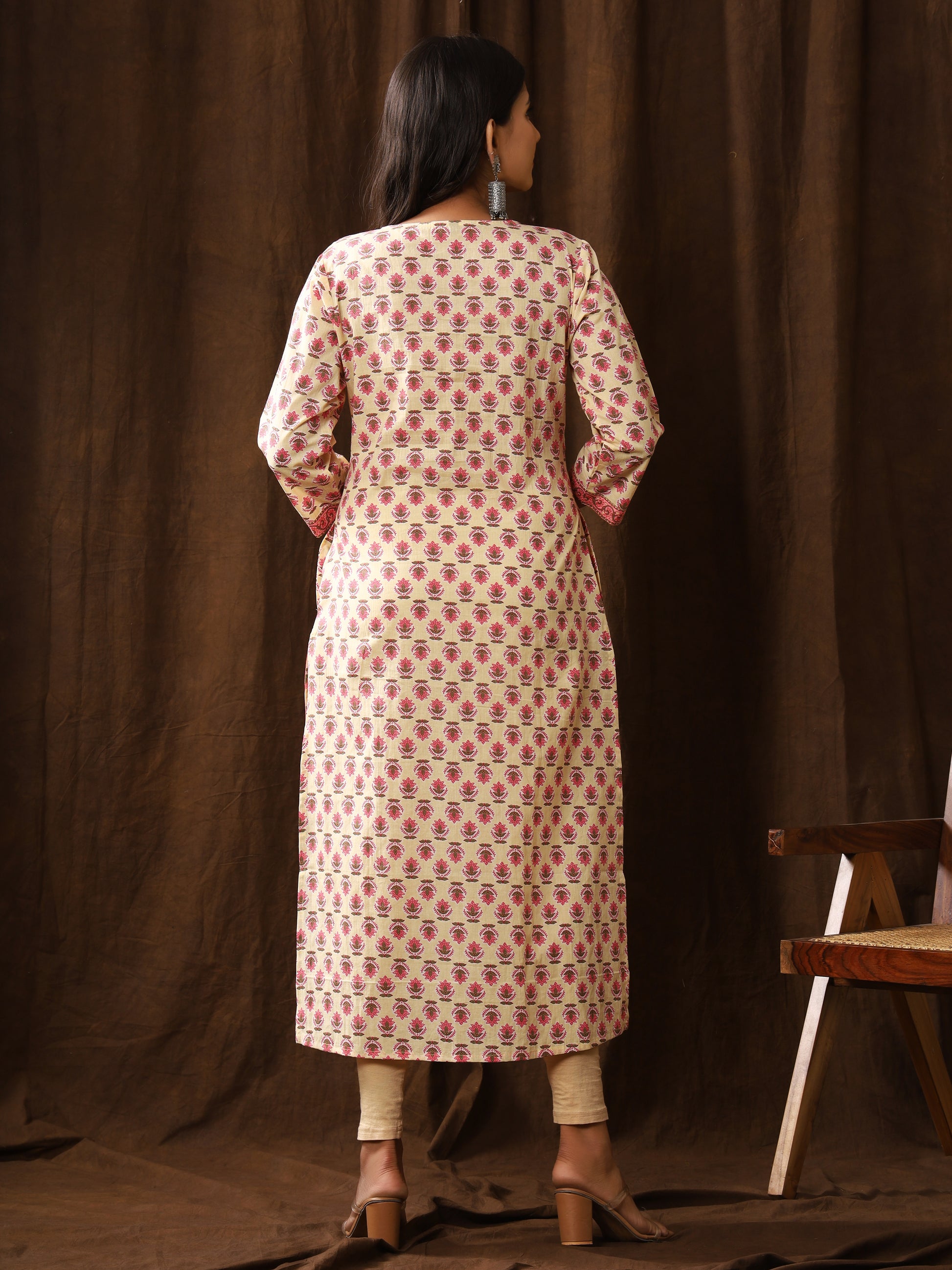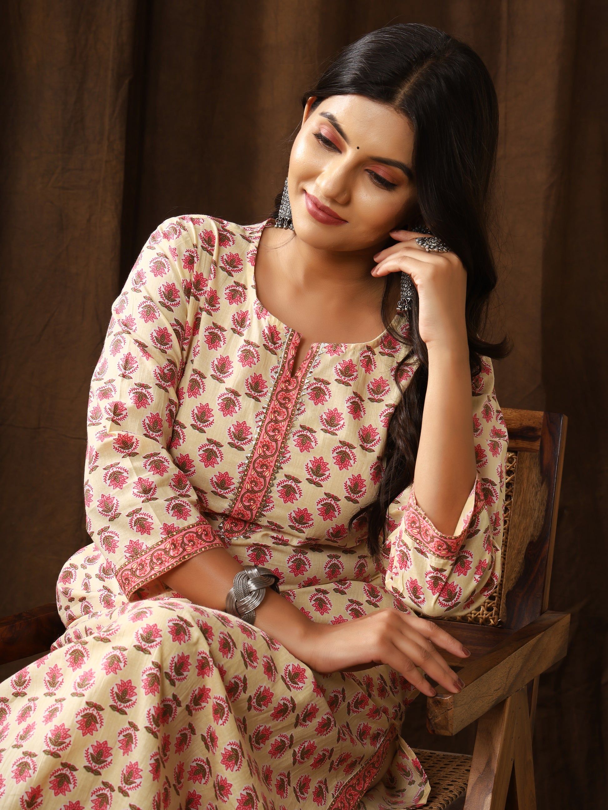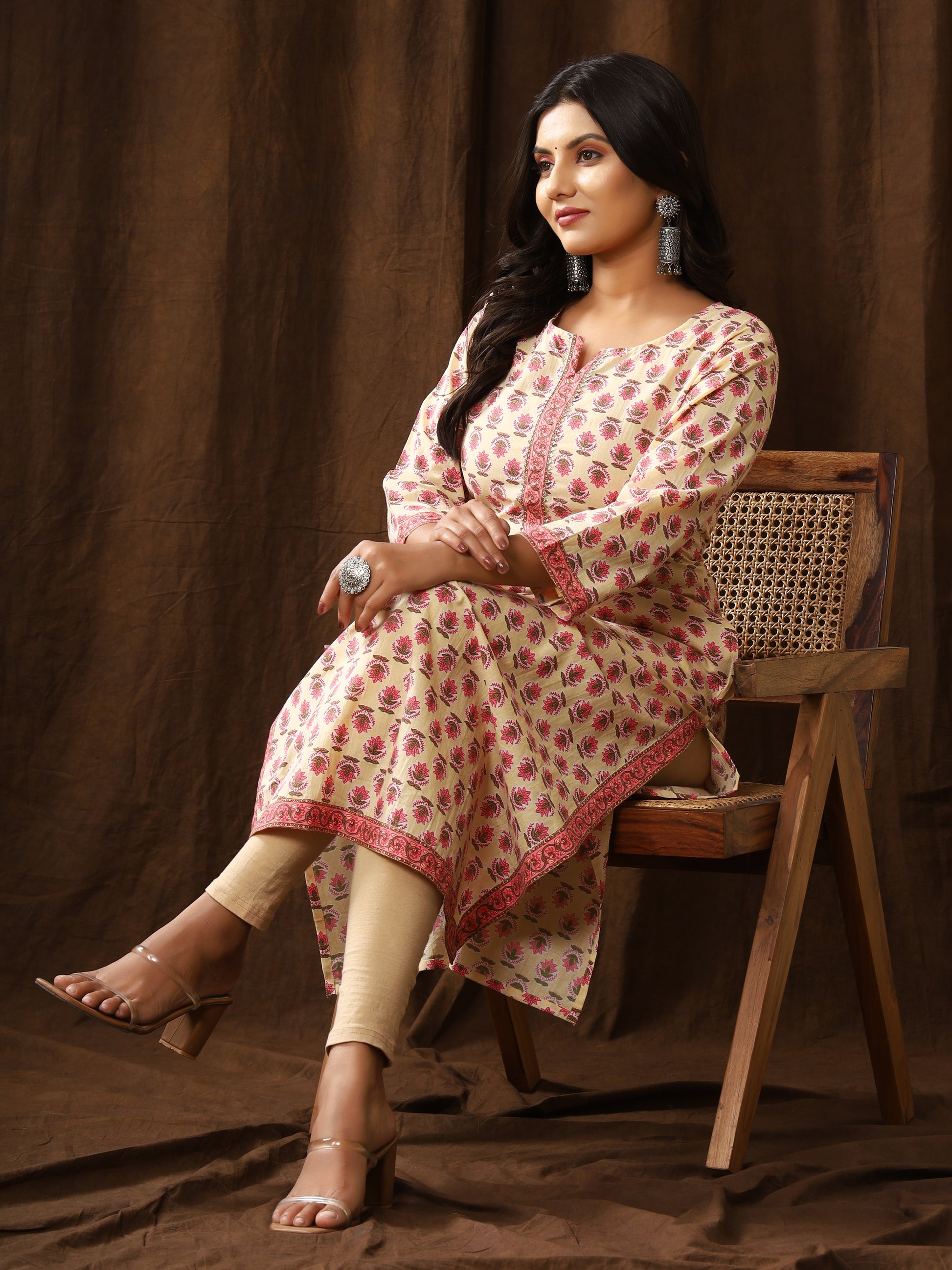Sanganeri Gulmohar Buti Print Light Yellow Cotton Kurti