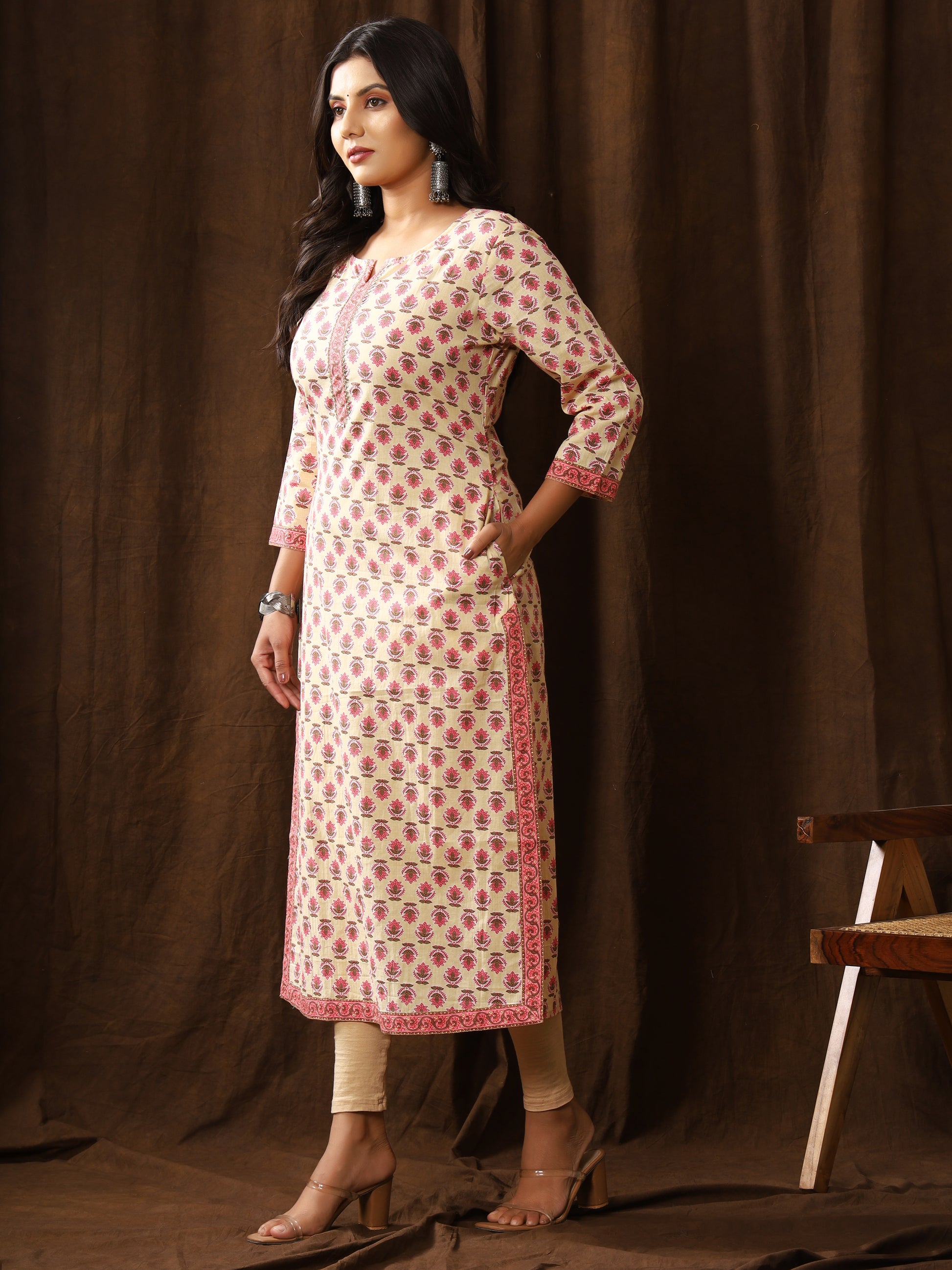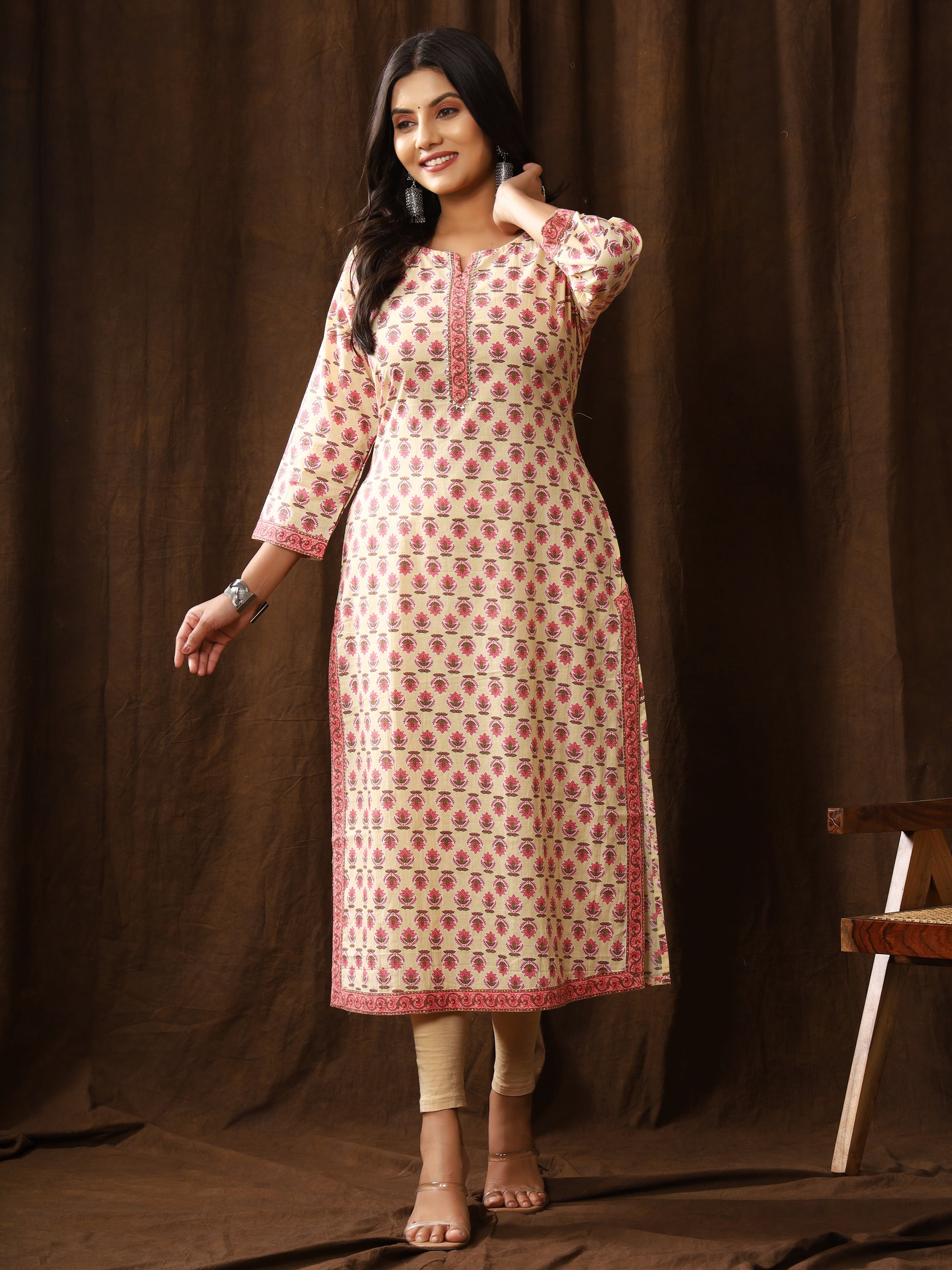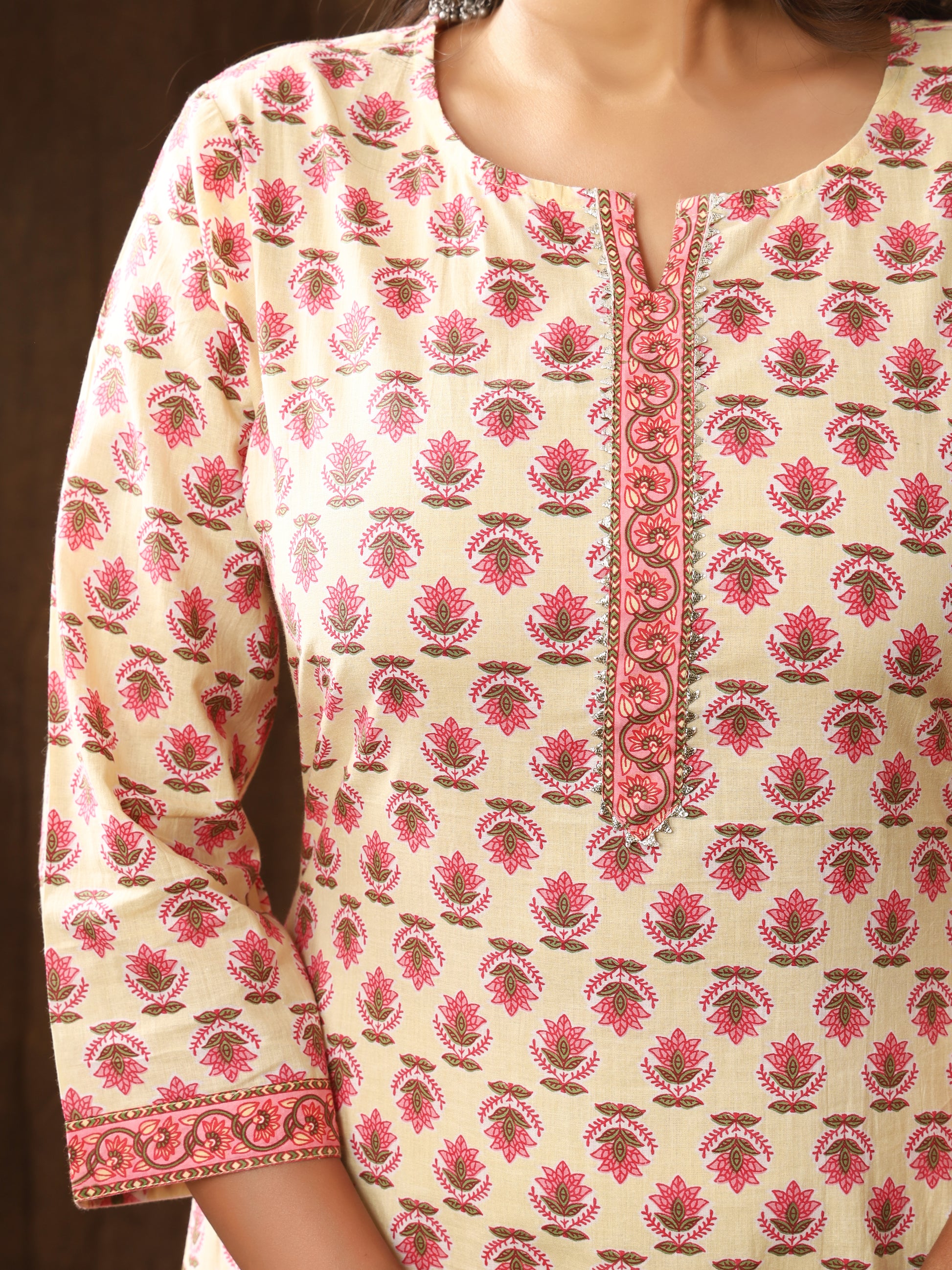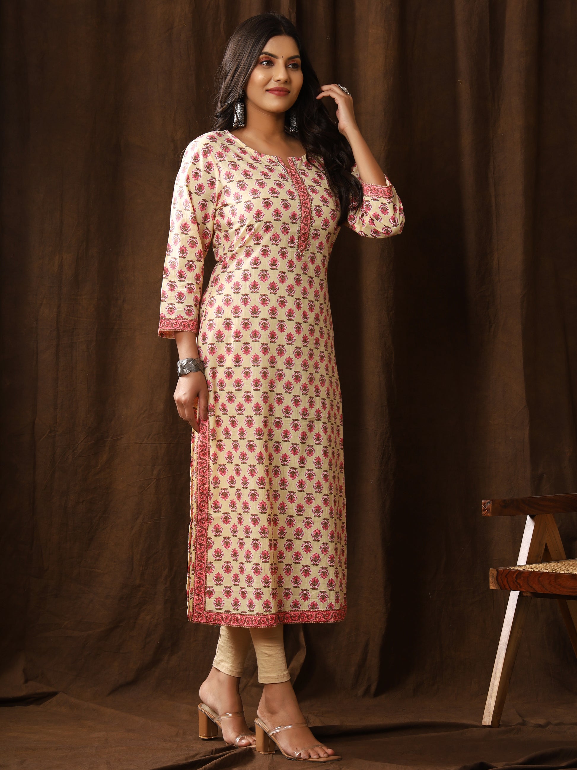 Sanganeri Gulmohar Buti Print Light Yellow Cotton Kurti