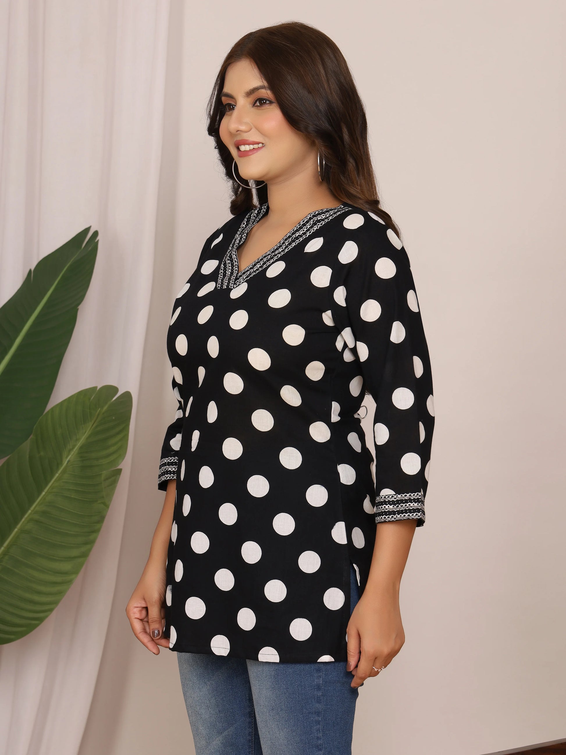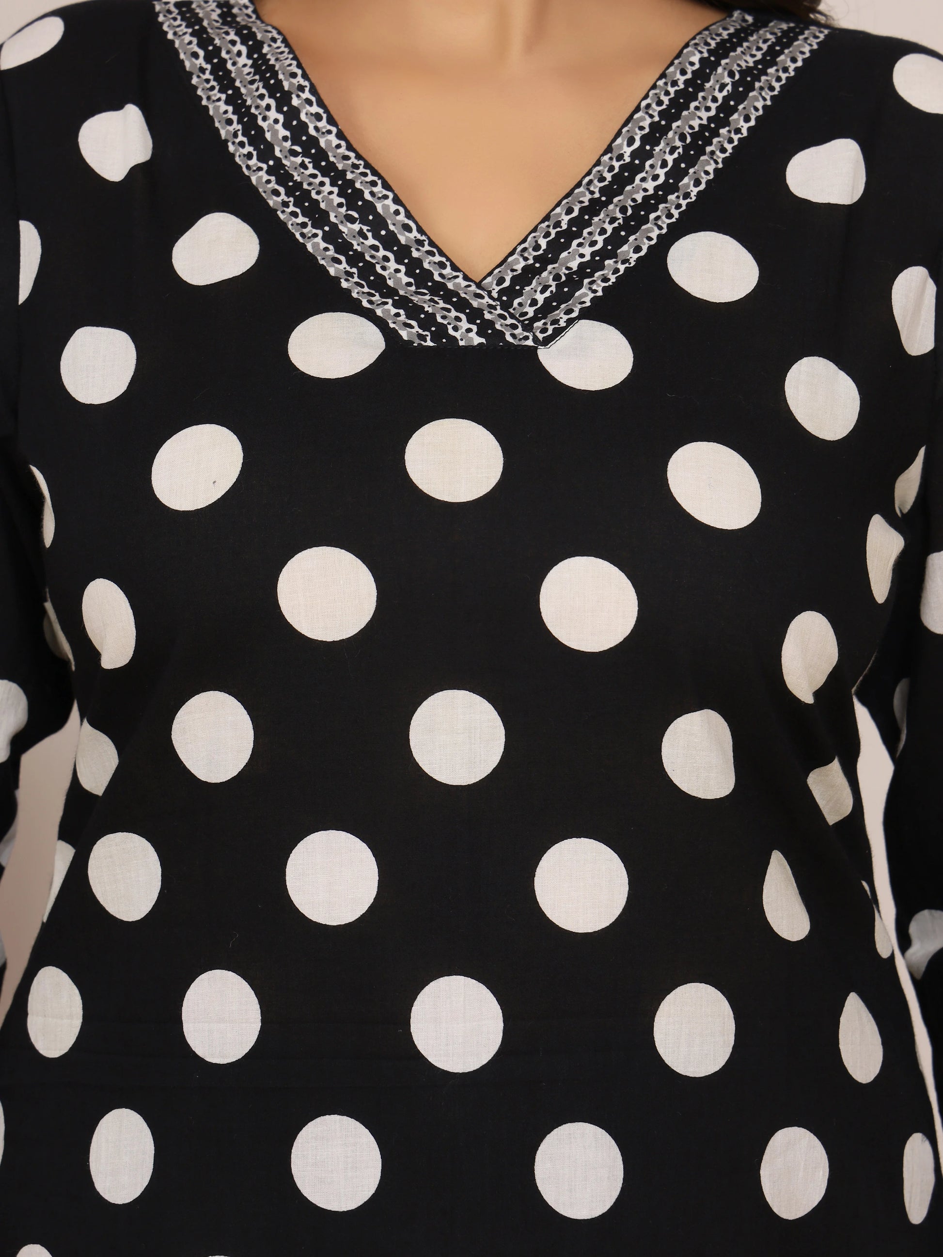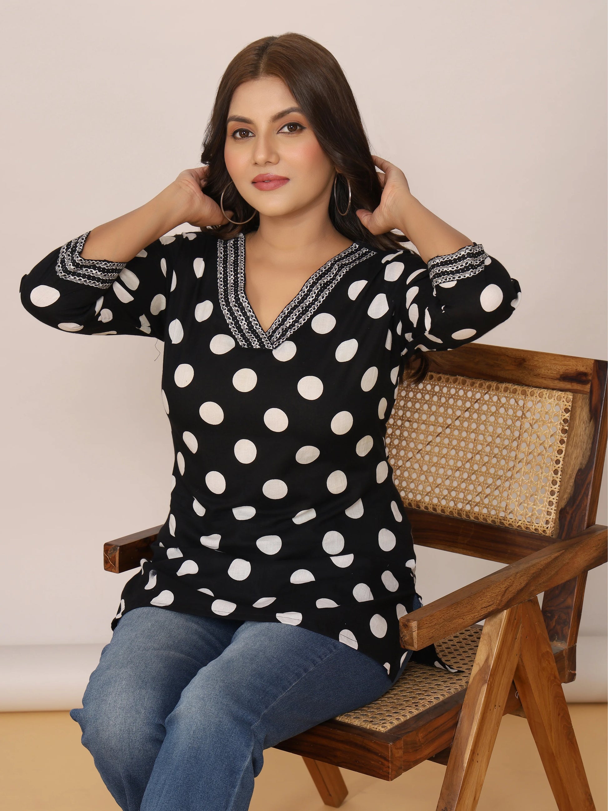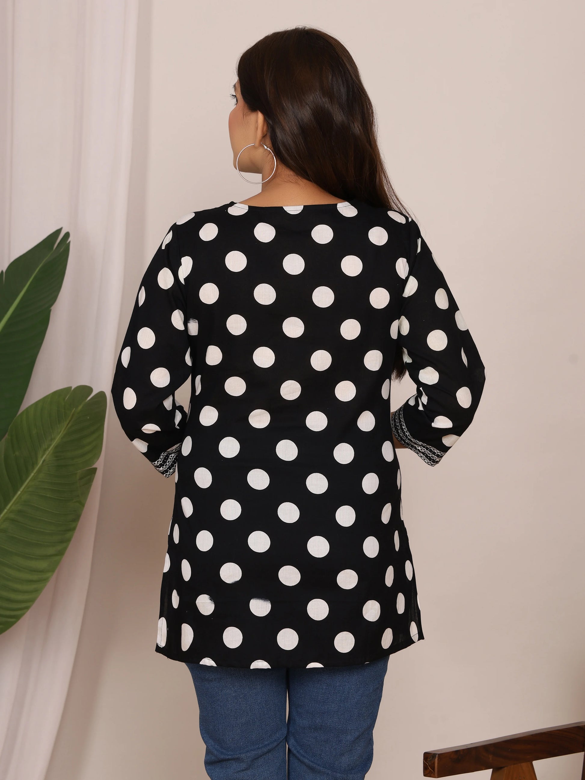 Step into timeless elegance with this classic black cotton top, highlighted with bold white polka dots and intricate embroidered details on the neckline and sleeve hems. The wide V-neck with contrast threadwork lends a graceful, feminine touch, while the 3/4th sleeves add comfort and ease to your everyday wear.
