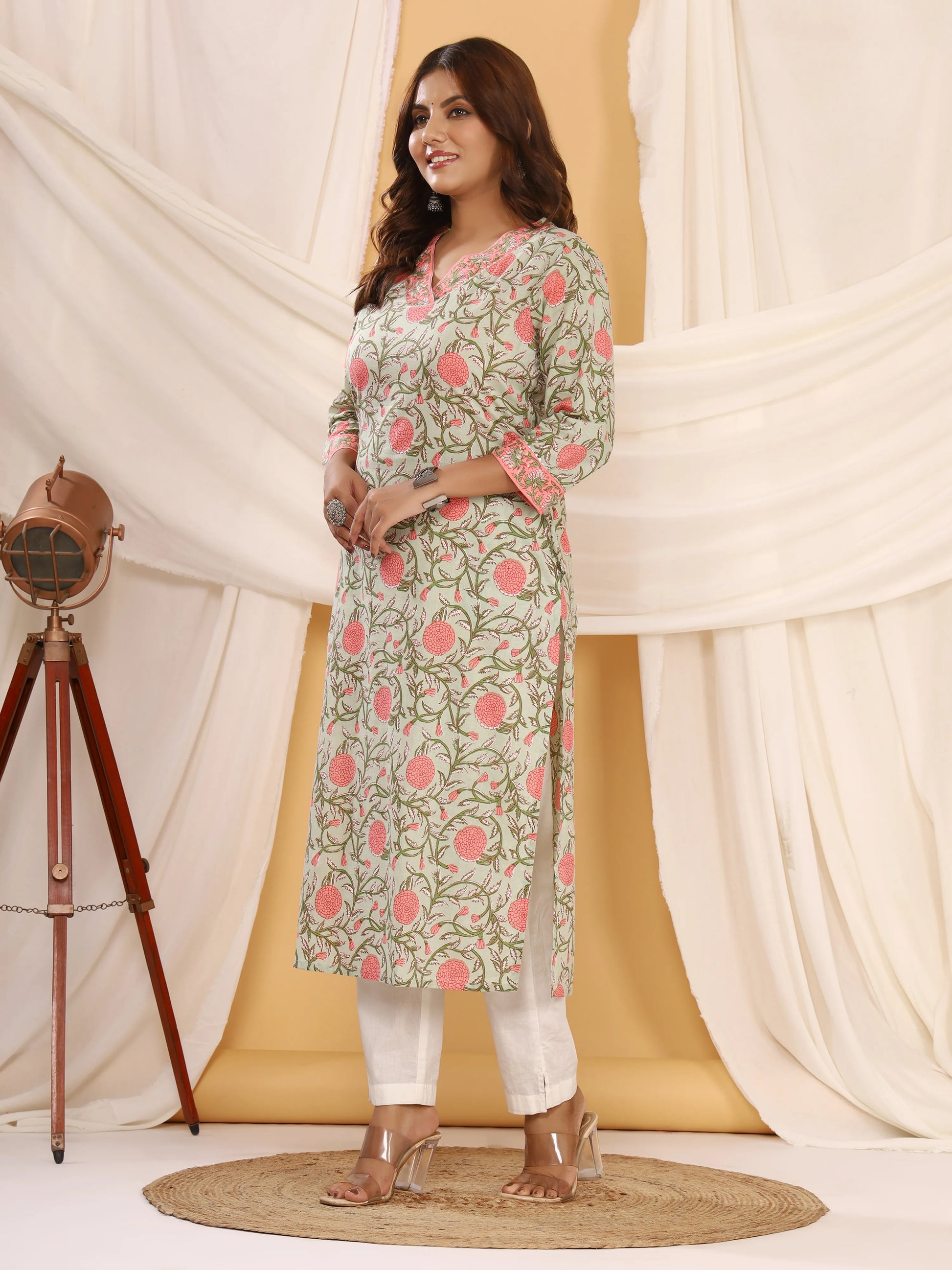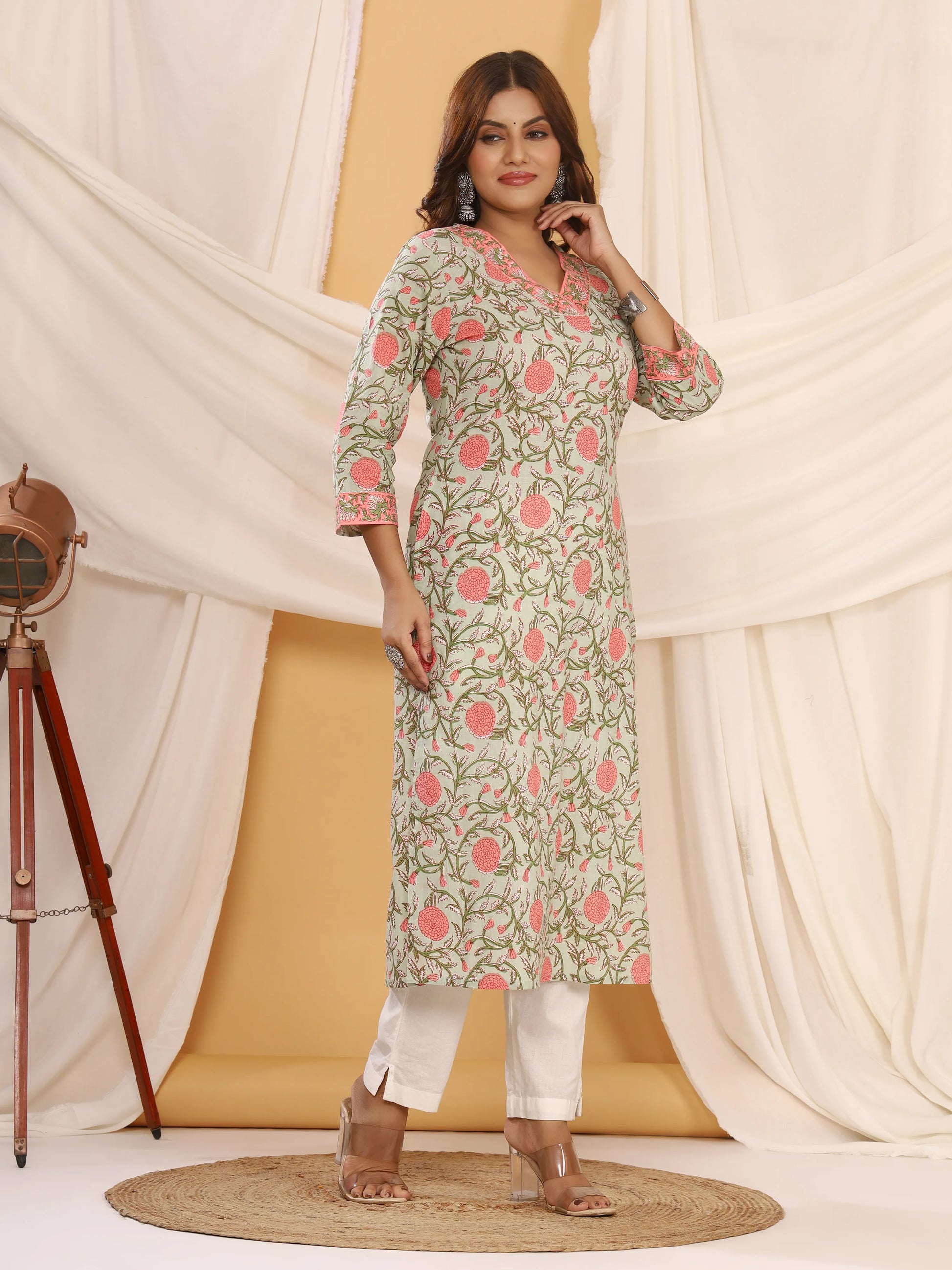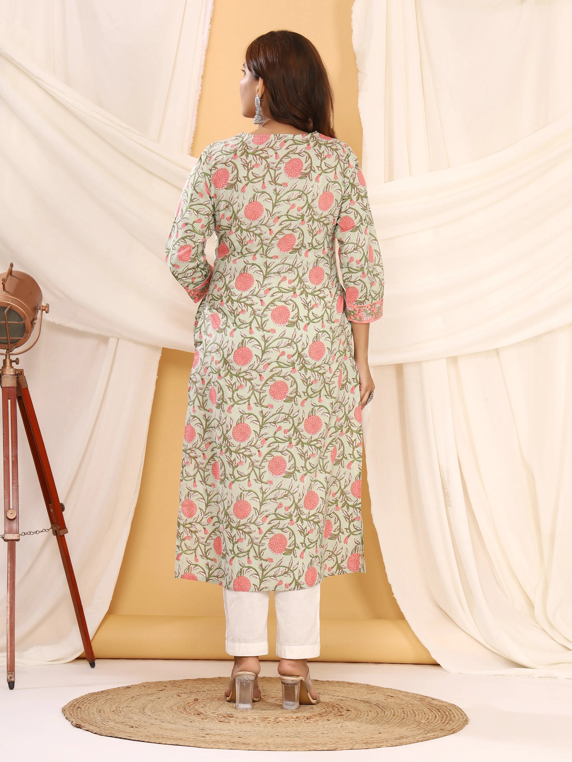 Sanganeri Floral Print Sage Green Cotton Kurti
