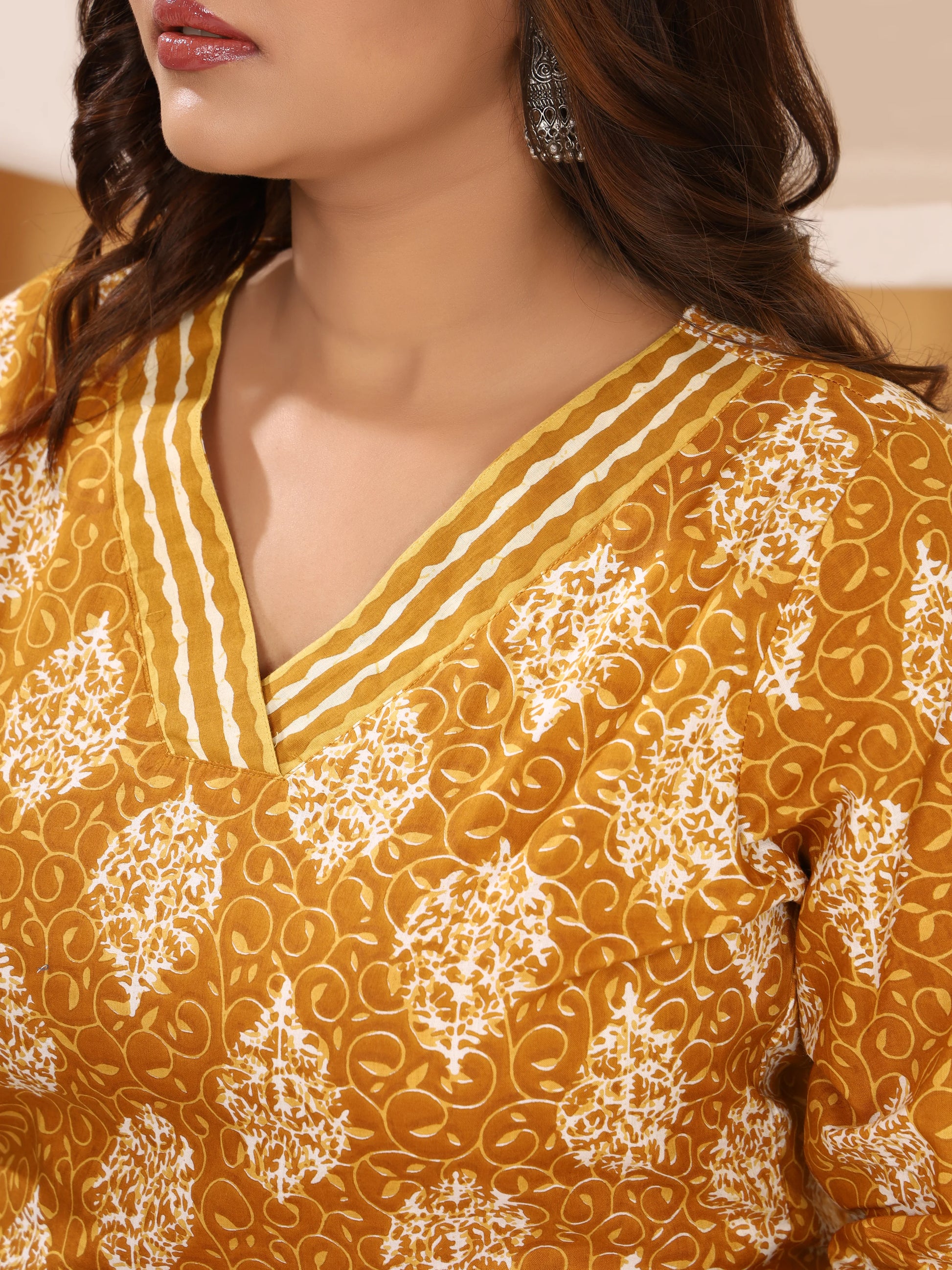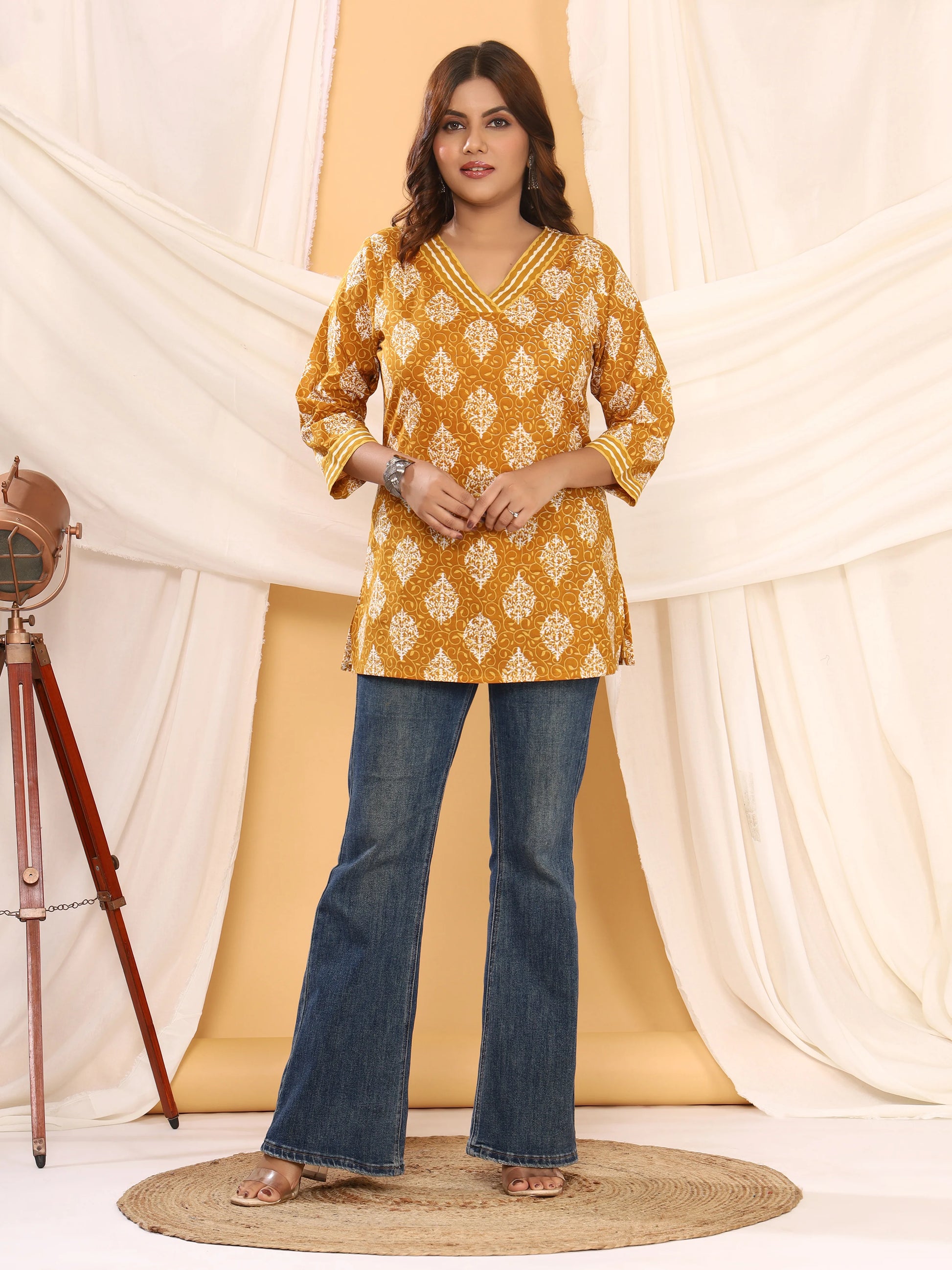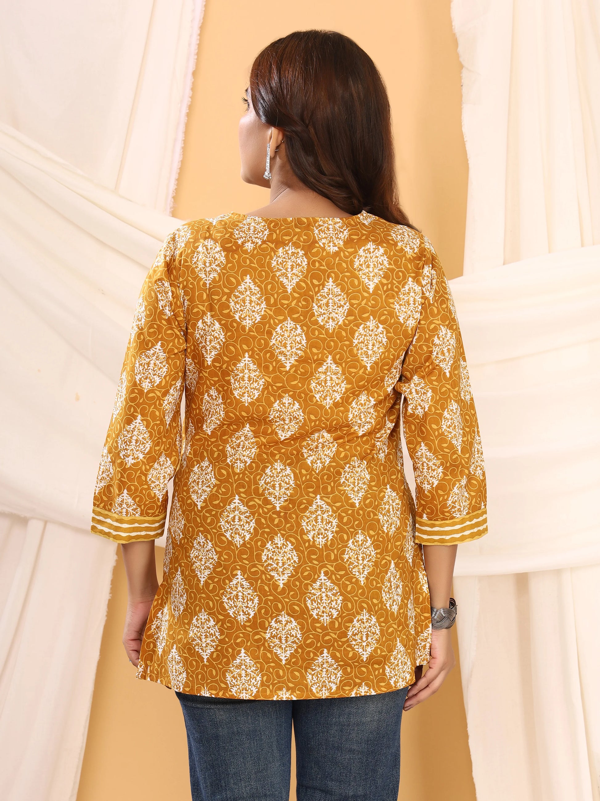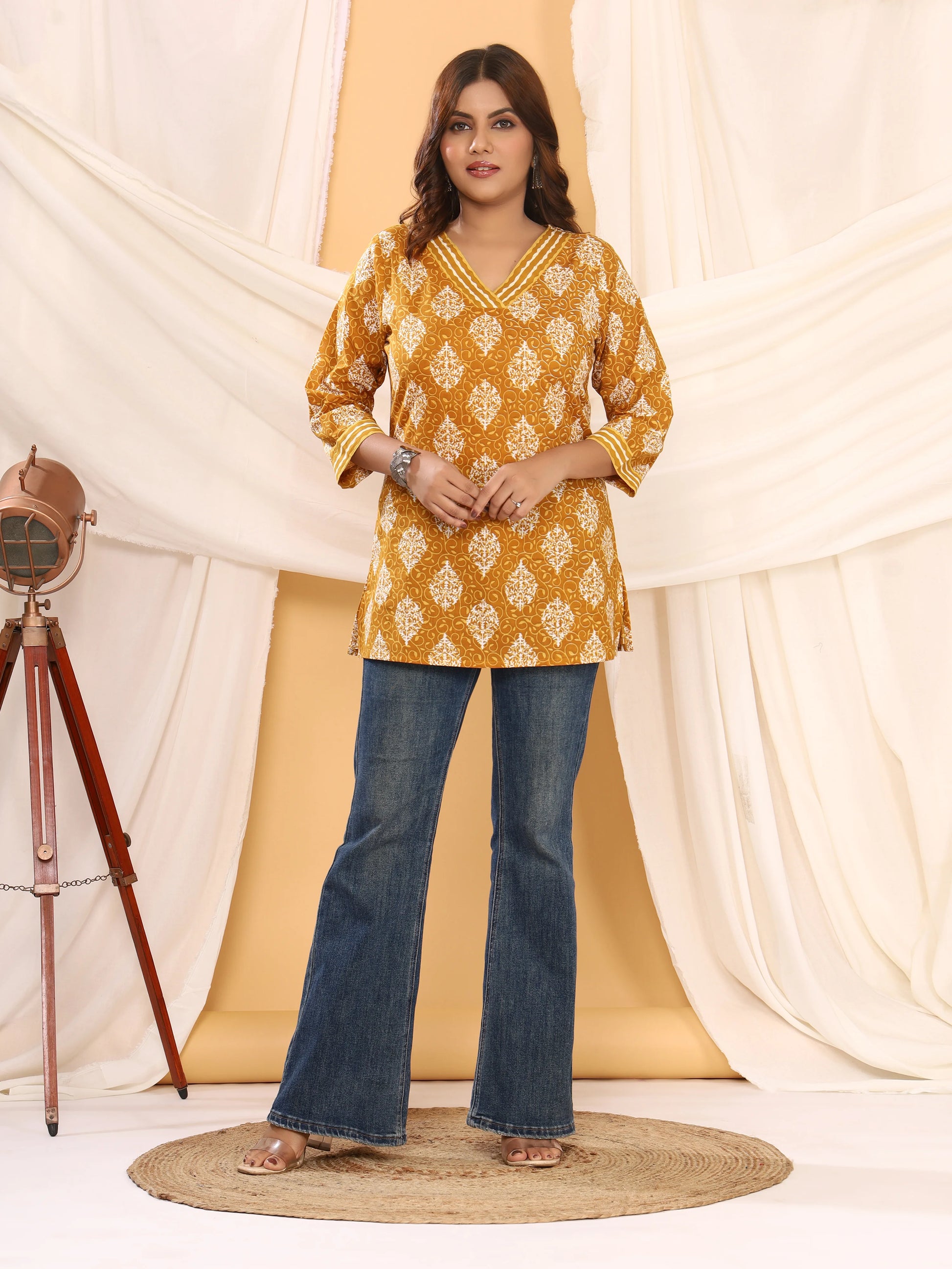 Add a warm, earthy vibe to your wardrobe with this Sanganeri-inspired mustard yellow cotton top. Featuring delicate white floral motifs set against a rich mustard base, it captures the beauty of traditional hand-block aesthetics while keeping the look effortlessly modern.