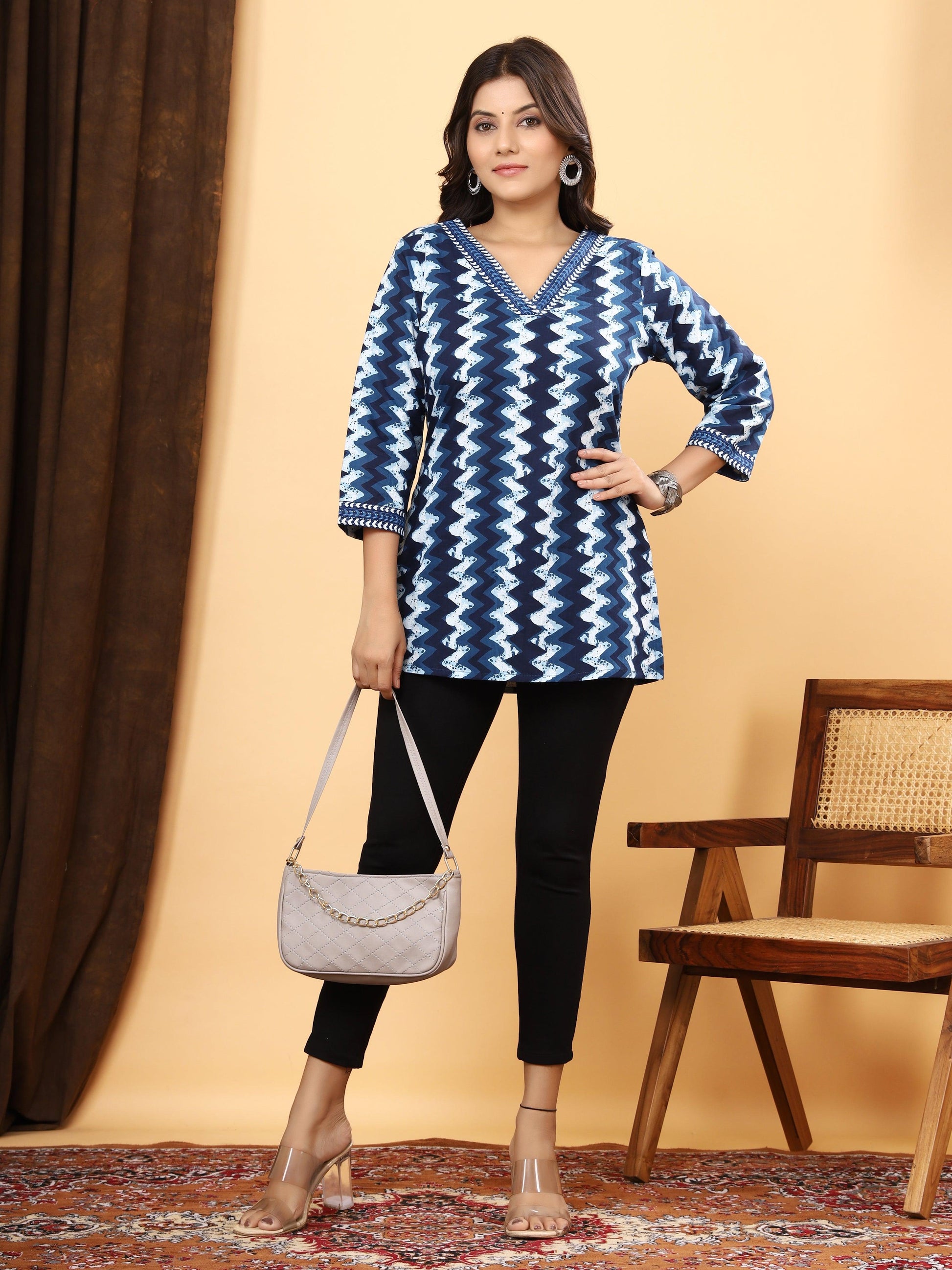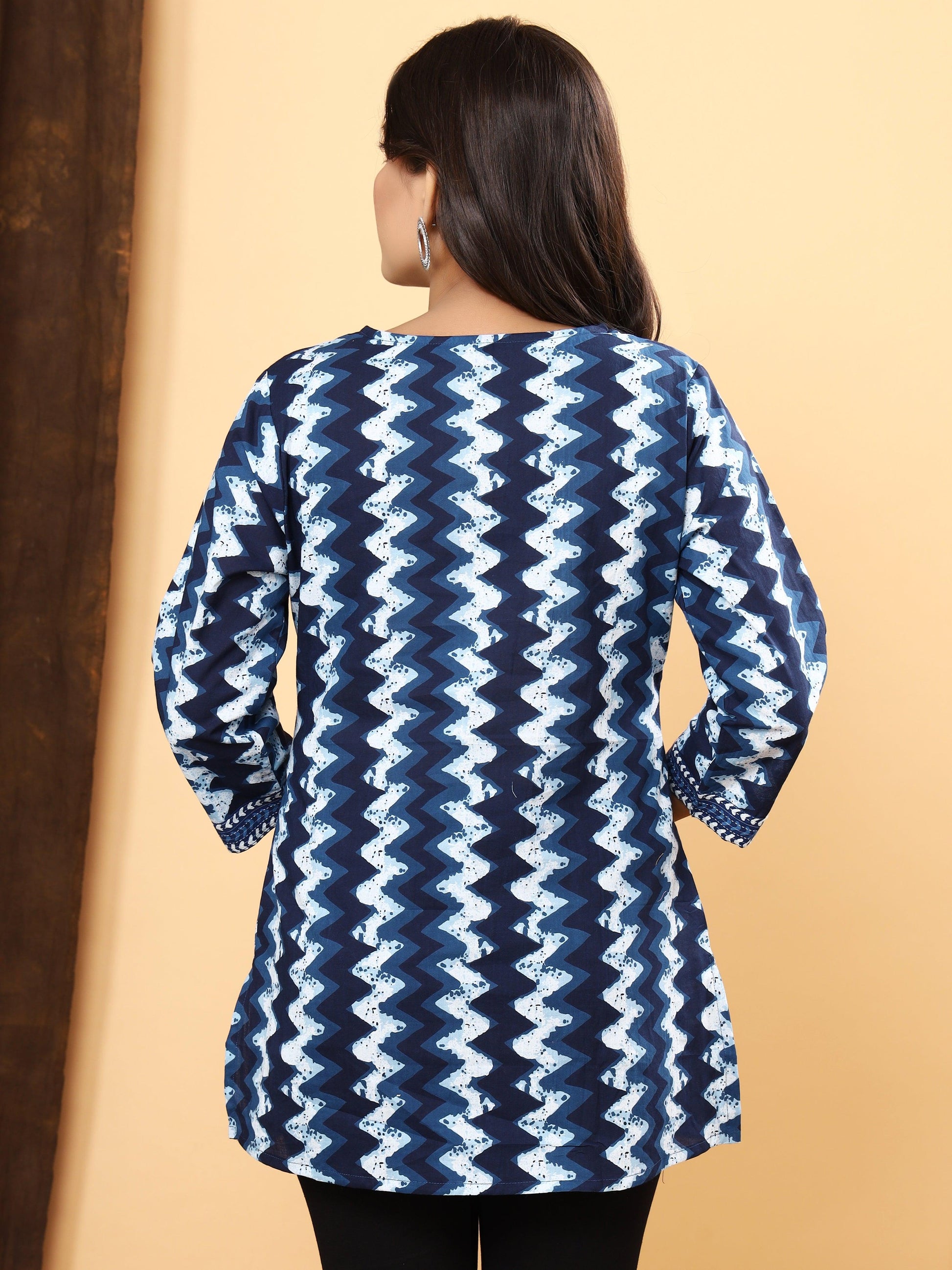 Unleash your style with our Sanganeri Zig Zag Print Cotton Top in striking indigo blue. Crafted from premium pure cotton, this top is designed to provide maximum comfort and breathability, making it an ideal choice for all-day wear. The bold zig zag pattern, meticulously printed with non-reactive dyes, stays vibrant and dynamic even after numerous washes.