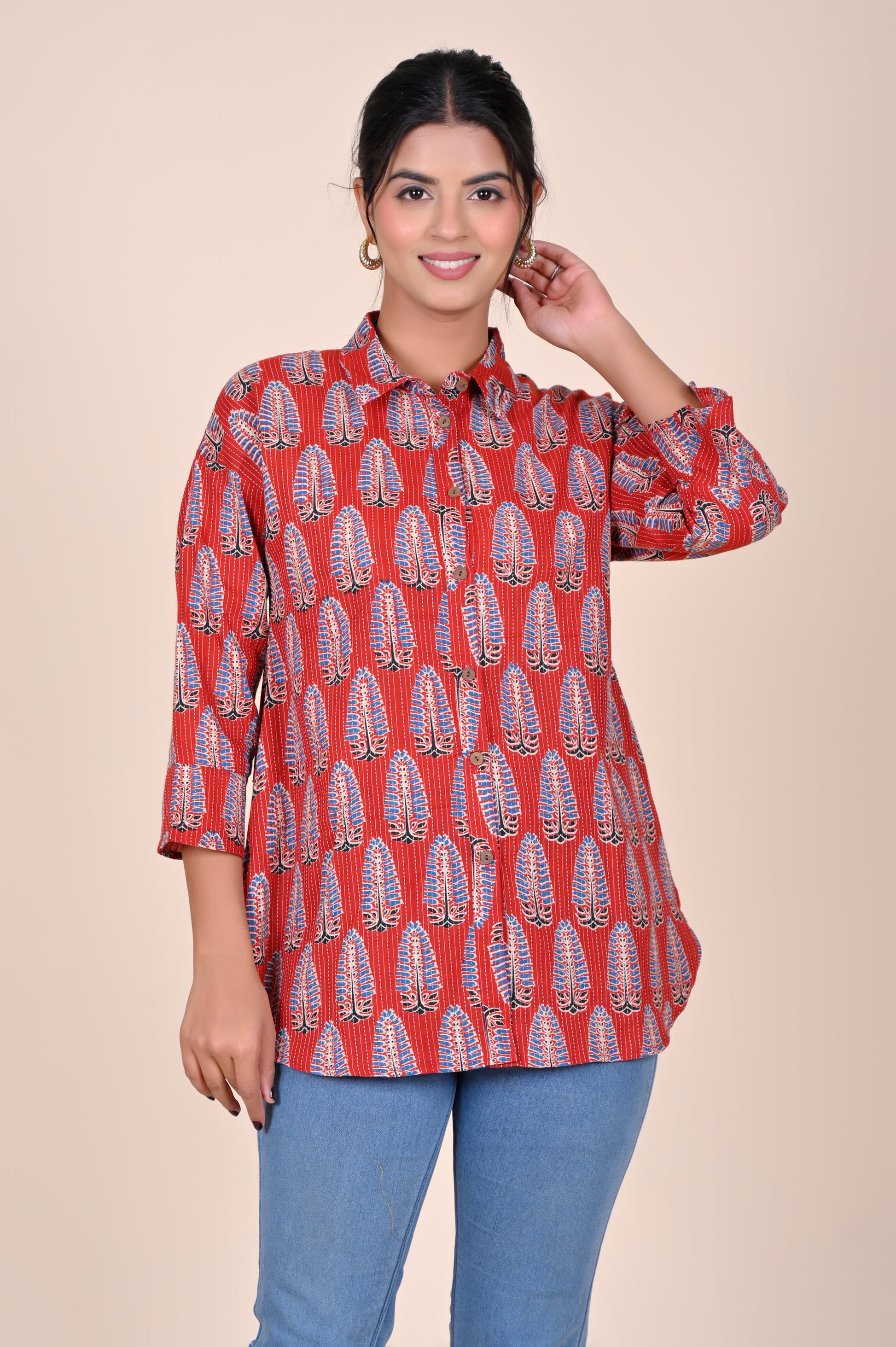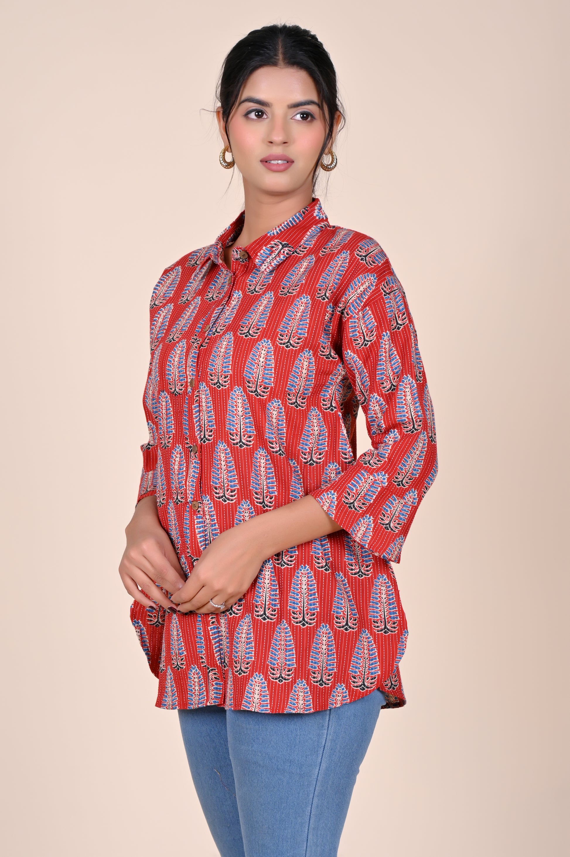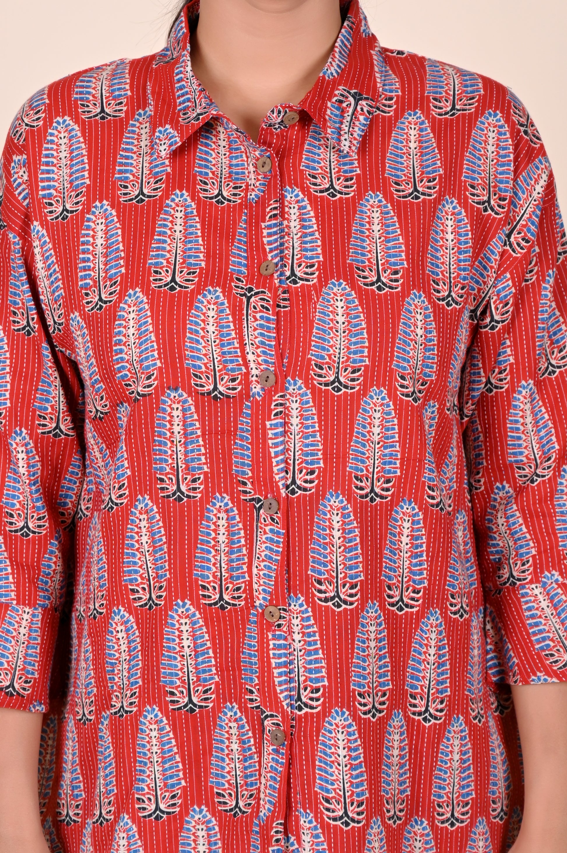 Women's Katha Work Pure Cotton Shirt – Red Azrakh Leaf Buti Design