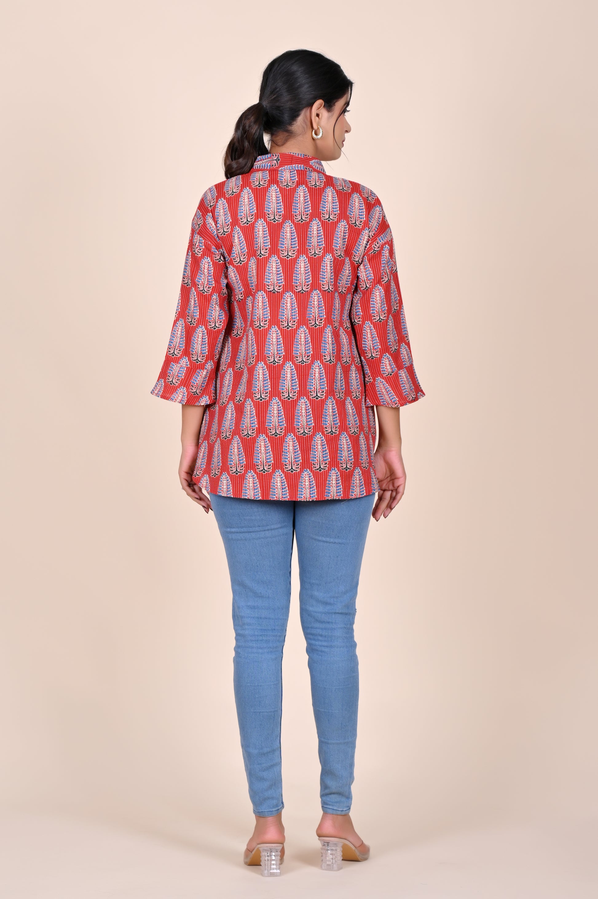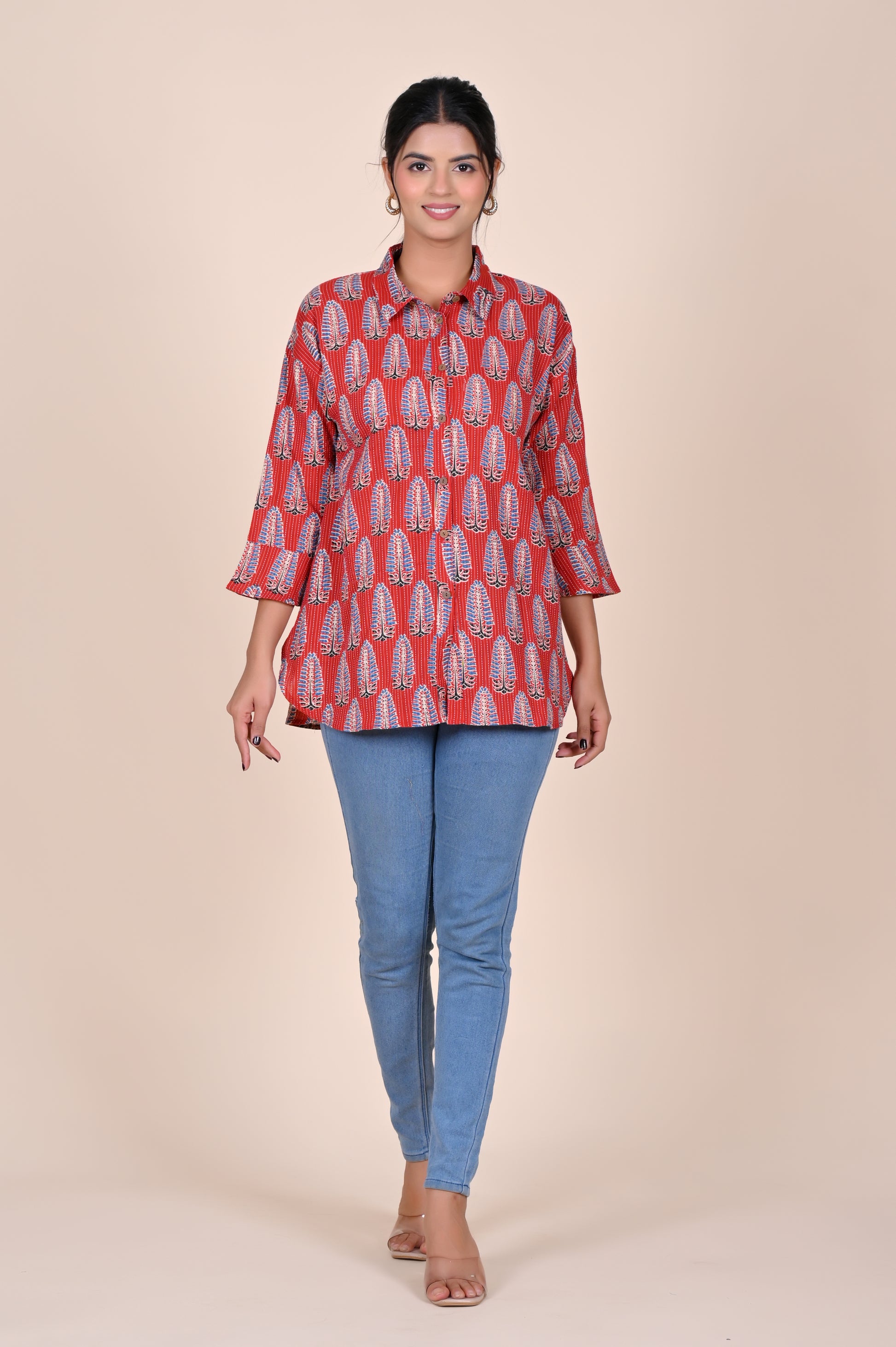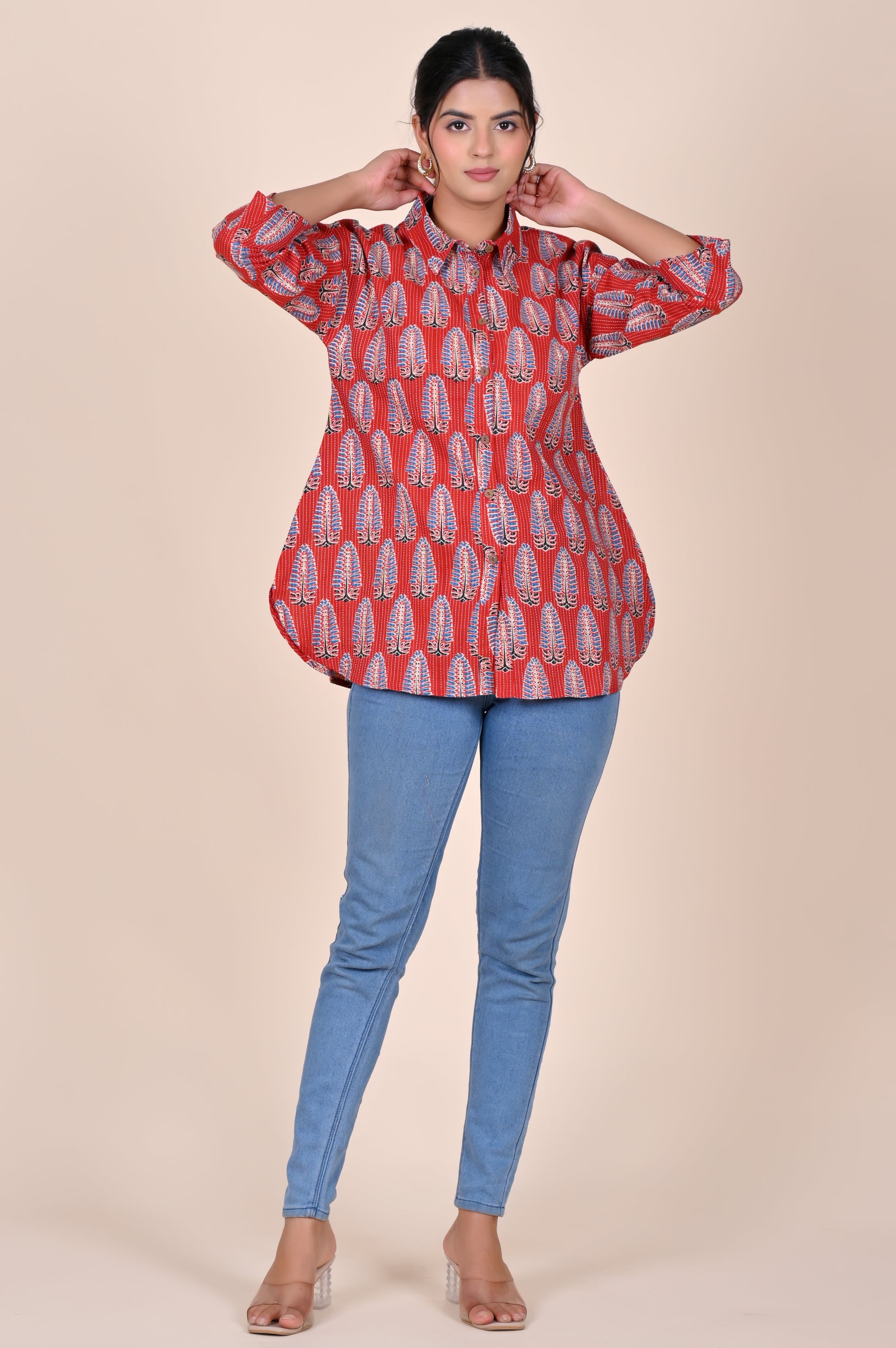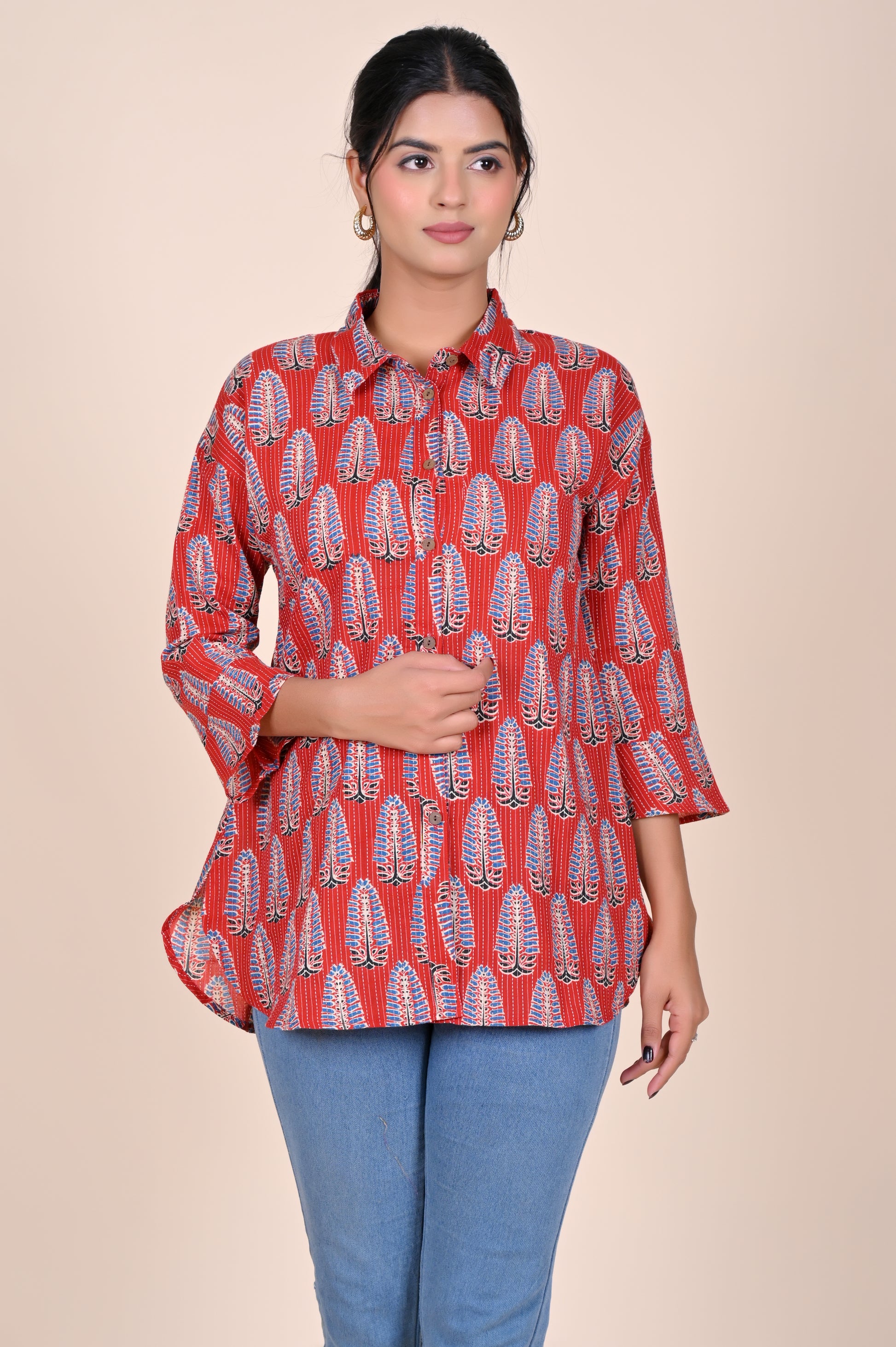 Women's Katha Work Pure Cotton Shirt – Red Azrakh Leaf Buti Design